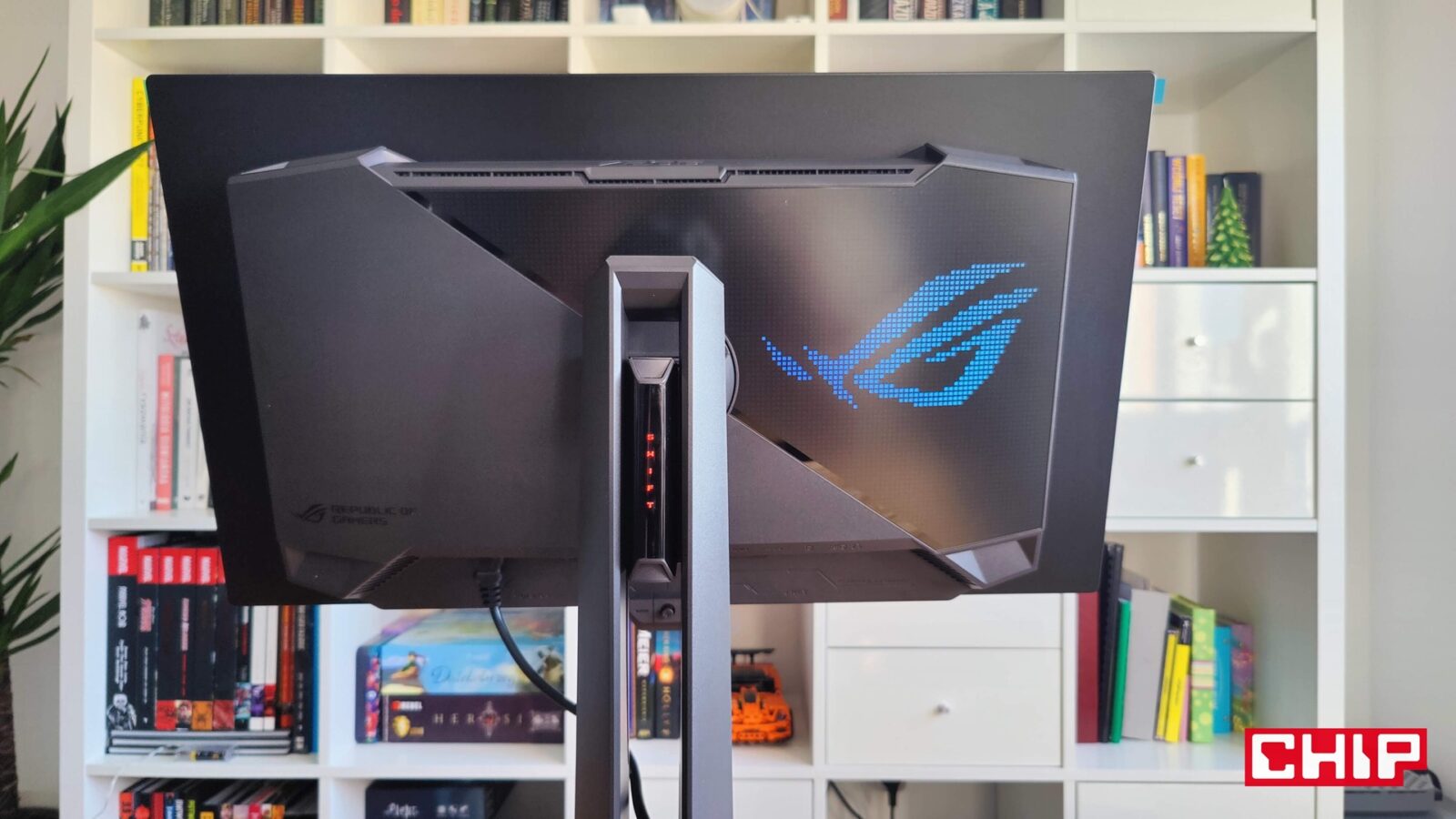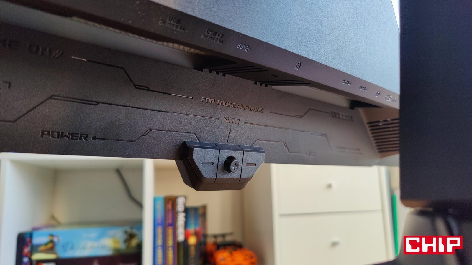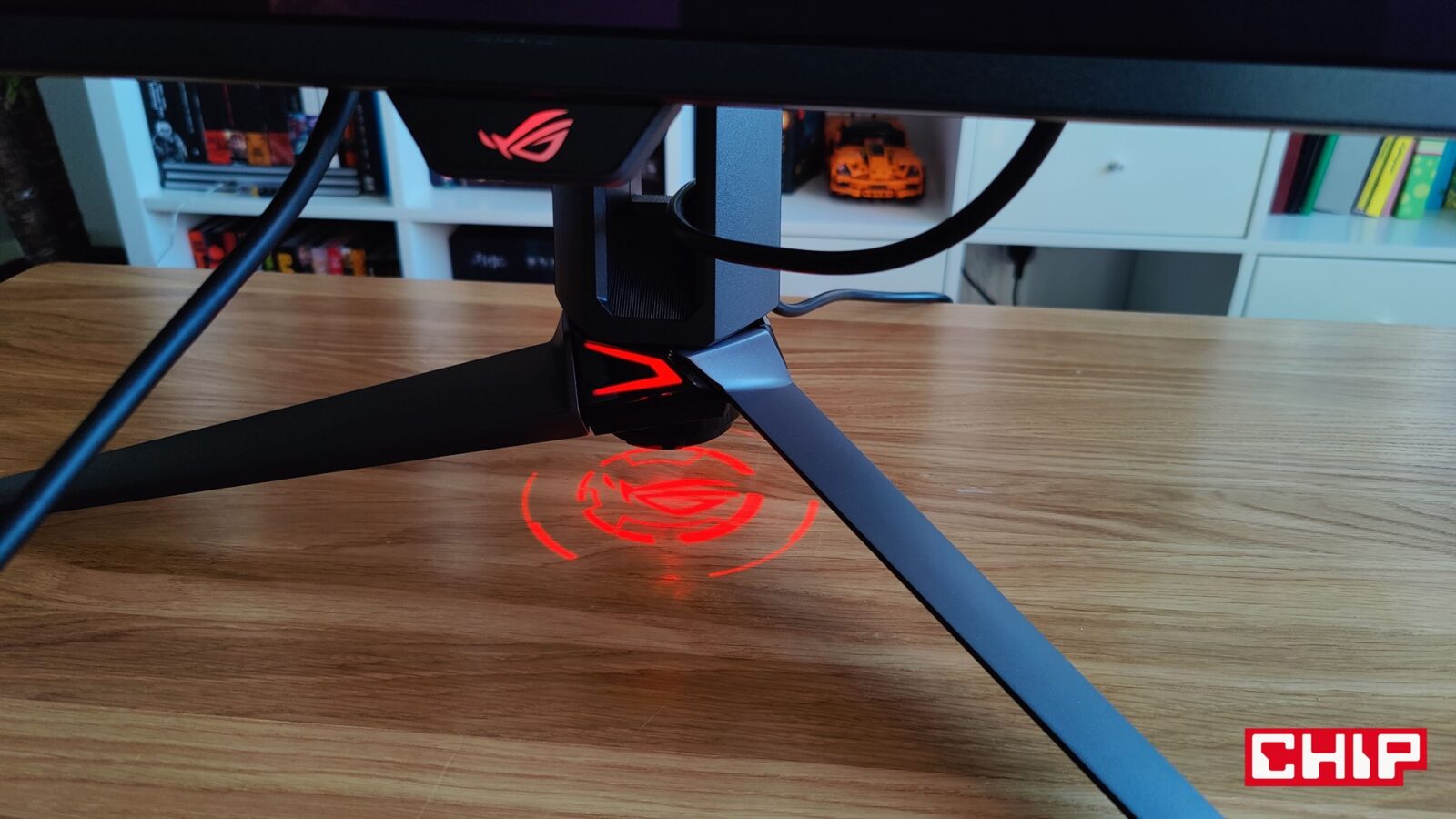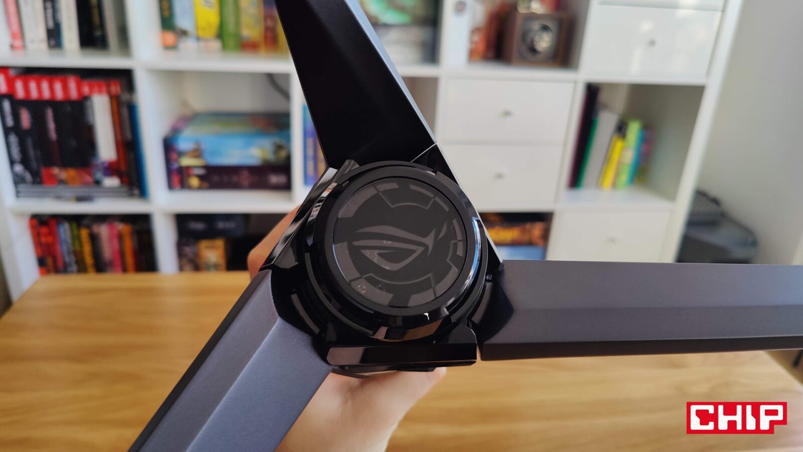 Sam monitor nie jest z kolei najcieńszym modelem, którego mogliście zobaczyć w swoim życiu – od tyłu wygląda, jak połączenie cieniutkiego panelu z wielką, bo grubą na ponad dwa centymetry obudową na całą elektronikę. Trudno jednak się temu dziwić, bo jest napakowany pod kurek w zaawansowaną technologię, a tym samym wymaga odpowiednio wydajnego chłodzenia, co przejawia się m.in. w licznych otworach wentylacyjnych. Nie jest to jednak wada, bo w gruncie rzeczy jest to jeden z najlepiej prezentujących się monitorów “od tyłu”, z jakimi miałem do czynienia, a wielkie podświetlane logo producenta (zbudowane z małych kwadracików i obsługujące Aura Sync) tylko dodaje temu modelowi odpowiedniego charakteru.