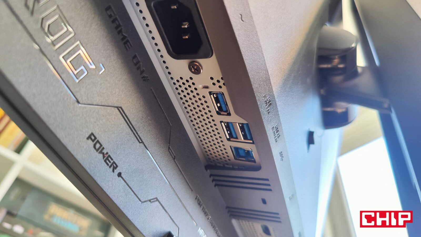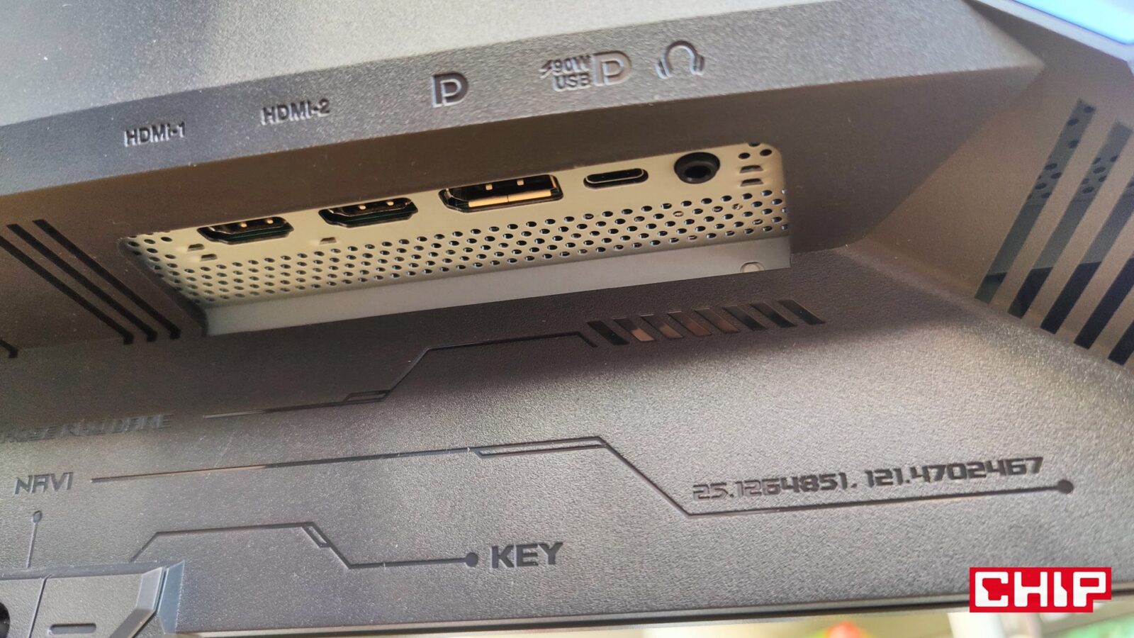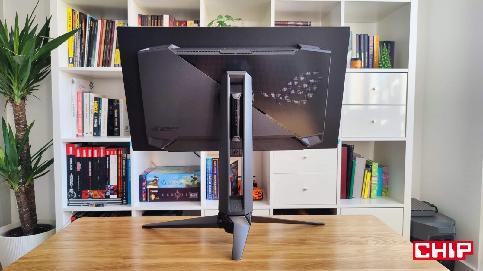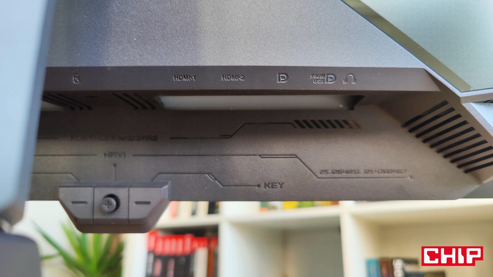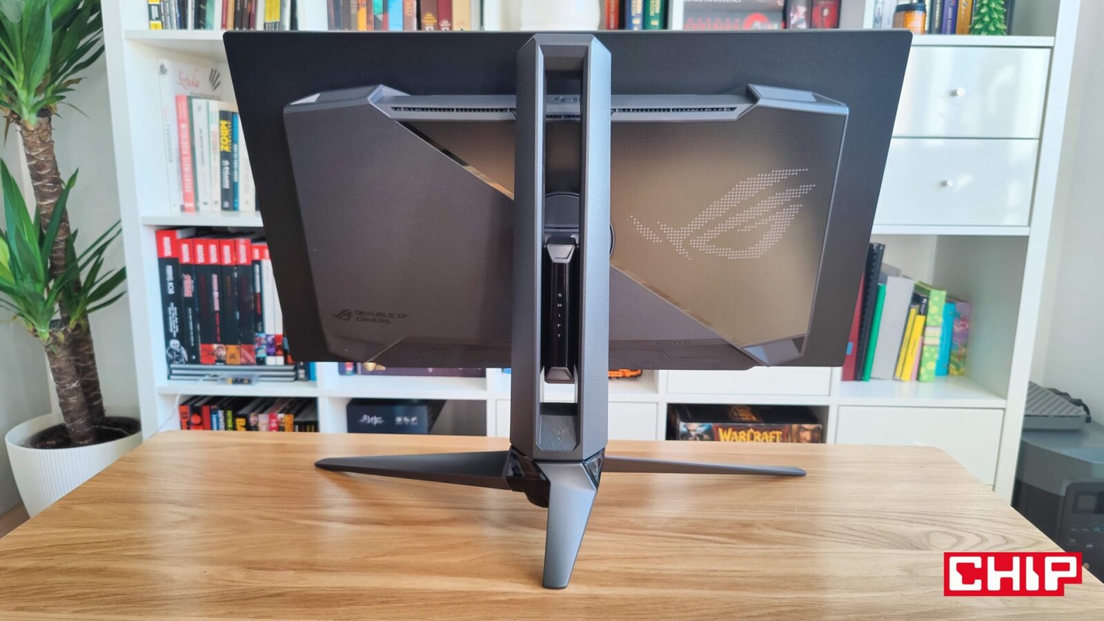 Sam monitor nie jest z kolei najcieńszym modelem, którego mogliście zobaczyć w swoim życiu – od tyłu wygląda, jak połączenie cieniutkiego panelu z wielką, bo grubą na ponad dwa centymetry obudową na całą elektronikę. Trudno jednak się temu dziwić, bo jest napakowany pod kurek w zaawansowaną technologię, a tym samym wymaga odpowiednio wydajnego chłodzenia, co przejawia się m.in. w licznych otworach wentylacyjnych. Nie jest to jednak wada, bo w gruncie rzeczy jest to jeden z najlepiej prezentujących się monitorów “od tyłu”, z jakimi miałem do czynienia, a wielkie podświetlane logo producenta (zbudowane z małych kwadracików i obsługujące Aura Sync) tylko dodaje temu modelowi odpowiedniego charakteru.