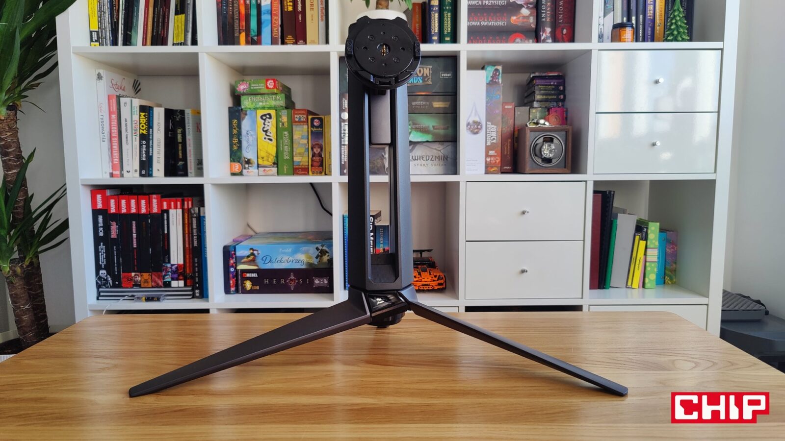 Chociaż testy monitorów przeprowadzam zwykle po ich montażu na ramieniu na stanowisku, dla modelu ASUS ROG Swift OLED PG27UCDM zrobiłem wyjątek i przystałem przy dołączonej podstawce. Nie bez powodu, bo ta jest akurat na tyle zaawansowana, że po prostu na to zasługuje… ale nadal nie jest na tyle wysoka, żeby mogła zastąpić ramię. Wie o tym nawet producent, bo jeśli spojrzycie na stronę produktu, to i na niej monitor jest prezentowany na stanowisku ze specjalnym podwyższeniem na biurku. Umówmy się jednak – kto ma aż tak rozległą monitorową podstawkę na biurku? Około 2,65-kilogramowa metalowa podstawa została wprawdzie odchudzona, ale i tak nadal jest ogromna (54 x ~26 cm) i zajmuje sporą część biurka, więc zdominuje co mniejszy blat. Jeśli jednak macie odpowiednie stanowisko z podstawką na monitor, to podstawkę tego typu ewidentnie docenicie.