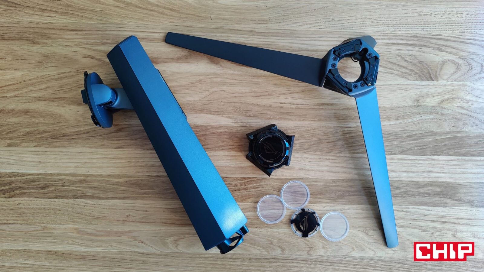 Docenić trzeba też dołączoną podstawkę, której wprawdzie brakuje tych kilkudziesięciu milimetrów do wysokości idealnej pod kątem ergonomii, ale jest na tyle zaawansowana, że warto dla niej rozbudować swoje stanowisko o stosowną “półeczkę-podstawkę”. Oczywiście o ile nie macie już stosownego ramienia, bo wtedy lepiej postawić właśnie na nie i machnąć ręką na efektowne podświetlenie. Ergonomia jest po prostu ważniejsza.