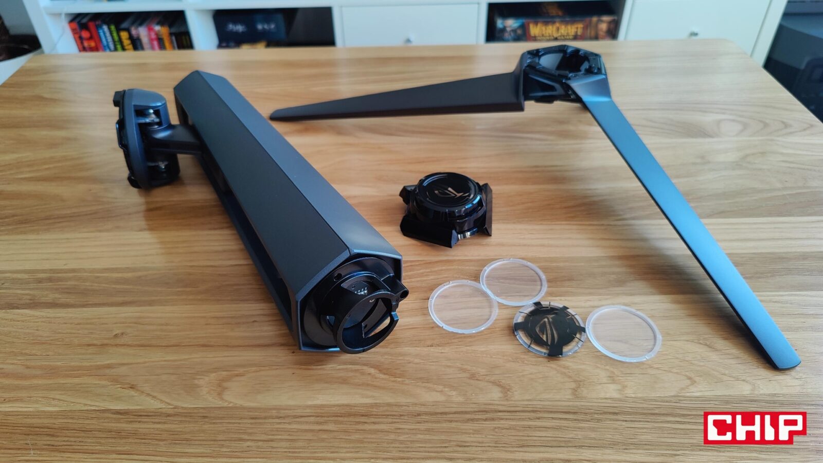 Dla ROG Swift OLED PG27UCDM podstawka to nie tylko coś, co ma trzymać monitor na biurku, ale też jego ozdoba, która na dodatek jest utylitarna. Możemy bowiem poprowadzić przewody przez lukę w jej wieży, rozświetlić stanowisko gamingową czerwienią (podświetlane jest zarówno centrum podstawy, jak i wózek na monitor) i nawet dowolnego rodzaju logo (o ile nakleicie jakiś wzór lub namalujecie coś na dołączonych soczewkach np. czarnym markerem), a na dodatek wkręcić w szczyt samej wieży uchwyt na lampę doświetlającą z racji obecności gwintu ¼ cala. Poza tym możecie też oczywiście liczyć na szeroki zakres dostosowywania pozycji monitora, bo obejmuj regulację wysokości (0-110 mm), obracanie monitora nawet do pozycji pionowej (funkcja pivot), dostosowywania wychylenia góra-dół (od 20 do -5 stopni) oraz tego na boki (od 30 do -30). Jedyne, czego w takiej podstawce brakuje, to większej dbałości o miejsce na biurku oraz dosłownie 20-30 dodatkowych centymetrów maksymalnej wysokości, aby zagwarantować idealną pozycję na biurku.