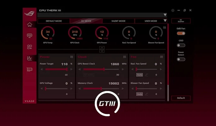 Tym, co jeszcze wyróżnia się na tle innych kart i co jest godne sprawdzenia w tym modelu, to oprogramowanie GPU Tweak III. Według opisów predefiniowane tryby ASUS pozwalają zwiększyć moc karty lub zmniejszyć hałas jednym kliknięciem, a dodatkowo można ustawić własne profile dla każdej gry. Dodatkowo ten program umożliwia połączenie się z GPU Tweak za pośrednictwem telefonu lub innego zdalnego urządzenia w celu monitorowania GPU bez dodawania nakładek na rozgrywkę. Brzmi to świetnie, szczególnie kiedy chcemy sobie poeksperymentować obrotami w trakcie gry. Jestem też ciekaw, jak dzięki temu będzie wyglądał overclocking.