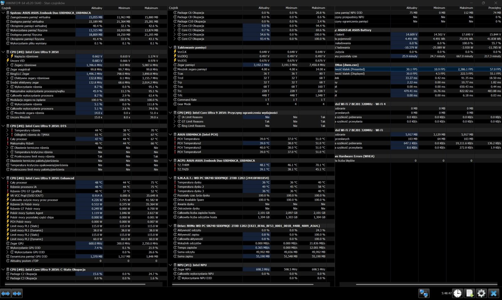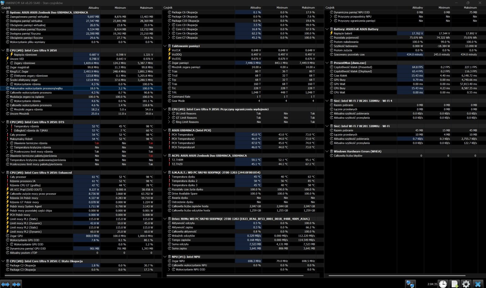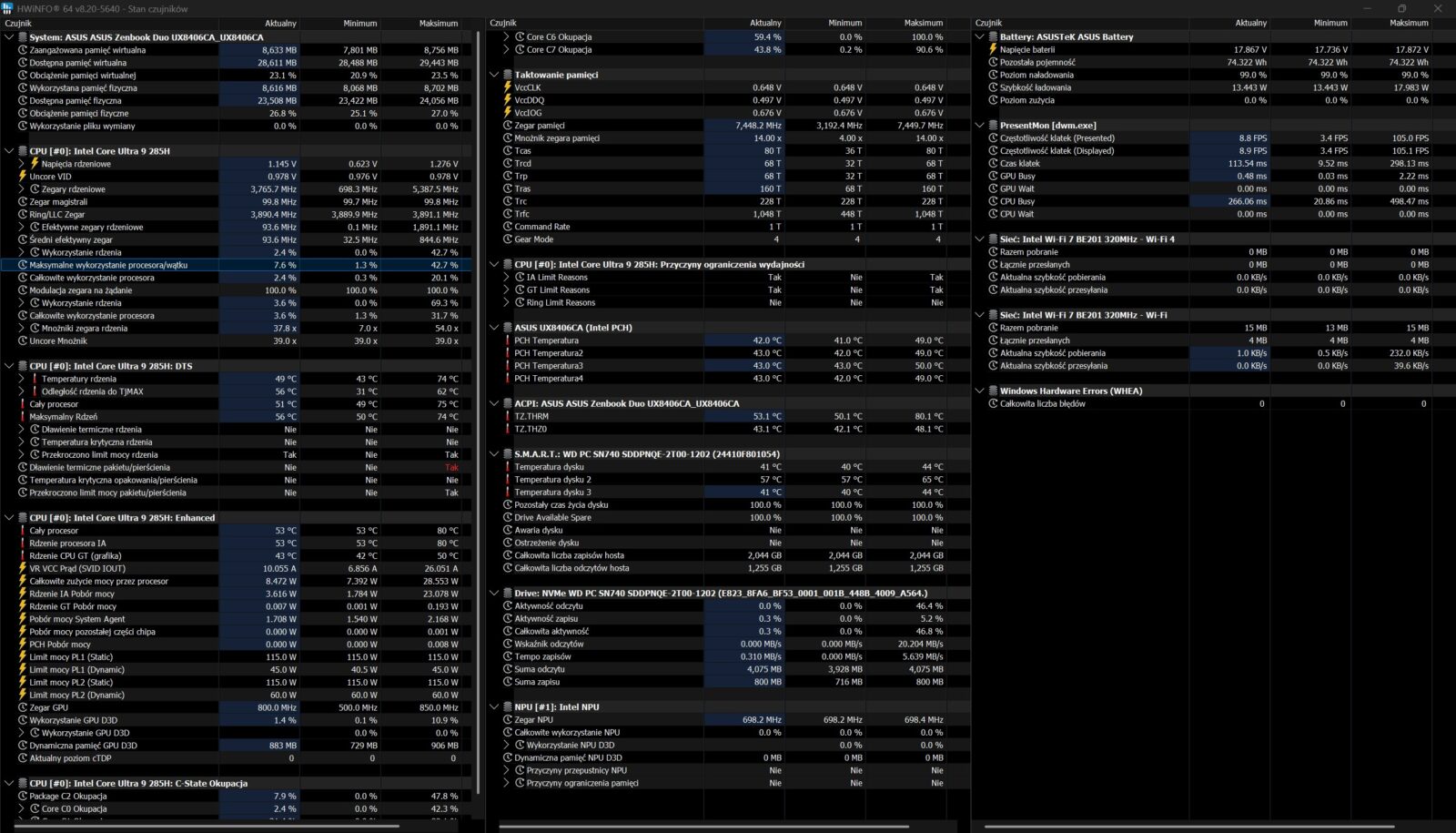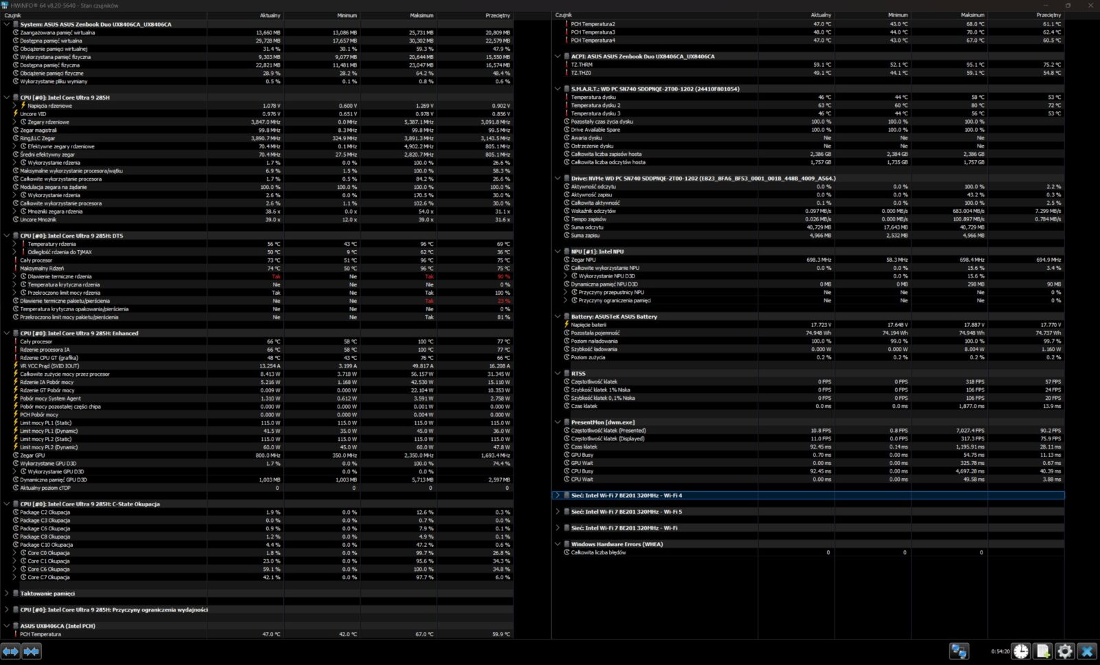 Jeśli rzucicie okiem na poniższe odczyty w oprogramowaniu HWInfo, to powinny zainteresować was trzy pomiary, bo taktowania, temperatury oraz pobór mocy, którym może pochwalić się procesor. Jeśli idzie o to ostatnie, największy odnotowany pobór mocy miał miejsce w teście Cinebench, kiedy to Intel Core Ultra 9 285H pożarł prawie 64 waty i rozkręcił się w szczycie do 5387,7 MHz. W grach procesor również dobijał do takiego taktowania, ale był już mniej skory do pożerania ponad 60-watów energii, choć w tym samym momencie angażował znacznie swój procesor graficzny, który bez problemu pracował z taktowaniem 2350 MHz. W obu przypadkach dochodziło rzecz jasna do thermal-throttlingu, czyli automatycznego zbijania wydajności procesora w celu jego ochłodzenia. W trybie Iddle z kolei procesor pobierał maksymalnie 28,5 watów, a jego temperatura oscylowała na poziomie około 50 stopni Celsjusza przy praktycznie niesłyszalnym hałasie wentylatorów.