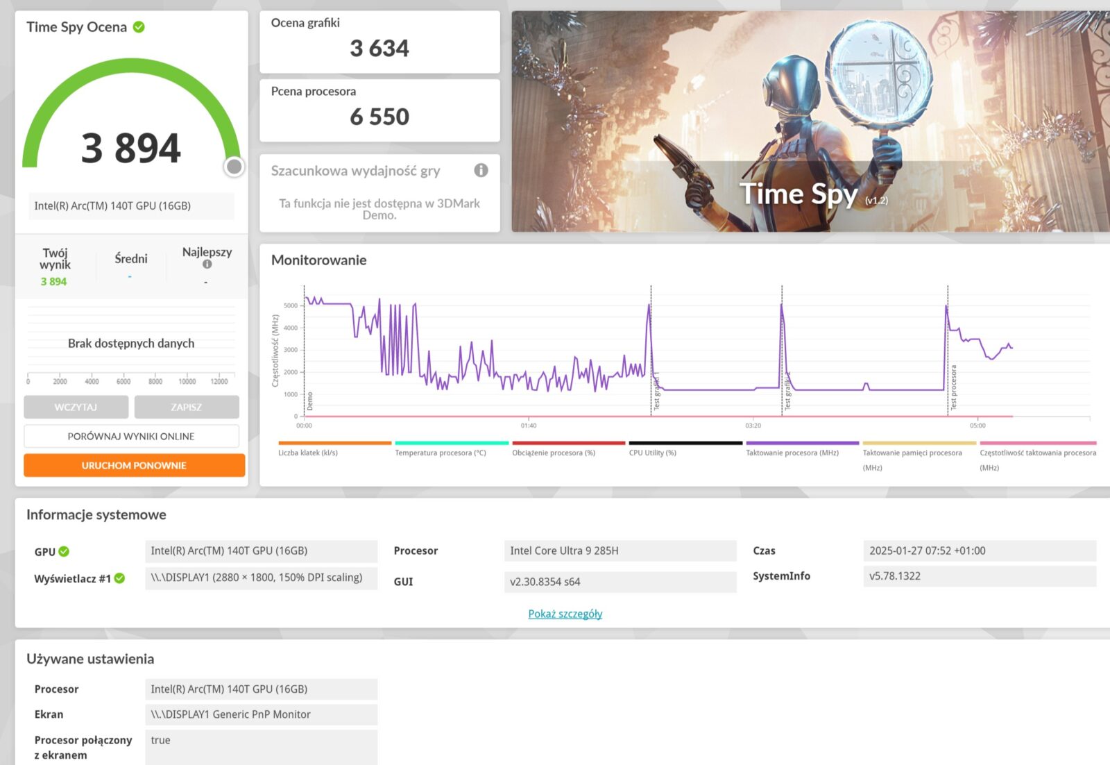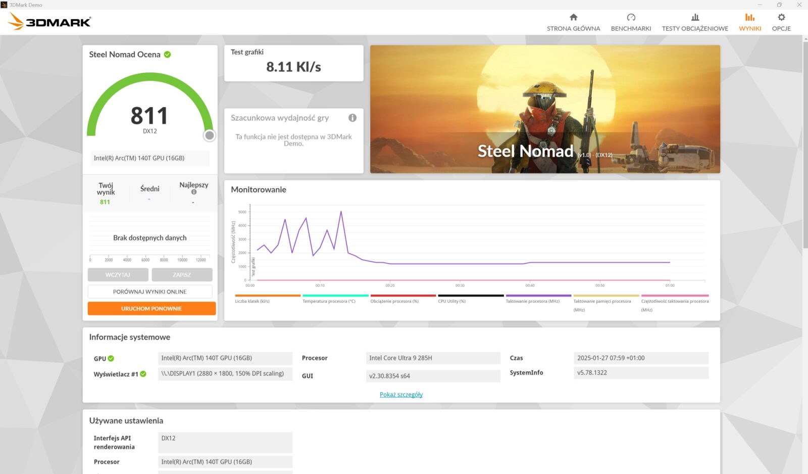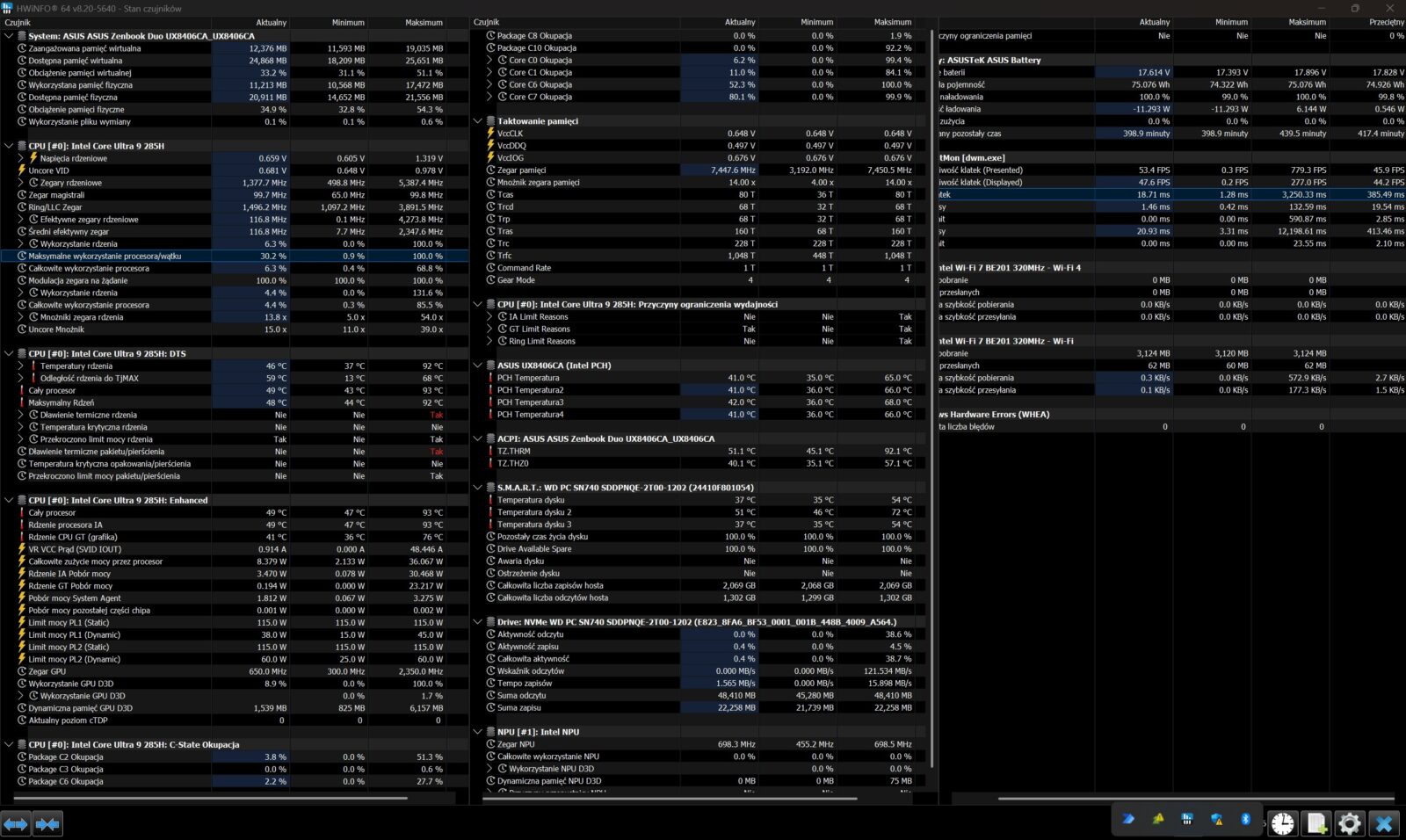 Jeśli rzucicie okiem na poniższe odczyty w oprogramowaniu HWInfo, to powinny zainteresować was trzy pomiary, bo taktowania, temperatury oraz pobór mocy, którym może pochwalić się procesor. Jeśli idzie o to ostatnie, największy odnotowany pobór mocy miał miejsce w teście Cinebench, kiedy to Intel Core Ultra 9 285H pożarł prawie 64 waty i rozkręcił się w szczycie do 5387,7 MHz. W grach procesor również dobijał do takiego taktowania, ale był już mniej skory do pożerania ponad 60-watów energii, choć w tym samym momencie angażował znacznie swój procesor graficzny, który bez problemu pracował z taktowaniem 2350 MHz. W obu przypadkach dochodziło rzecz jasna do thermal-throttlingu, czyli automatycznego zbijania wydajności procesora w celu jego ochłodzenia. W trybie Iddle z kolei procesor pobierał maksymalnie 28,5 watów, a jego temperatura oscylowała na poziomie około 50 stopni Celsjusza przy praktycznie niesłyszalnym hałasie wentylatorów.