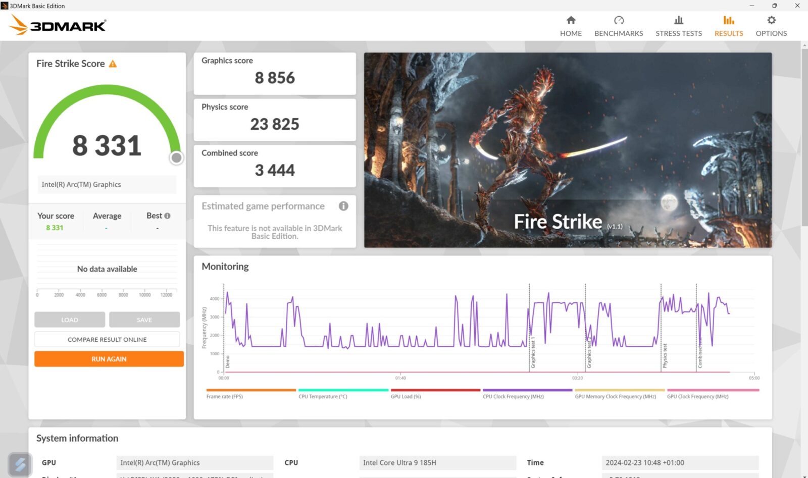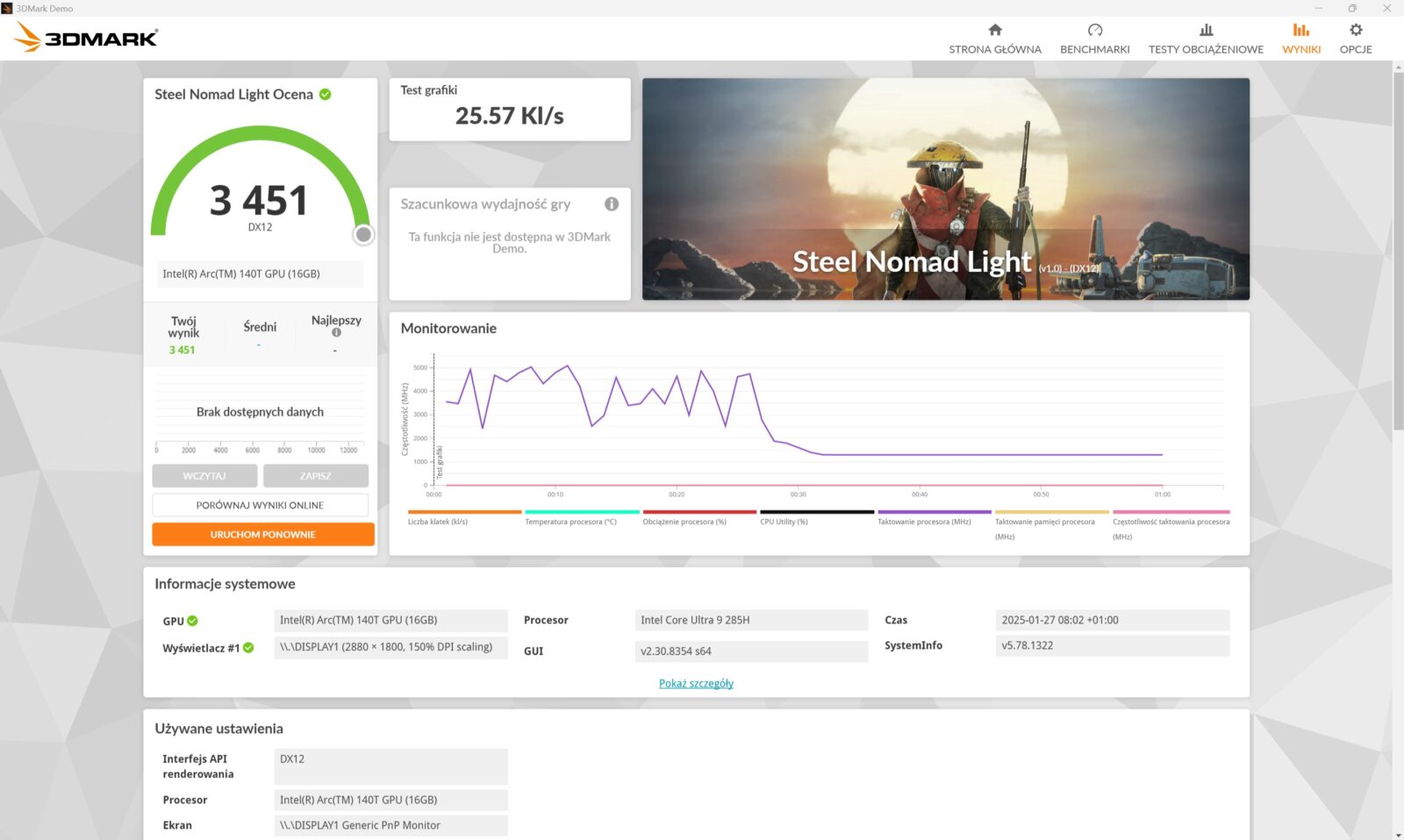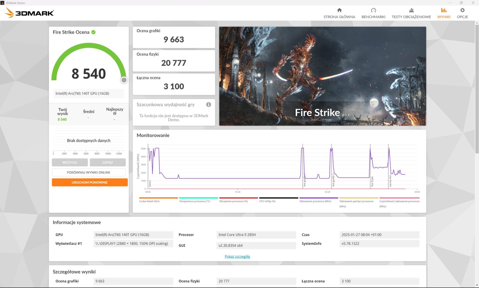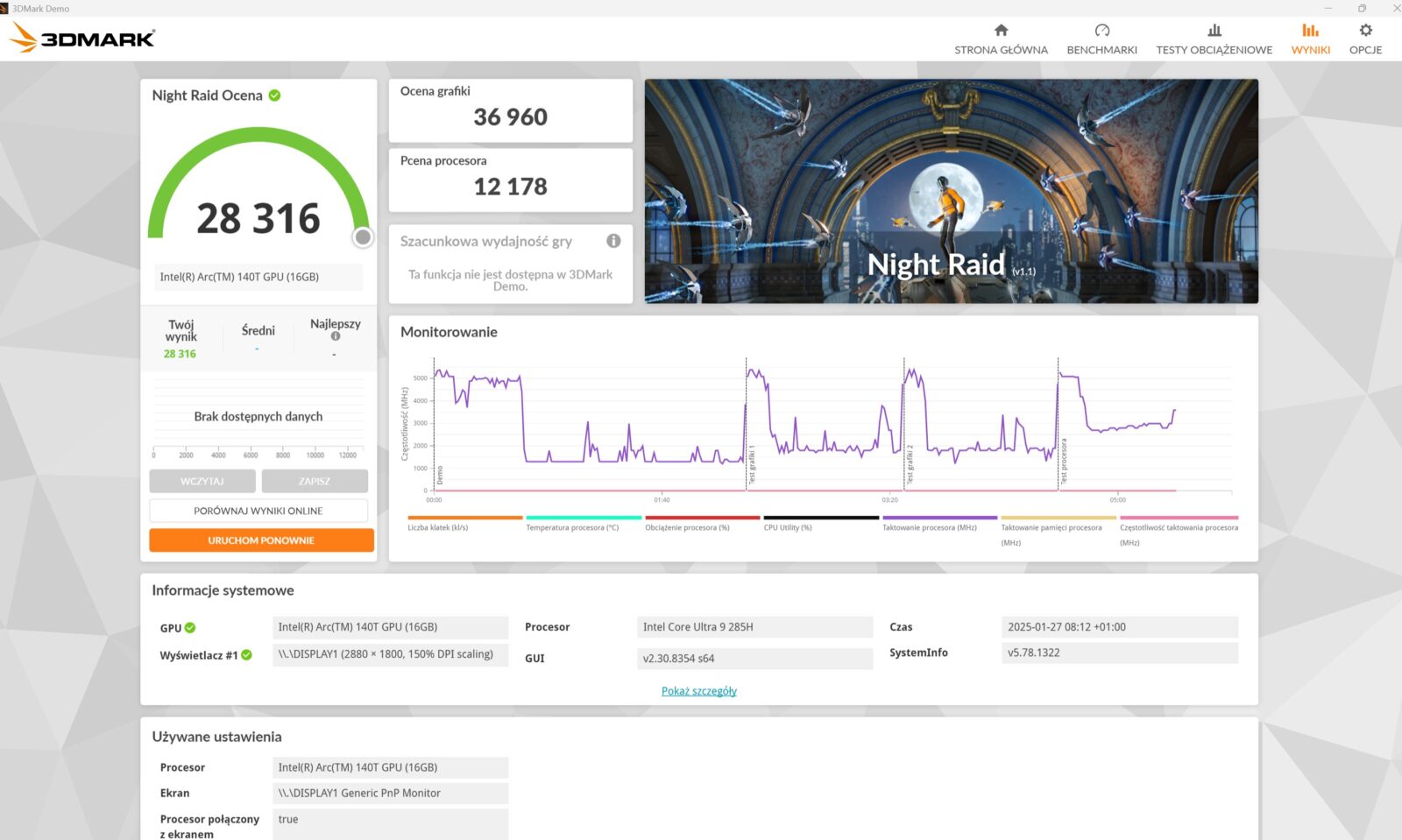 Jeśli rzucicie okiem na poniższe odczyty w oprogramowaniu HWInfo, to powinny zainteresować was trzy pomiary, bo taktowania, temperatury oraz pobór mocy, którym może pochwalić się procesor. Jeśli idzie o to ostatnie, największy odnotowany pobór mocy miał miejsce w teście Cinebench, kiedy to Intel Core Ultra 9 285H pożarł prawie 64 waty i rozkręcił się w szczycie do 5387,7 MHz. W grach procesor również dobijał do takiego taktowania, ale był już mniej skory do pożerania ponad 60-watów energii, choć w tym samym momencie angażował znacznie swój procesor graficzny, który bez problemu pracował z taktowaniem 2350 MHz. W obu przypadkach dochodziło rzecz jasna do thermal-throttlingu, czyli automatycznego zbijania wydajności procesora w celu jego ochłodzenia. W trybie Iddle z kolei procesor pobierał maksymalnie 28,5 watów, a jego temperatura oscylowała na poziomie około 50 stopni Celsjusza przy praktycznie niesłyszalnym hałasie wentylatorów.
