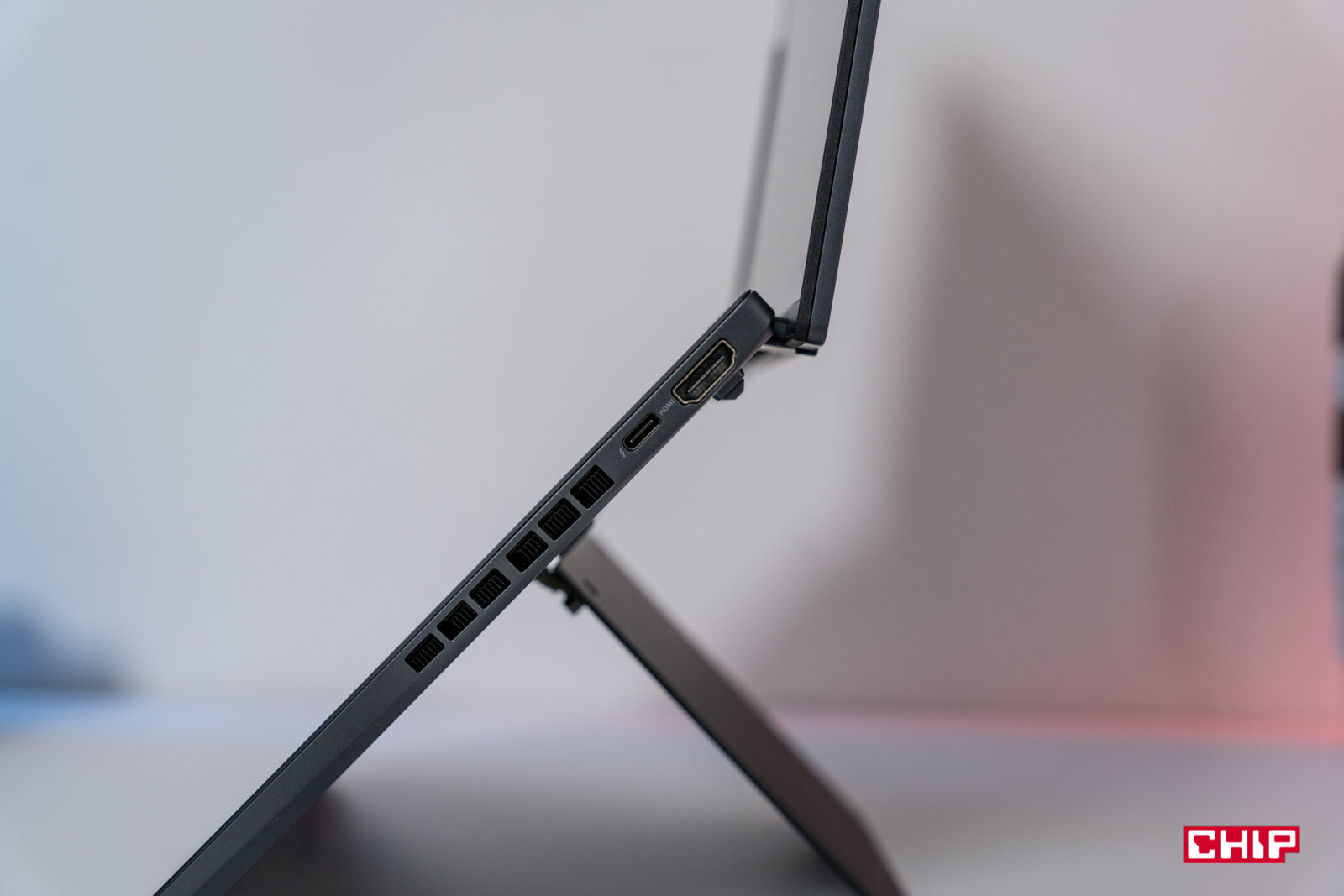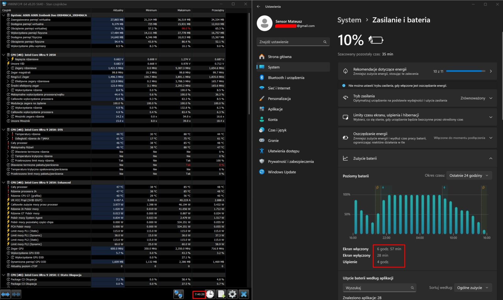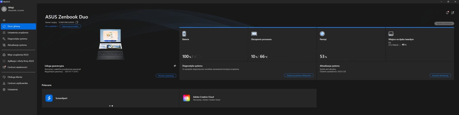 Największa obawa w tego typu sprzętach sprowadza się najczęściej do wytrzymałości na jednym ładowaniu, ale tak się składa, że Zenbook Duo UX8406CA nie rozczarowuje w tej kwestii, umożliwiając typowo biurową pracę przez nawet blisko 8 godzin na jednym i do 6 godzin na dwóch aktywnych ekranach jednocześnie. Oczywiście wiele zależy od tego, jakich dokładnie aplikacji używacie, bo jeśli rzucicie się np. w wir grania lub programowania w Unity czy Unreal Engine, ten czas skróci się nawet dwukrotnie. Jest to jednak i tak świetny wynik, bo pamiętajmy, że w grę wchodzą aż dwa ekrany OLED o rozdzielczości 2880 × 1800 pikseli, 120-Hz odświeżaniu i szczytowej jasności rzędu 500 nitów przy włączonym HDR i 400 nitów bez tego trybu. Pamiętajmy zresztą, że z racji odblaskowej natury ekranu, jasność obu wyświetlaczy najczęściej jest ustawiana nie poniżej, a grubo powyżej 50 procent, więc wbudowany akumulator rzeczywiście nie ma zbyt lekko.