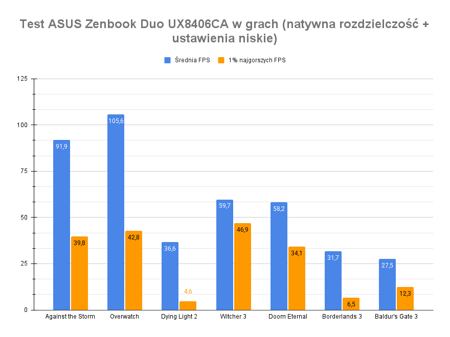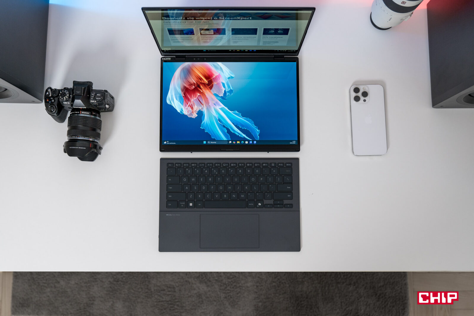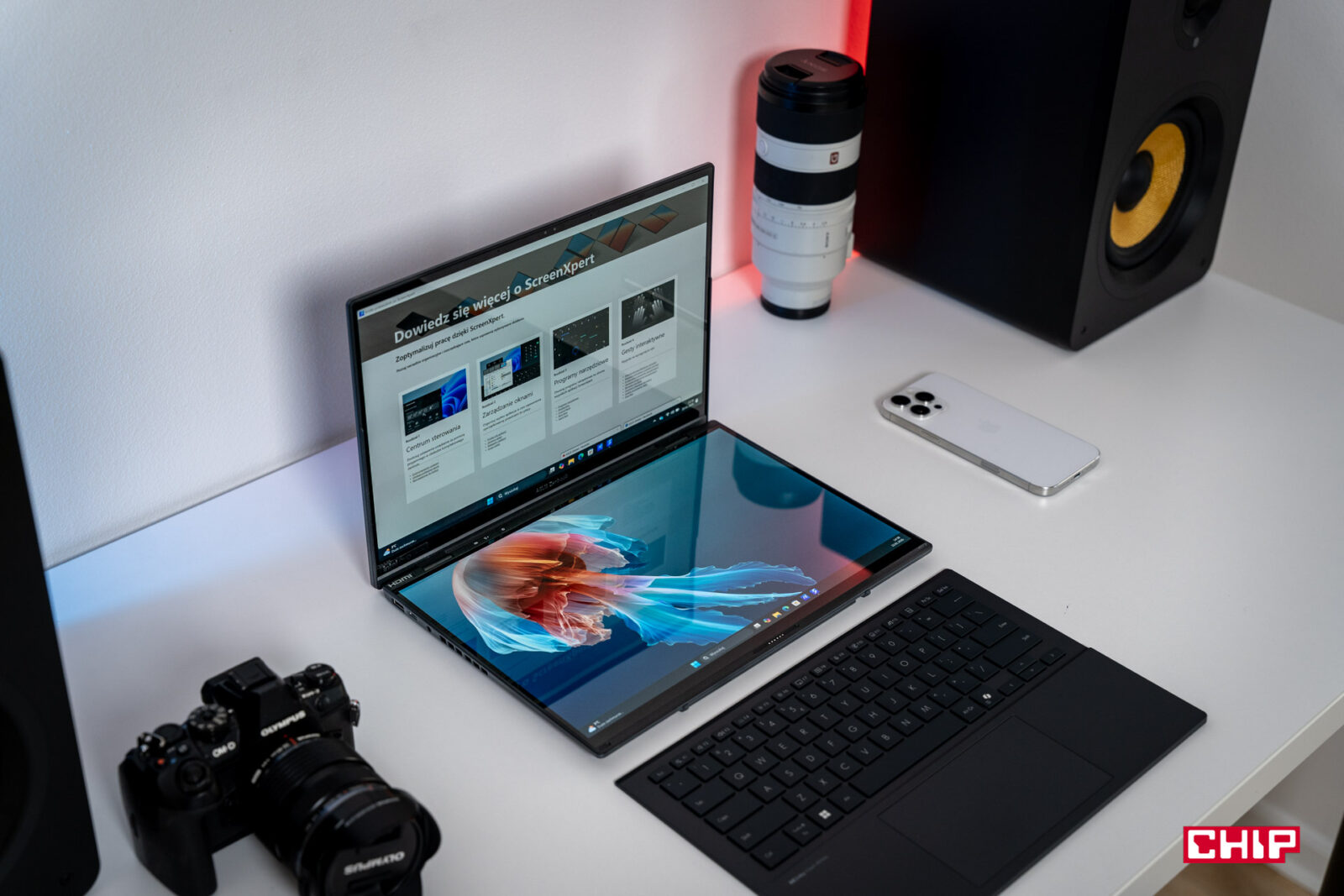 W ogólnym więc rozrachunku Zenbook Duo UX8406CA jest tym, czego rzeczywiście oczekiwałem po następcy pierwowzoru, którego wydajność nie była zbyt powalająca. Liczyłem wprawdzie na coś więcej, niż tylko zupełnie nowy i zdecydowanie lepszy procesor, bo głośniki nadal nie powalają jakością brzmienia, ale za to możecie liczyć na obsługę Wi-Fi 7 z trzema pasmami (2,4/5/6 GHz) za pośrednictwem dwóch anten nadawczych i dwóch odbiorczych oraz łączność Bluetooth 5.4. Jednak to właśnie Intel Core Ultra nowej generacji robi w tym sprzęcie robotę, bo po prostu jest jedynym znaczącym ulepszeniem. Nie pogracie na nim wprawdzie w najnowsze gry o wysokim zaawansowaniu graficznym, jeśli liczycie nawet na te stałe 30 klatek na sekundę, ale w te starsze już tak i nawet nie będziecie musieli zrzucać rozdzielczości poniżej tą natywną. Umówmy się jednak – tego typu sprzęt jest dedykowany zarówno pracy, jak i konsumowaniu filmów czy seriali, a w tym akurat Zenbook Duo UX8406CA spisuje się fenomenalnie. Dlatego zasługuje na polecenie, choć do tanich sprzętów niestety nie należy.