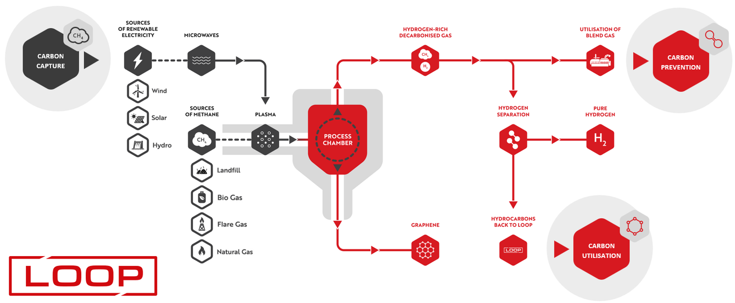 Firma Levidian opracowała jednak rewolucyjny system LOOP, który rozbija metan na podstawowe elementy, a więc nie tylko grafen, ale też paliwo przyszłości w postaci wodoru. Technologia wykorzystuje energię mikrofalową do jonizacji metanu w plazmę, skutecznie oddzielając atomy wodoru od atomów węgla i to bez generowania odpadów i bez użycia wody. W wyniku tego procesu powstaje czysty wodór, który może być wykorzystywany jako niskoemisyjne paliwo oraz właśnie grafen.