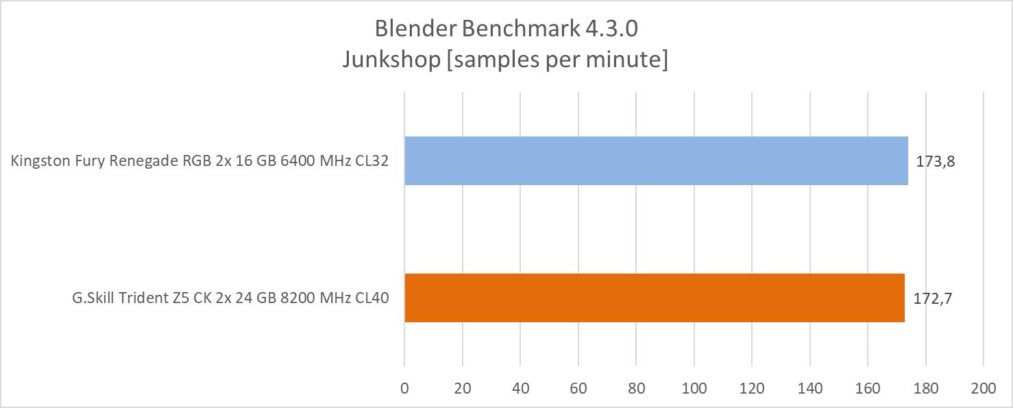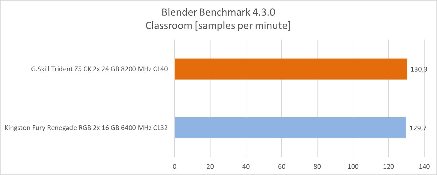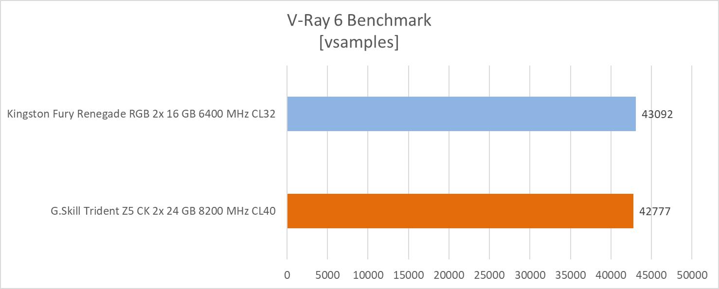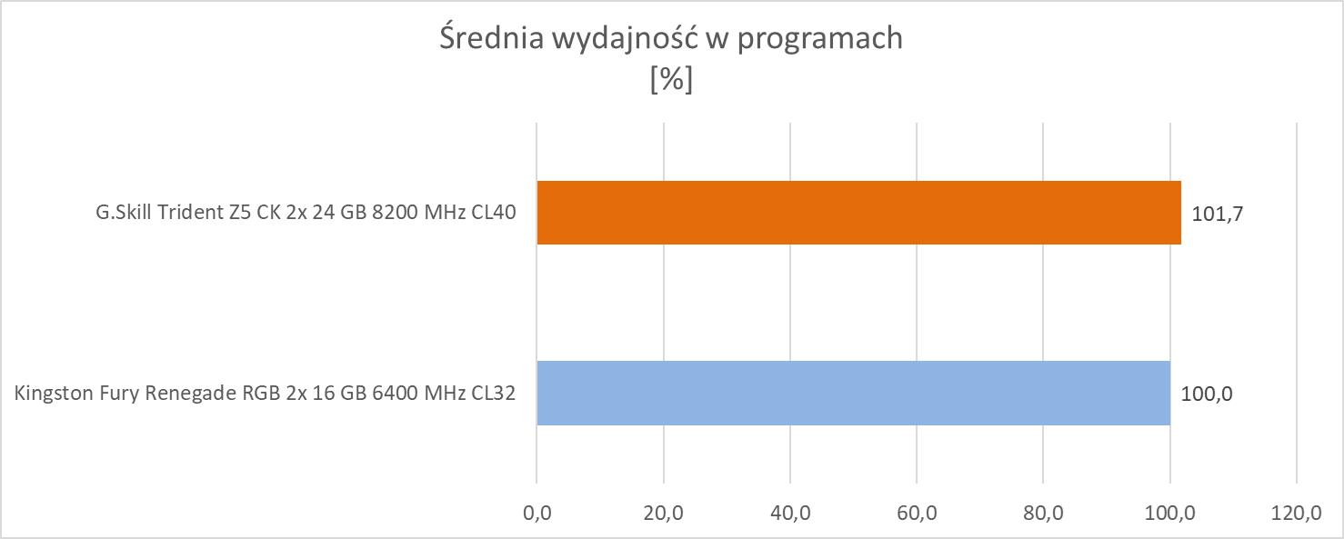 W programach pamięci wypadają średnio o 1,7% lepiej od znacznie wolniejszych, ale o niższych opóźnieniach. Różnice w większości zastosowań są niskie, a w niektórych programach szybsze pamięci potrafią notować minimalnie niższe wyniki – takim przykładek jest V-Ray. Wyższe różnice widzimy choćby w AIDA64. W pozostałych wyniki są bardzo podobne.