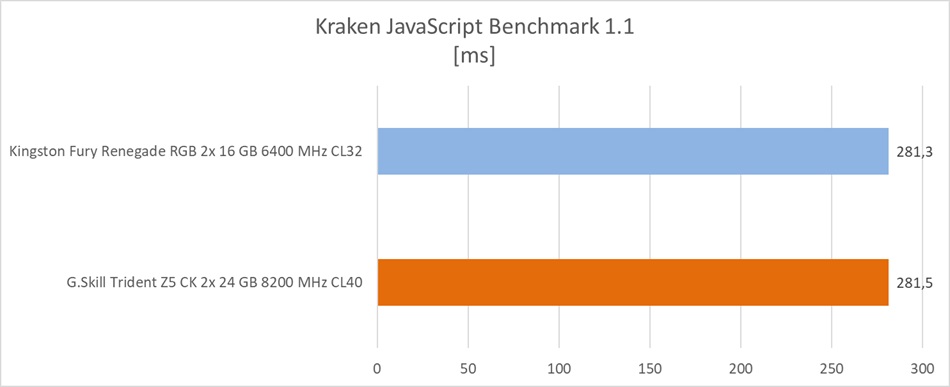 Kolejny benchmark porównuje wydajność w złożonych obliczeniach opartych o JavaScript. Wynik ma kilka różnych składników i podawany jest w milisekundach – interesuje nas całkowity rezultat. W testach wykorzystaliśmy przeglądarkę Vivaldi.