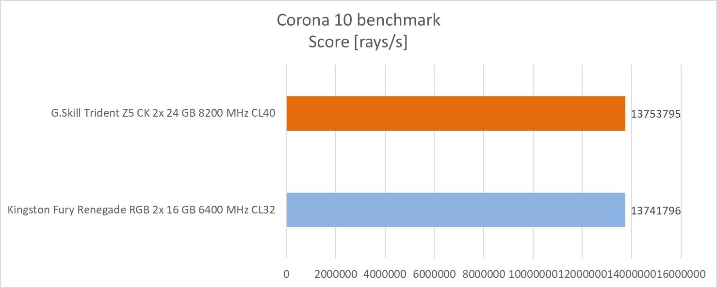 Silnik renderujący Corona dostępny jest Autodesk 3ds Max oraz Cinema 4D. Co ważne, nie wspiera on GPU, więc wydajność CPU jest tutaj kluczowa. W testach skorzystaliśmy z benchmarka przygotowanego przez twórców, który dobrze sprawdza się w praktyce.