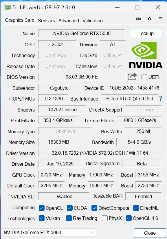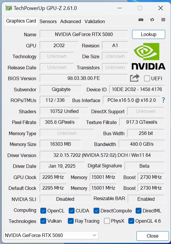 Specyfikacja Gigabyte GeForce RTX 5080 Gaming OC