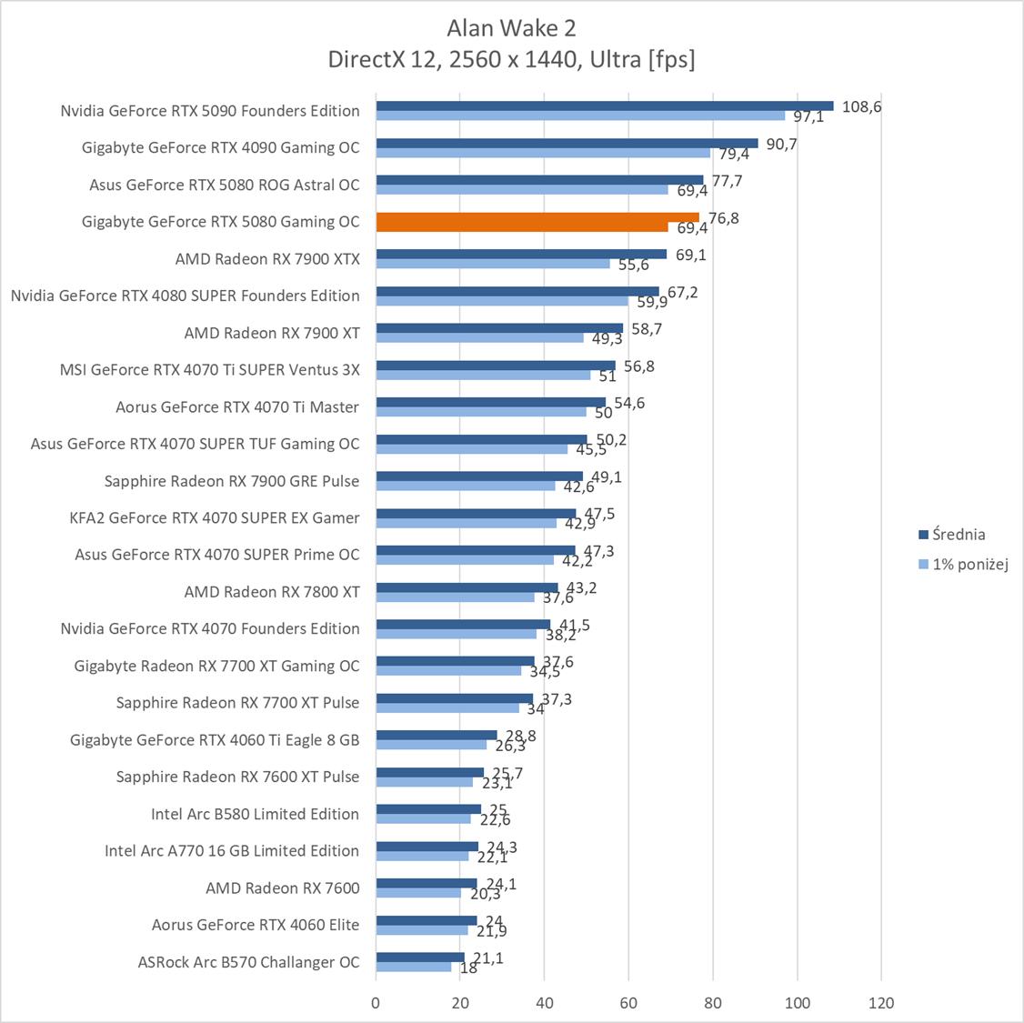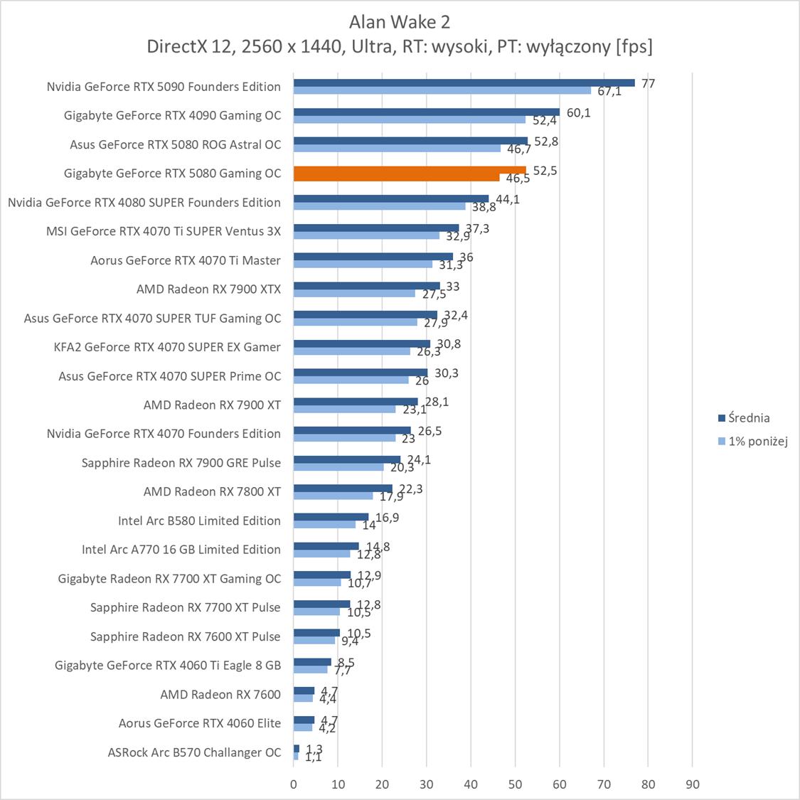 W kolejnej jest jedna gra z wynikiem poniżej 60 fps – Alan Wake 2. Poza tym wyniki pozwalają na płynną rozgrywkę.