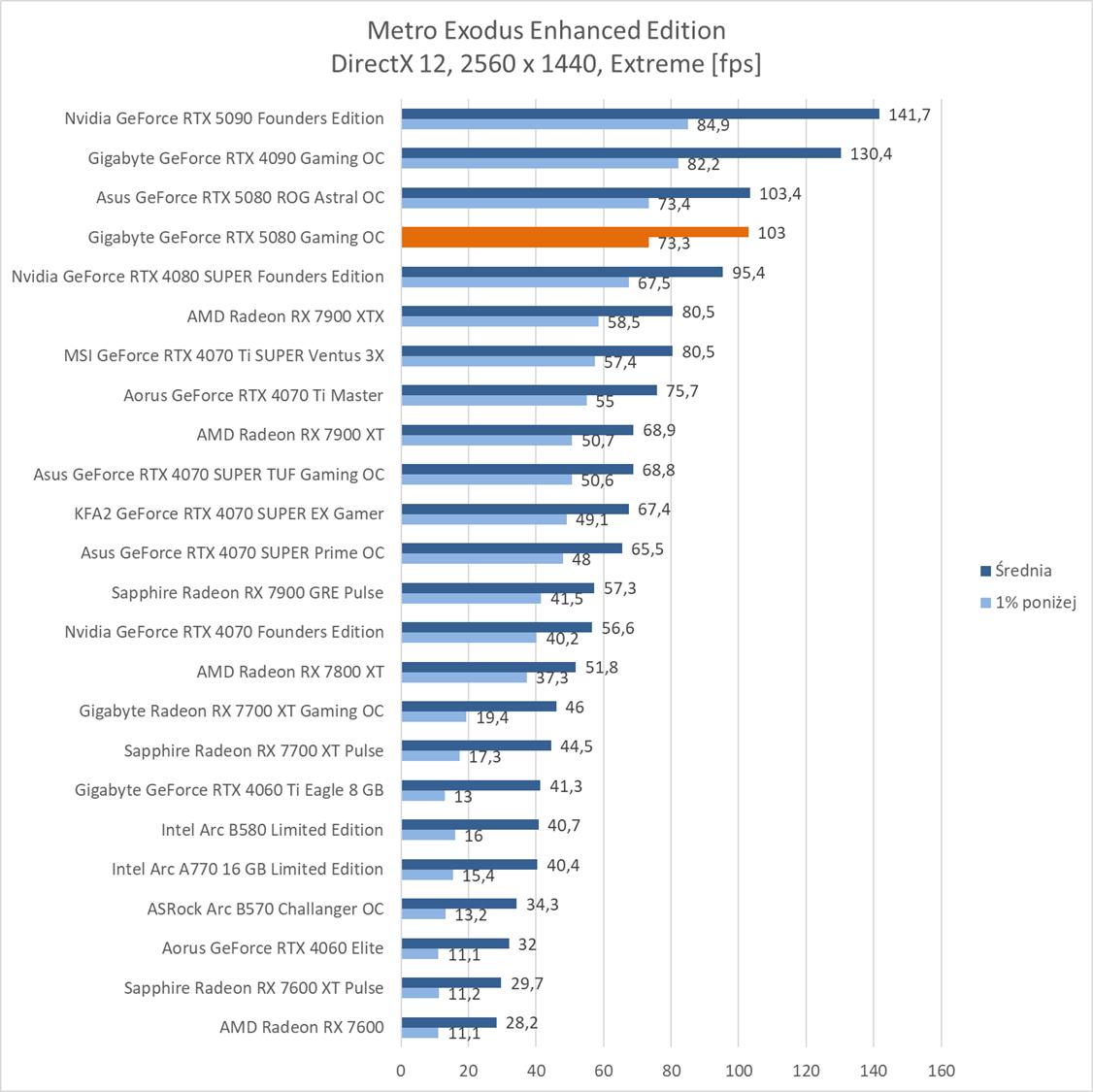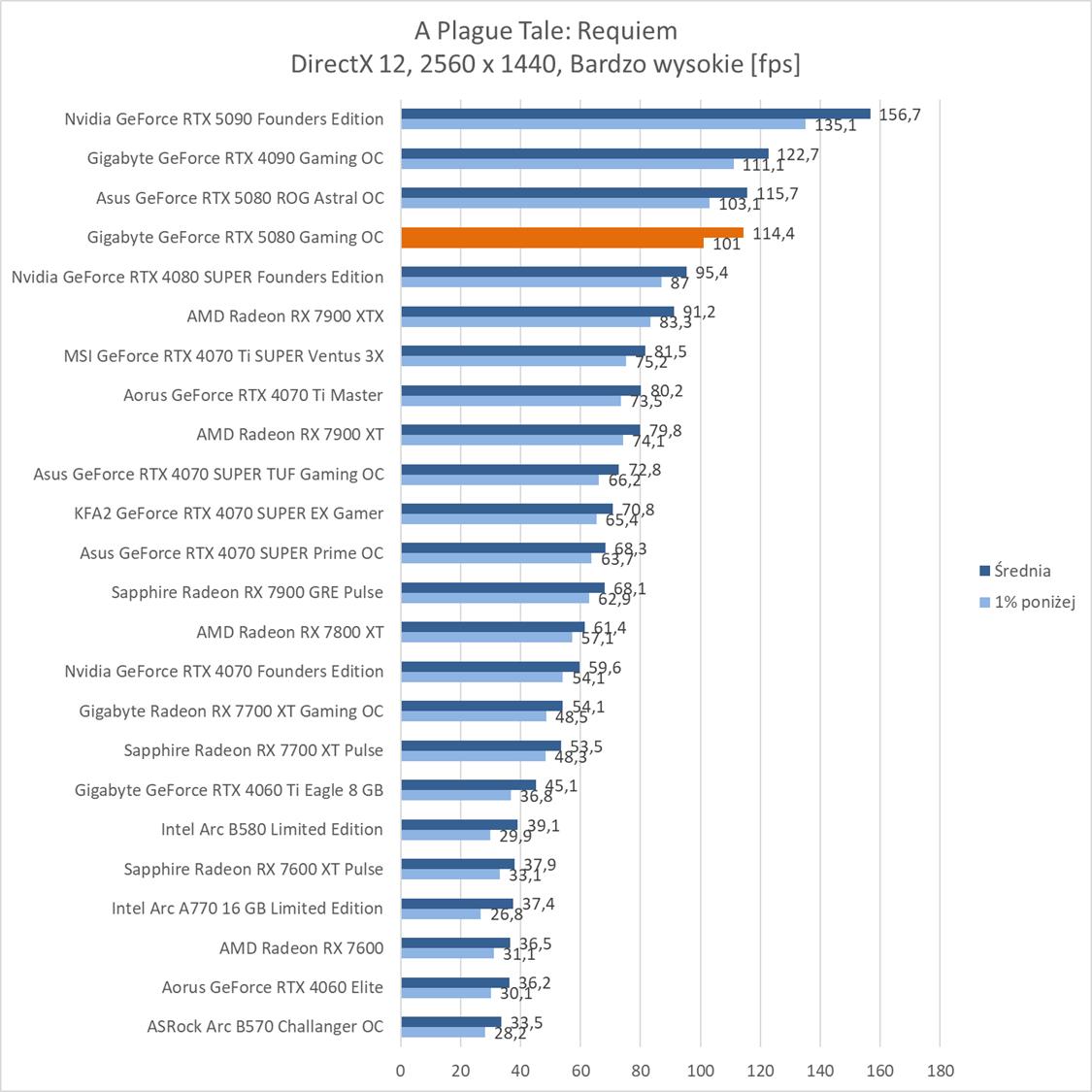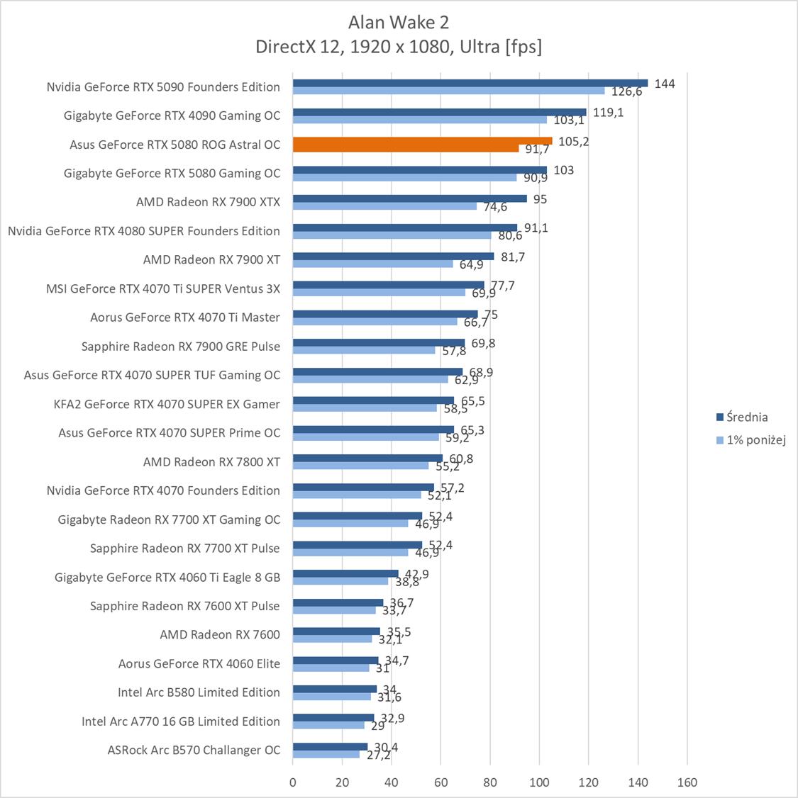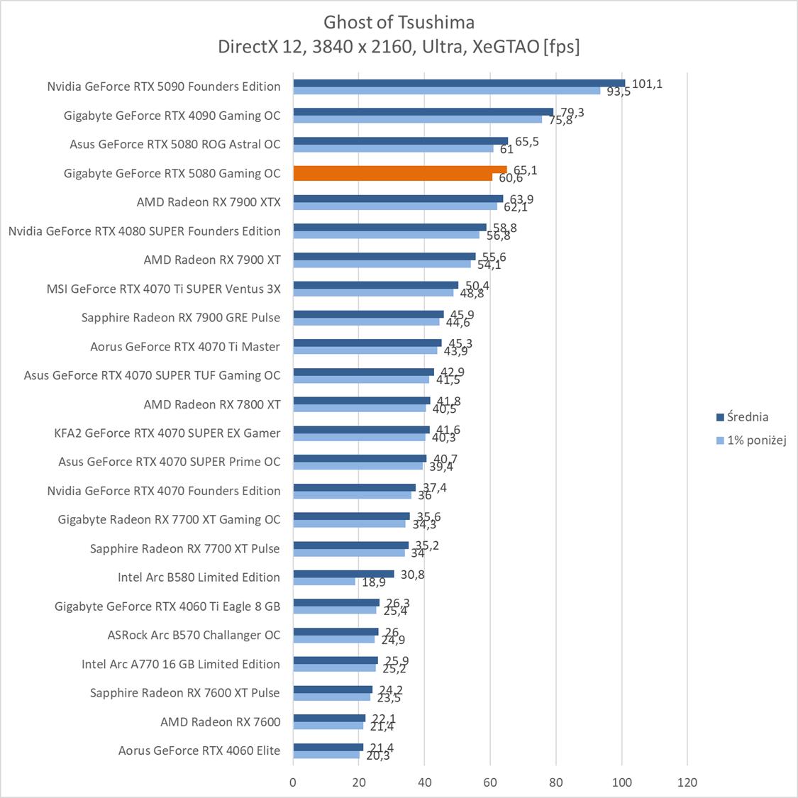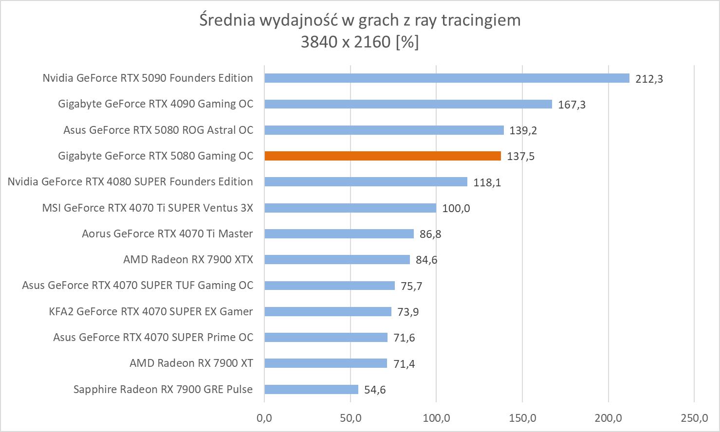 Karta wypada trochę słabiej od wersji Asusa, ale różnice nie są duże. W 3840 x 2160 wynoszą one ok. 1,6%. Mamy też wyniki wyższe od 7900 XTX oraz od RTX 4080 SUPER. W tym drugim przypadku wynoszą one zgodnie z rozdzielczościami ok. 8,5%, 14,8% oraz 19,4%. Nie są to różnice, których oczekiwalibyśmy po grafice kolejnej generacji.
