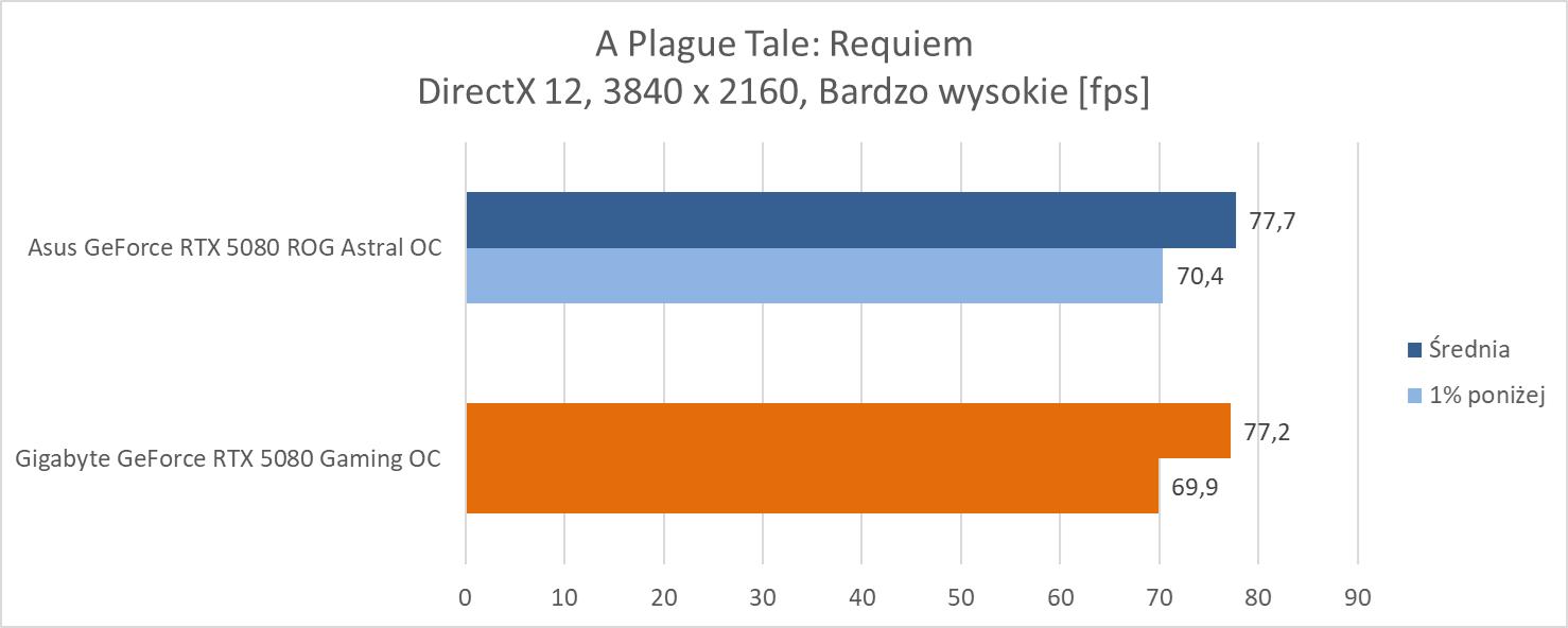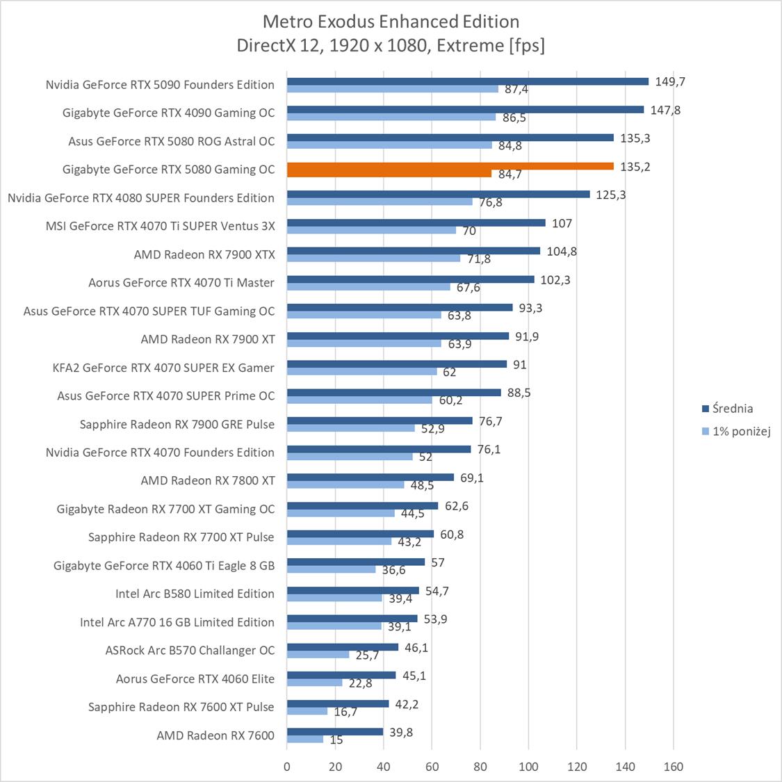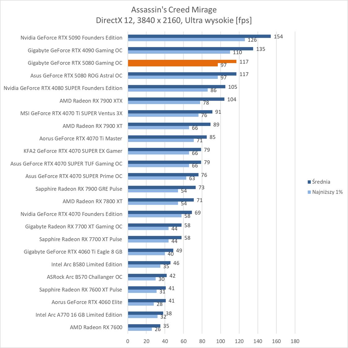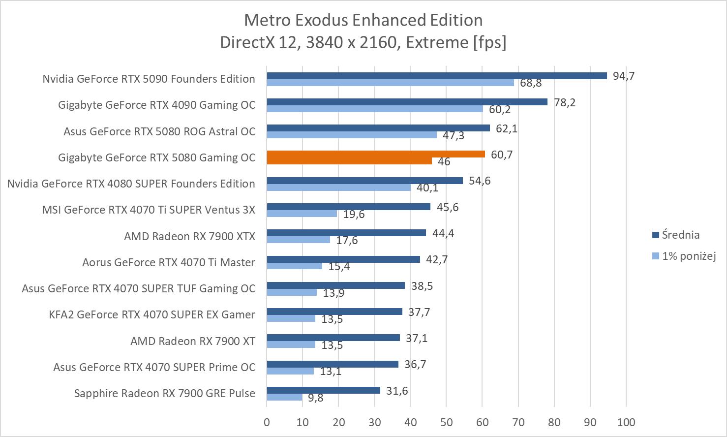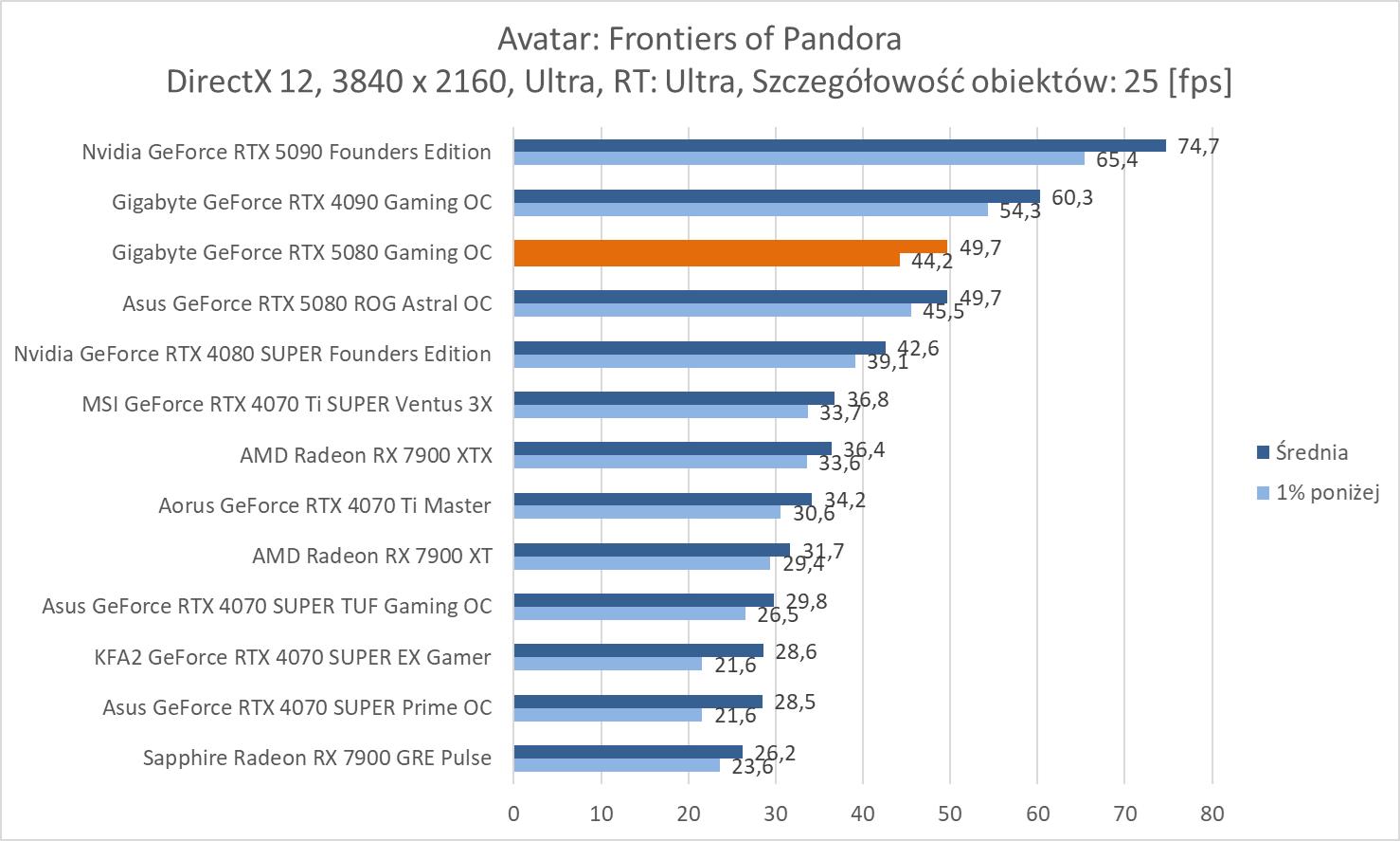 Karta wypada trochę słabiej od wersji Asusa, ale różnice nie są duże. W 3840 x 2160 wynoszą one ok. 1,6%. Mamy też wyniki wyższe od 7900 XTX oraz od RTX 4080 SUPER. W tym drugim przypadku wynoszą one zgodnie z rozdzielczościami ok. 8,5%, 14,8% oraz 19,4%. Nie są to różnice, których oczekiwalibyśmy po grafice kolejnej generacji.