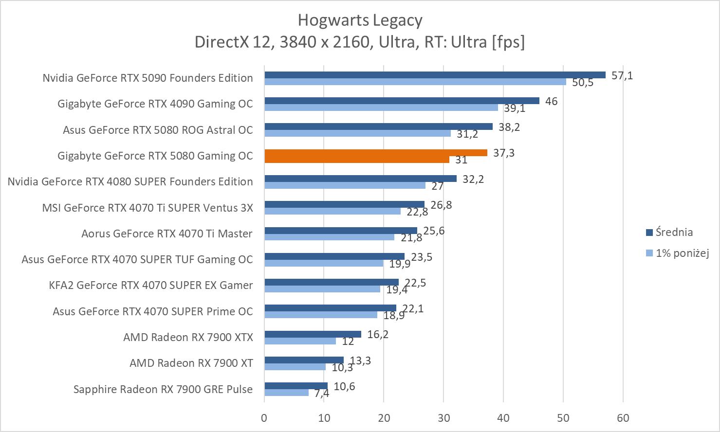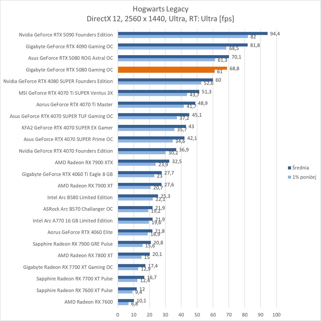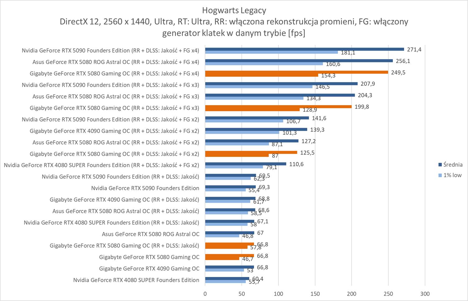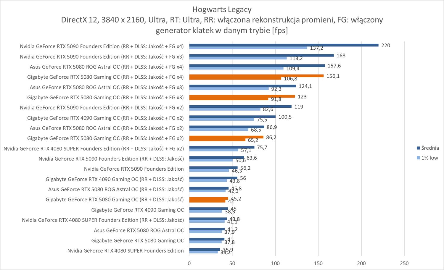 Tutaj jednak uwaga do gry Hogwarts Legacy. Wersja, do której mieliśmy dostęp, wprowadza kilka nowości poza DLSS 4, w tym geometrię ray tracingu, która przy ustawieniach ultra mocno wpływa na wyniki. Stąd znajdziecie tutaj niższe wyniki dla kart niż w testach powyżej. Cyberpunka przetestowaliśmy przy włączonym path tracingu, stąd również mamy inne rezultaty.