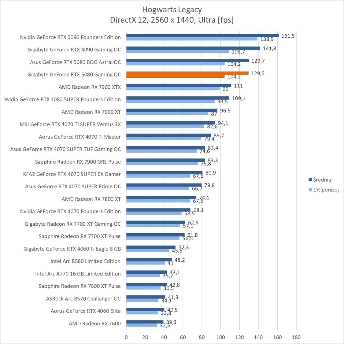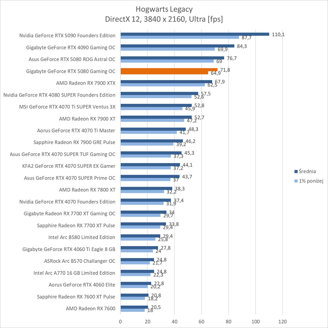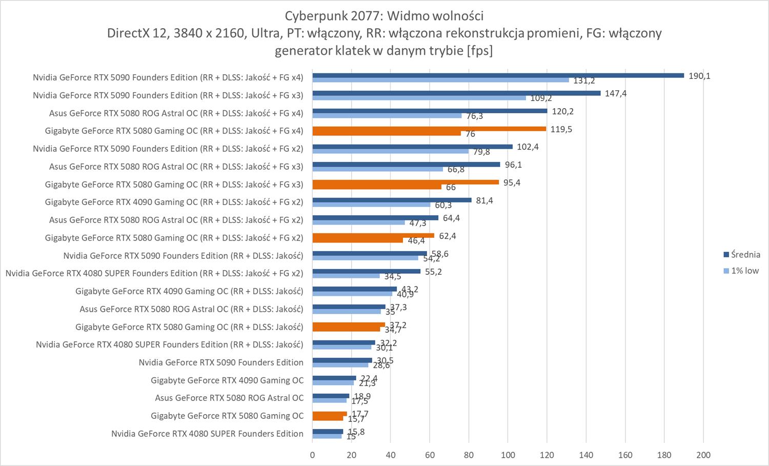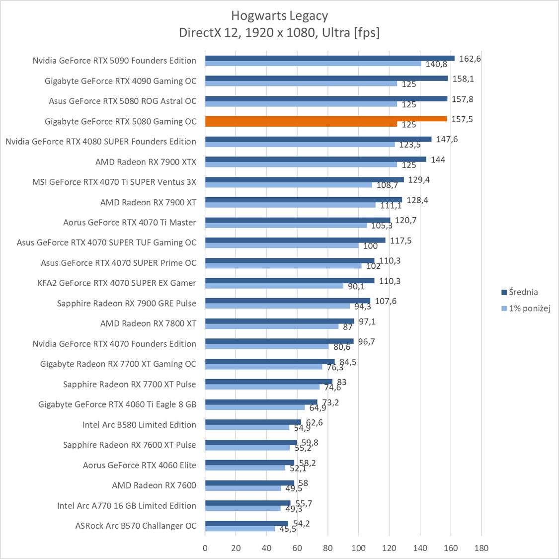 Tutaj jednak uwaga do gry Hogwarts Legacy. Wersja, do której mieliśmy dostęp, wprowadza kilka nowości poza DLSS 4, w tym geometrię ray tracingu, która przy ustawieniach ultra mocno wpływa na wyniki. Stąd znajdziecie tutaj niższe wyniki dla kart niż w testach powyżej. Cyberpunka przetestowaliśmy przy włączonym path tracingu, stąd również mamy inne rezultaty.