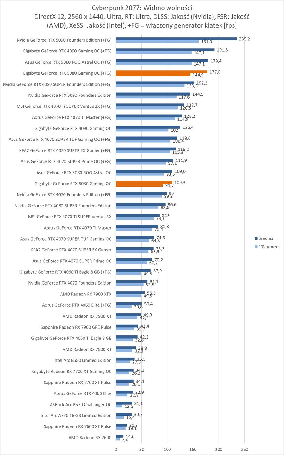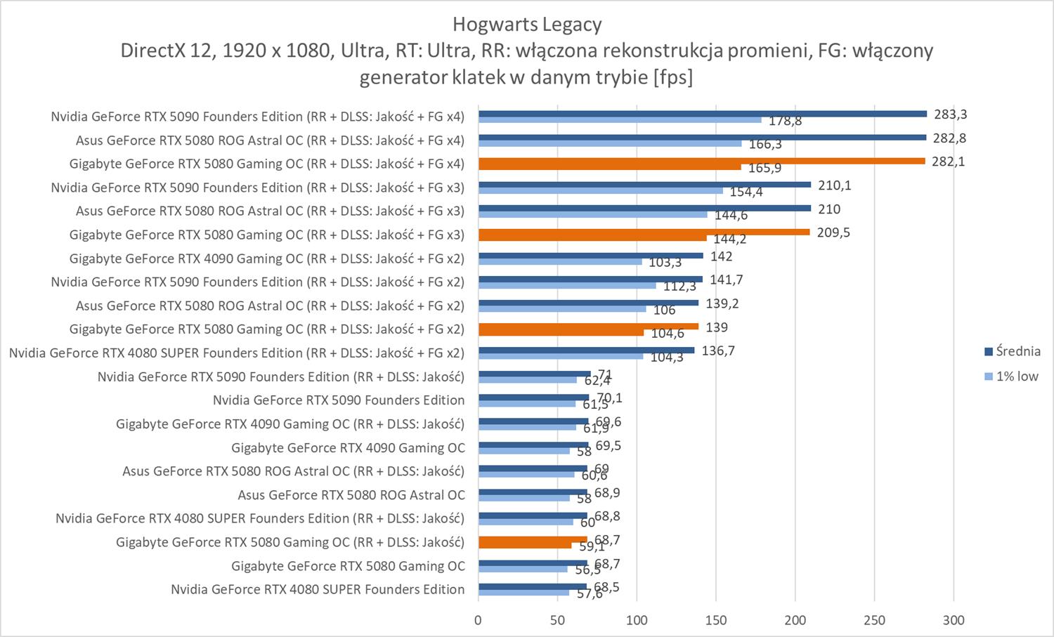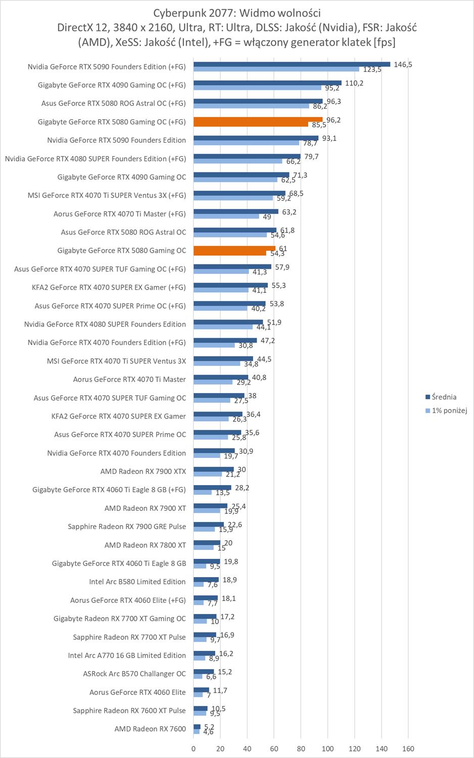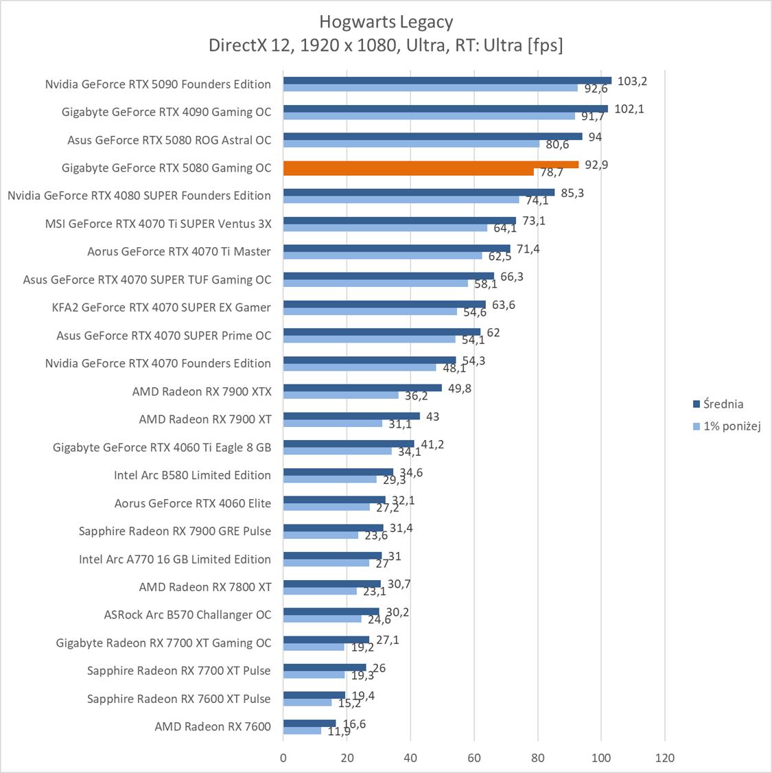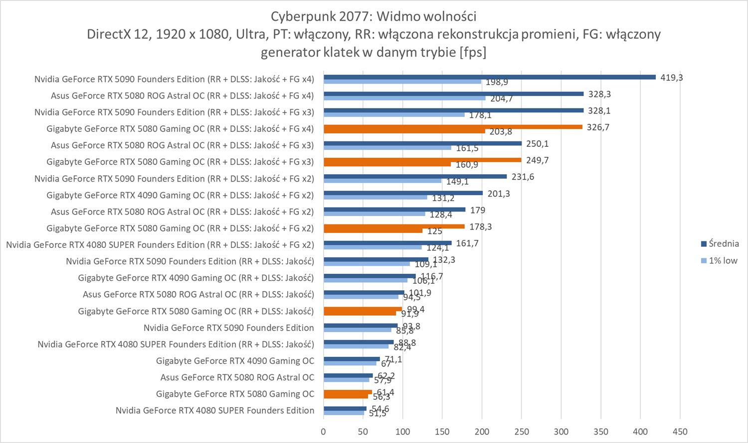 Tutaj jednak uwaga do gry Hogwarts Legacy. Wersja, do której mieliśmy dostęp, wprowadza kilka nowości poza DLSS 4, w tym geometrię ray tracingu, która przy ustawieniach ultra mocno wpływa na wyniki. Stąd znajdziecie tutaj niższe wyniki dla kart niż w testach powyżej. Cyberpunka przetestowaliśmy przy włączonym path tracingu, stąd również mamy inne rezultaty.