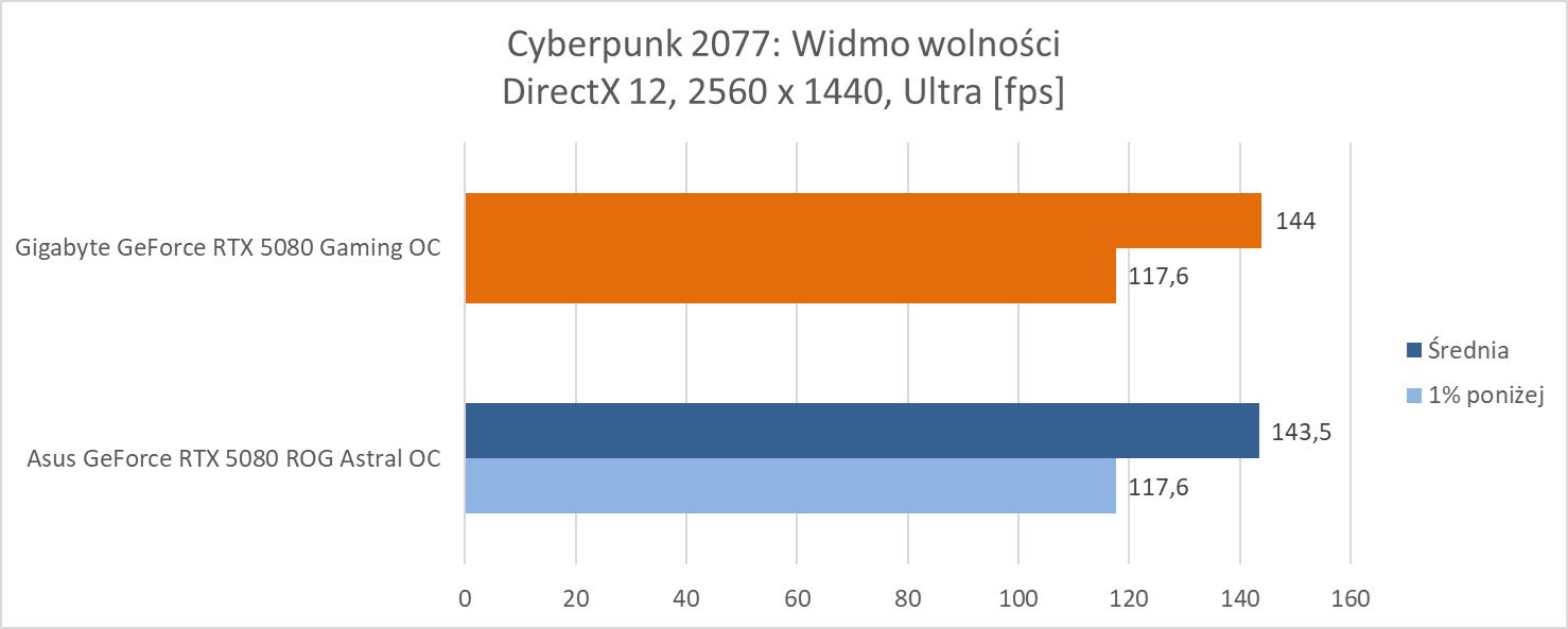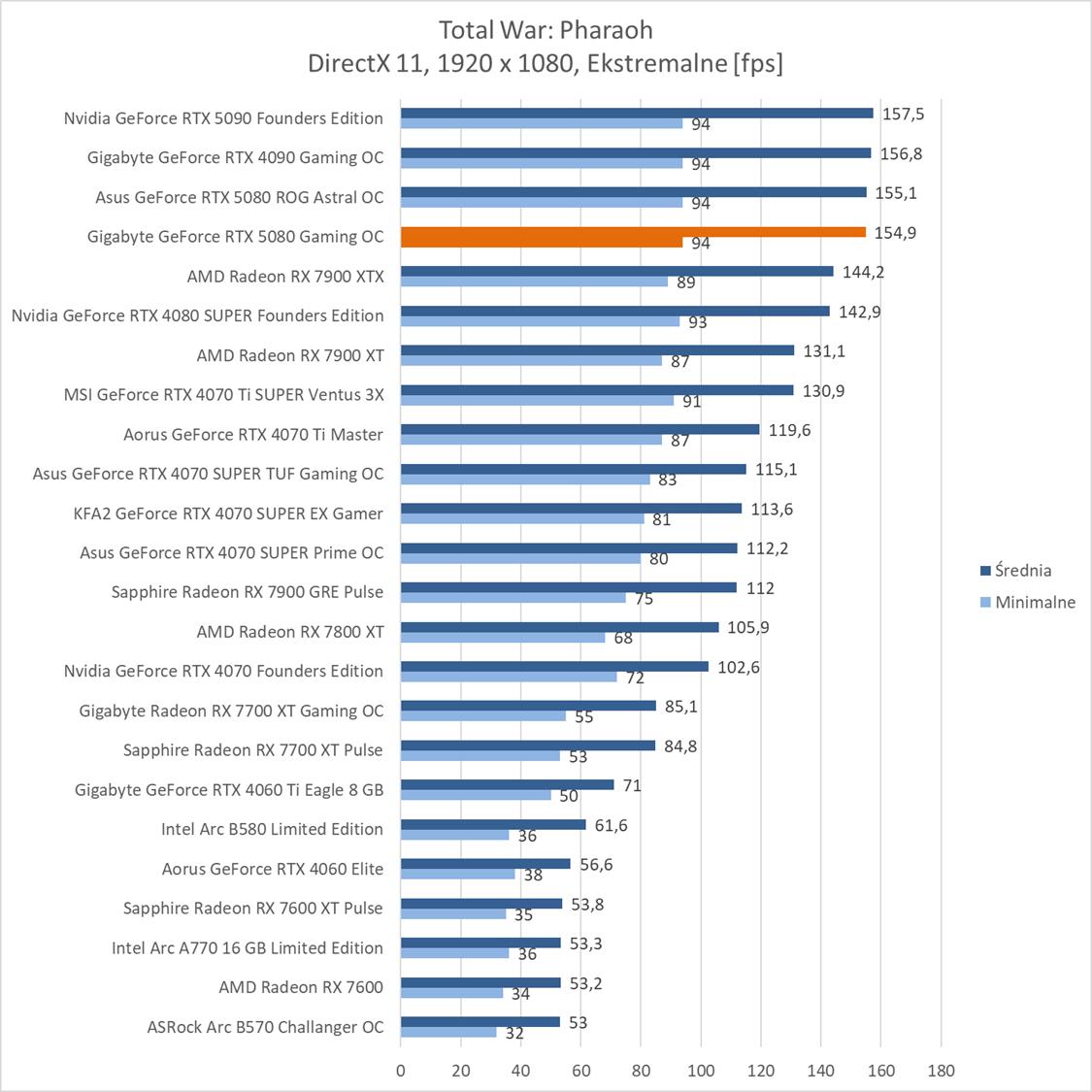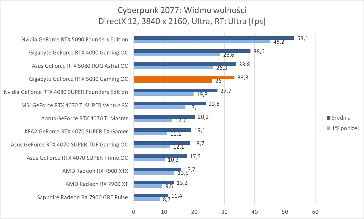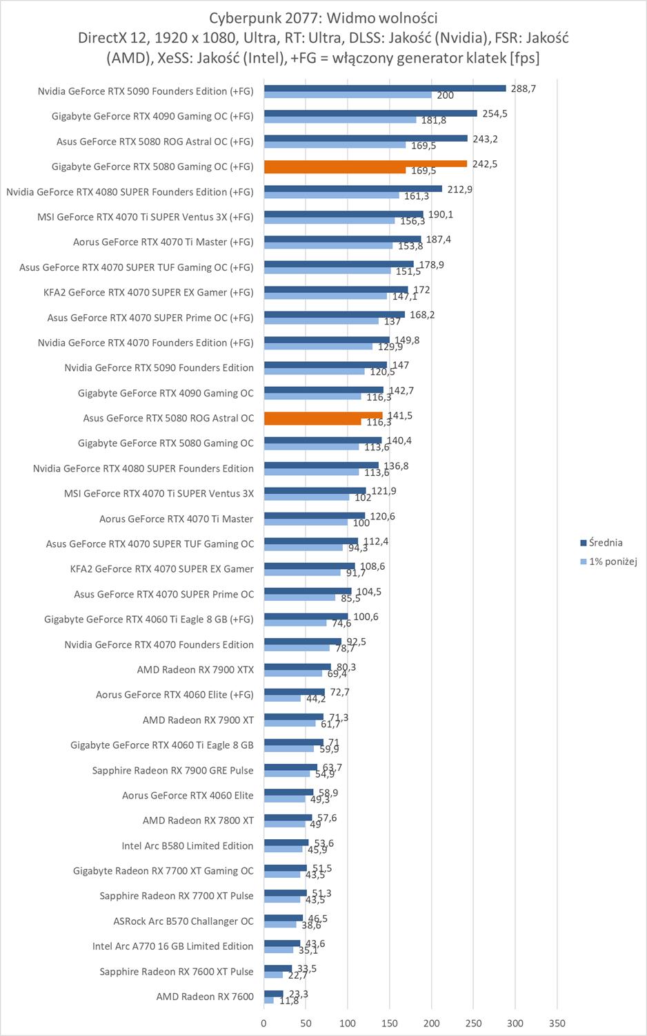 Tutaj jednak uwaga do gry Hogwarts Legacy. Wersja, do której mieliśmy dostęp, wprowadza kilka nowości poza DLSS 4, w tym geometrię ray tracingu, która przy ustawieniach ultra mocno wpływa na wyniki. Stąd znajdziecie tutaj niższe wyniki dla kart niż w testach powyżej. Cyberpunka przetestowaliśmy przy włączonym path tracingu, stąd również mamy inne rezultaty.