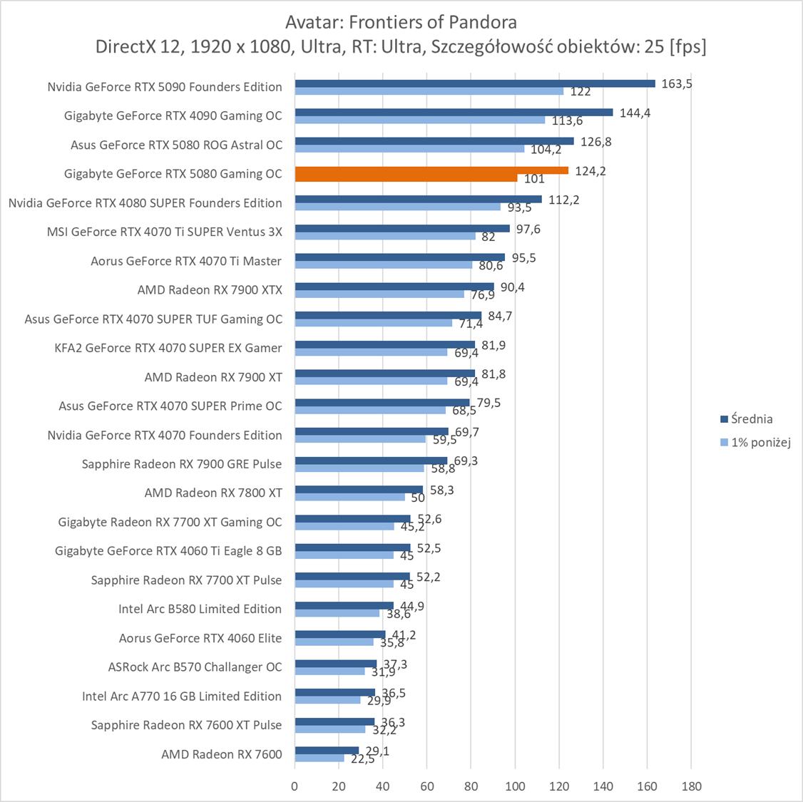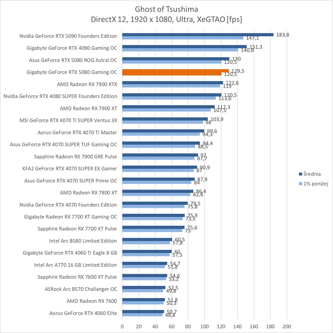 W 1920 x 1080 widać, że karta wypada troszkę słabiej od modelu Asusa. W części gier widać też bottleneck. W tej rozdzielczości też wyniki będą najbliższe RTX 4080 SUPER.