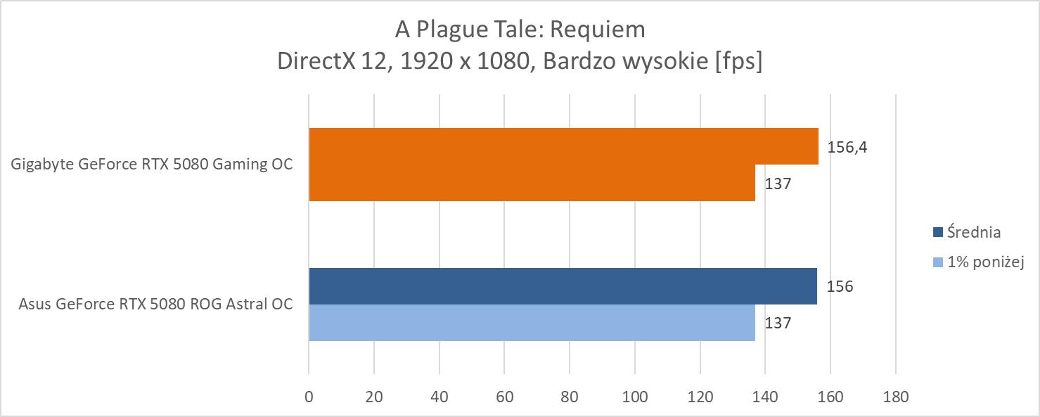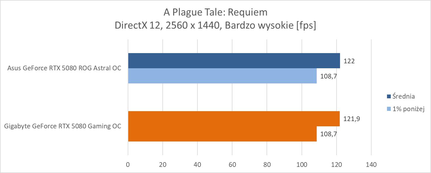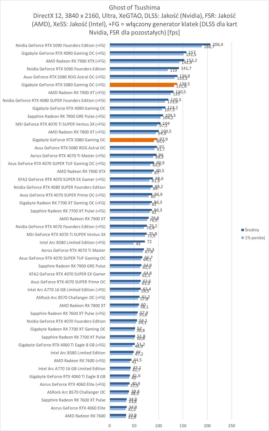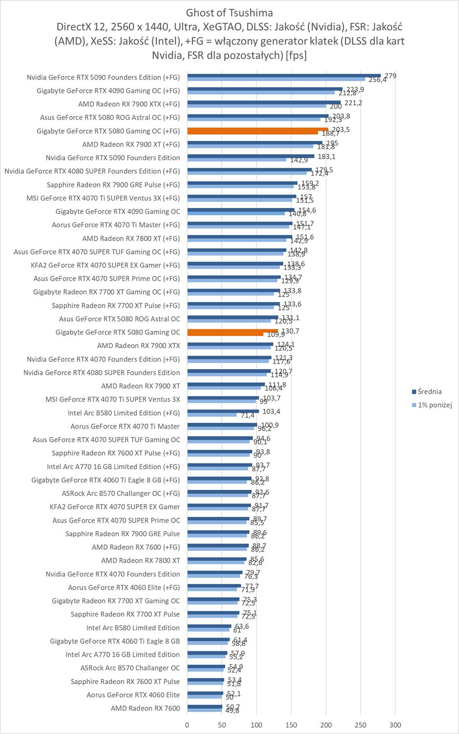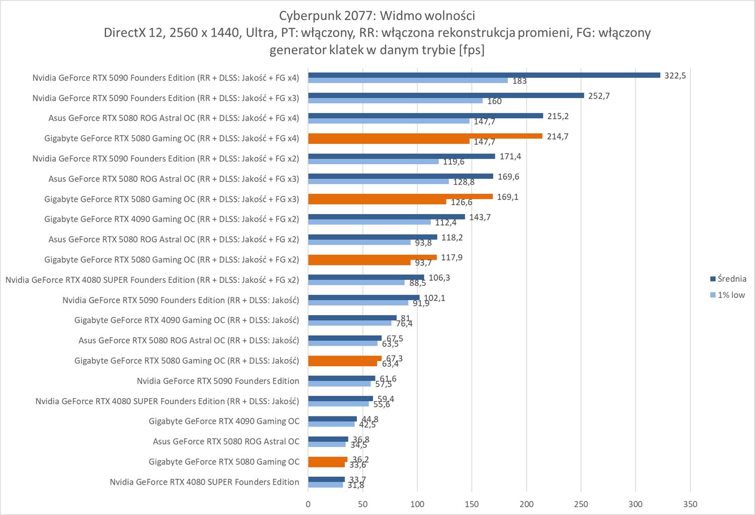 W pierwszej rozdzielczości widać świetne wyniki w obu grach. Generator w wyższym trybie zapewnia naprawdę robiącą wrażenie liczbę fps na RTX 5080.