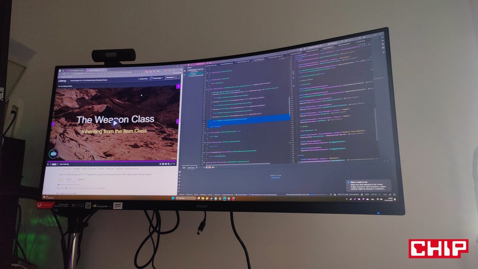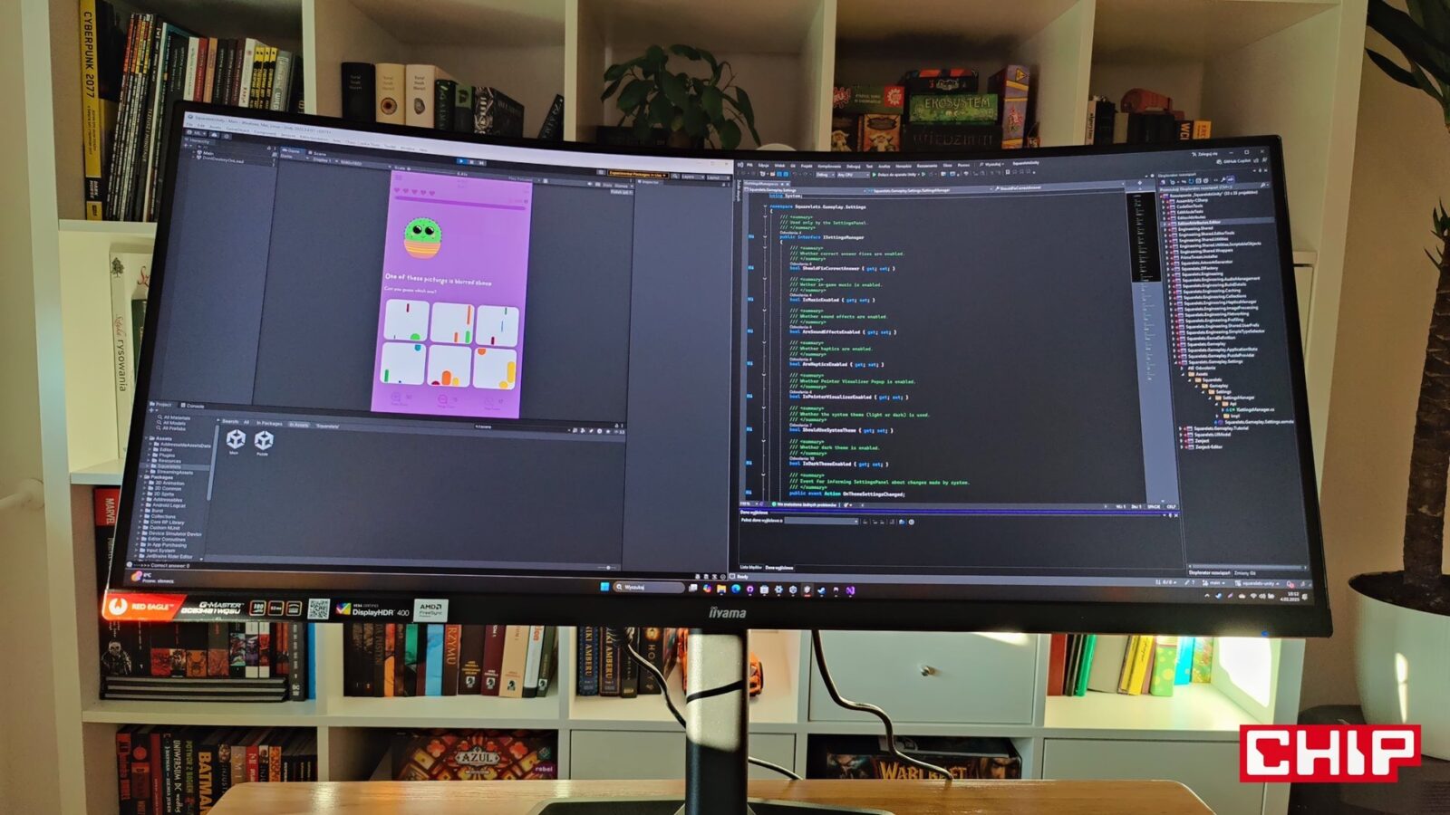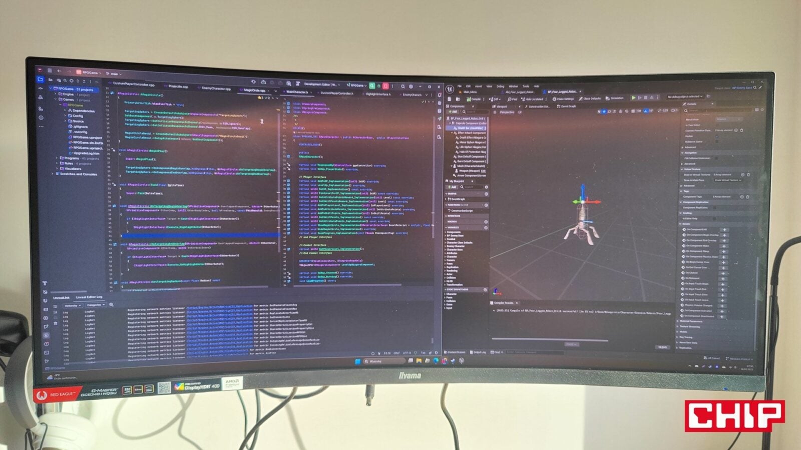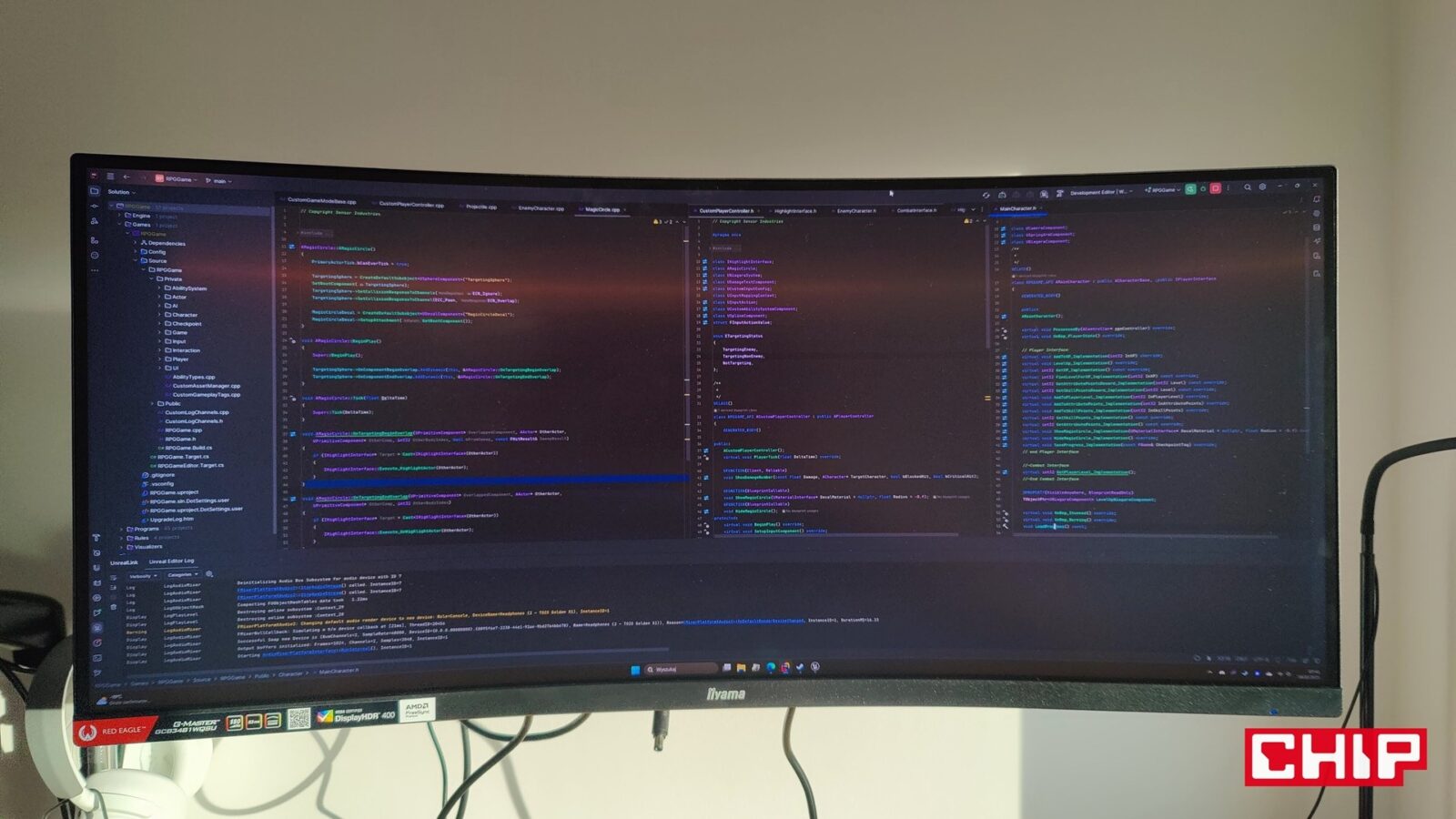 Mój workflow na co dzień jest prosty – ekran dzielę na dwie części, na których lądują albo przeglądarki, albo dokumentacja oraz IDE lub silnik. 27-calowe wyświetlacze o rozdzielczości 2K to dla mnie złoty środek w takich scenariuszach, w których okazjonalnie wspieram się drugim ekranem, kiedy robi się szczególnie gorąco. G-Master GCB3481WQSU-B1 Red Eagle zajmuje jednak na tyle dużo miejsca, że sensowne ustawienie dwóch monitorów na standardowych ramionach jest nie lada wyzwaniem, ale po co komu dwa monitory, kiedy w jednym ma tak naprawdę dwa 28,5-calowe ekrany? W praktyce zmieścić na nich można nie dwa, a trzy dokumenty czy skrypty, a tym bardziej silnik z grą oraz IDE, co jest przydatne szczególnie podczas debugowania. Zakrzywienie monitora wtedy kompletnie nie przeszkadza i jest ot kwestią przyzwyczajenia, które potrwa może kilka godzin.
