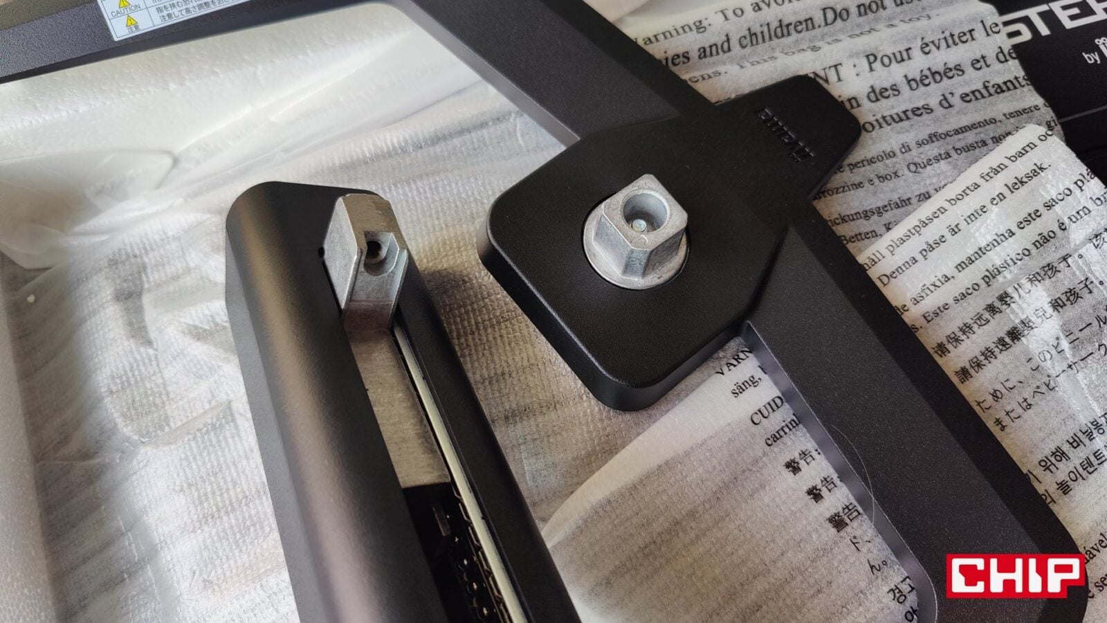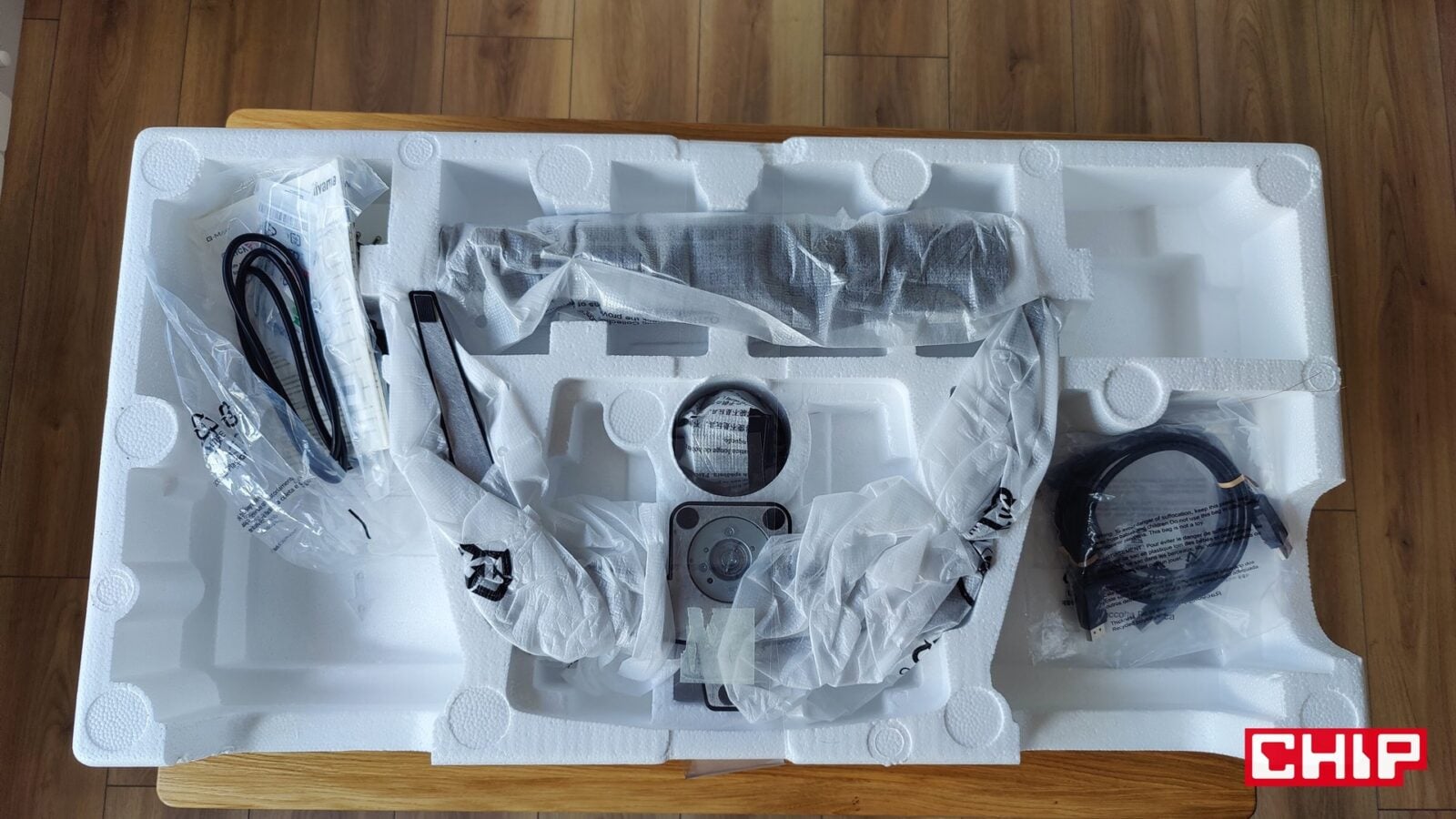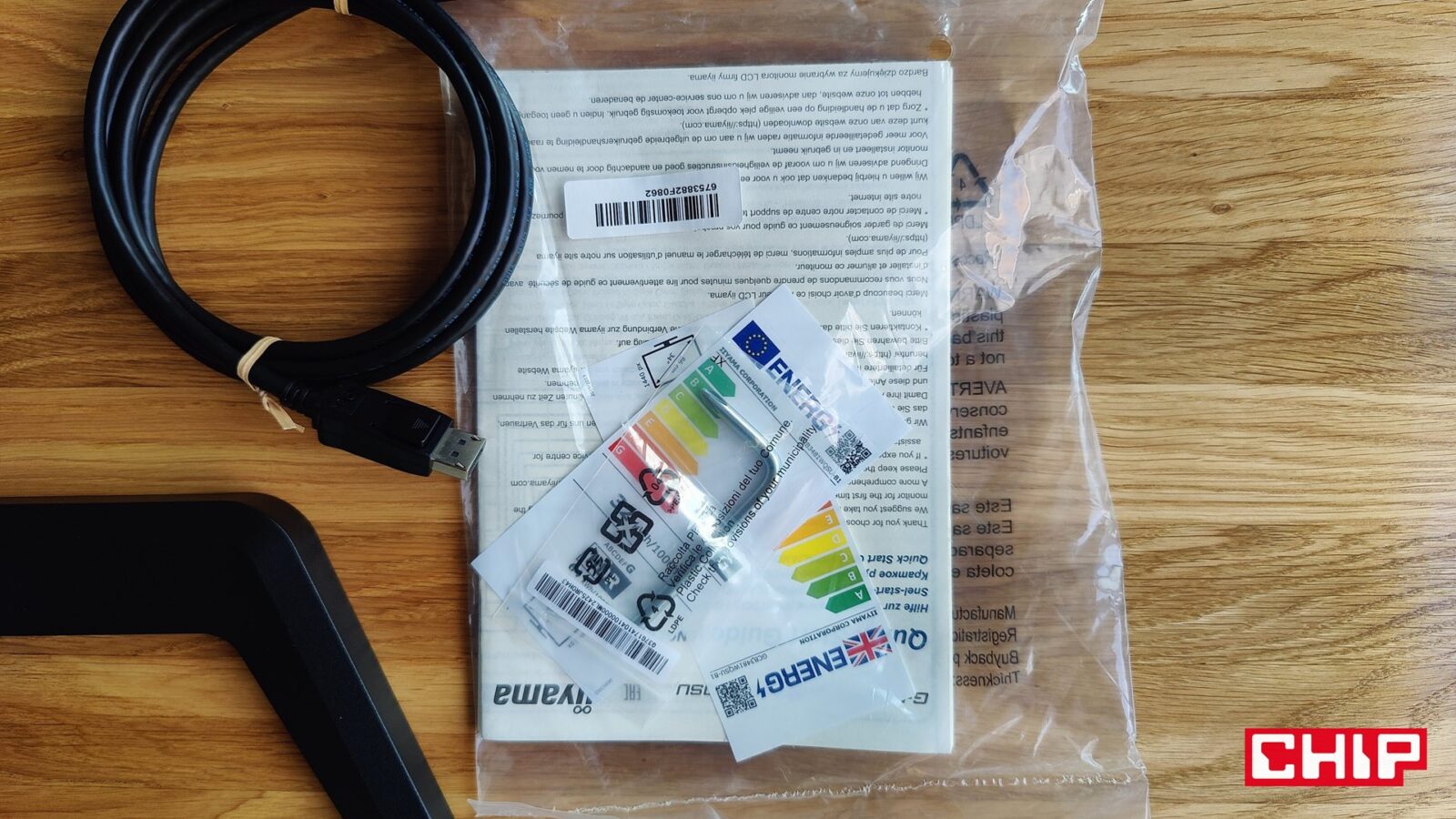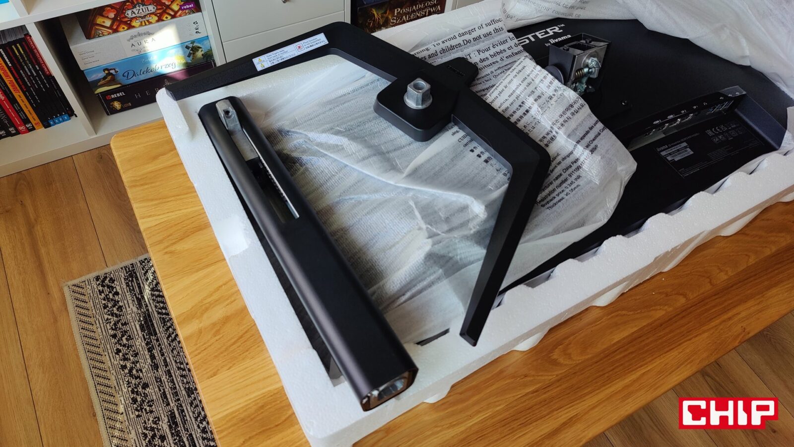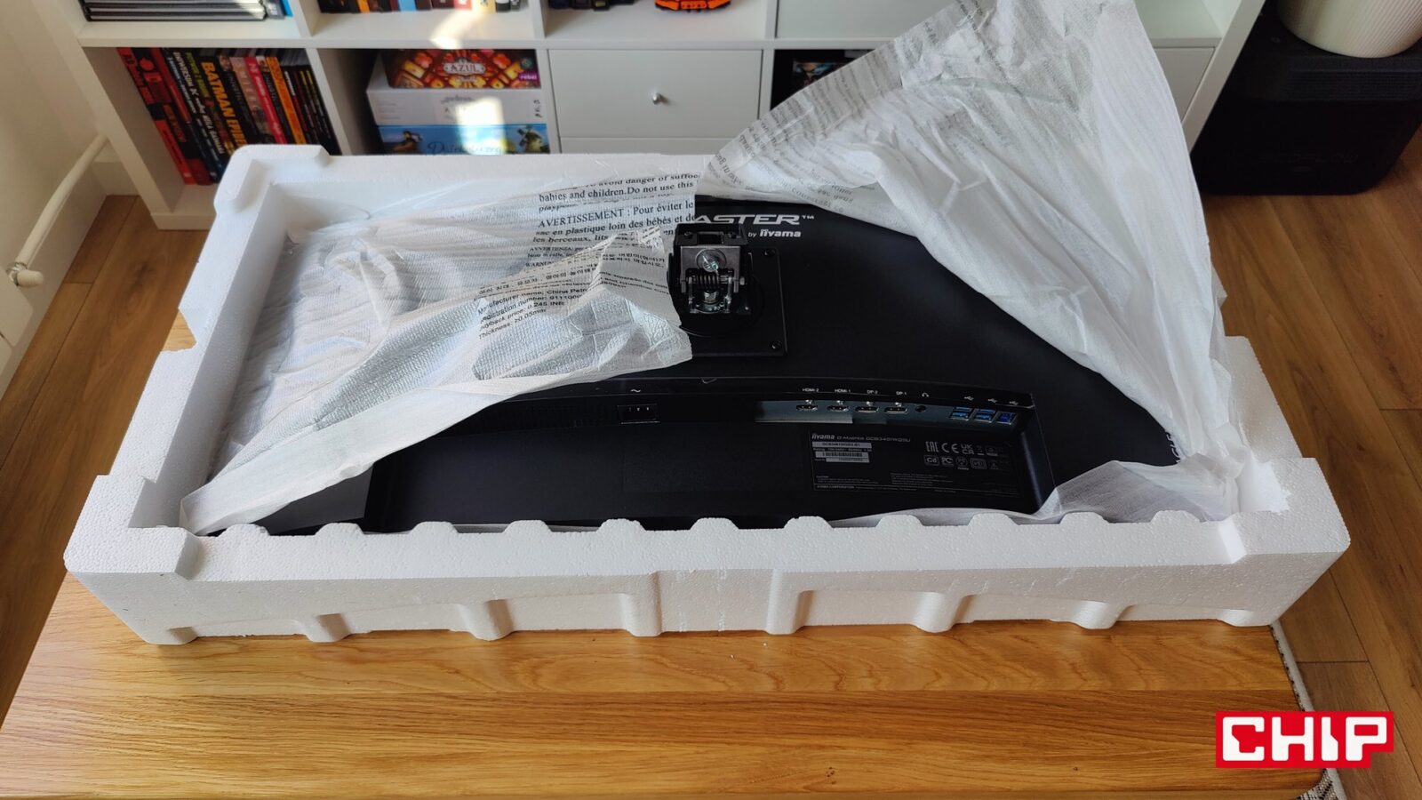 W ostatnim czasie przez moje ręce przeleciało sporo monitorów i z każdym z nich miałem ten sam problem – problematyczne rozpakowywanie i ponowne pakowanie wszystkiego do kupy. Nie wiem, jak producenci projektują te opakowania, ale mam dziwne wrażenie, że żaden z nich nigdy nie rozpakowywał ręcznie swojego sprzętu. Wypełnienie, z którym trzeba się szarpać i wypadające przewody, to standard, ale iiyama podeszła do sprawy znacznie profesjonalniej. W głównym pudełku znajdziecie połączone ze sobą arkusze styropianu owinięte grubą plastikową taśmą, która ułatwia wyciągnięcie całości, a wcześniej możecie rozerwać pudełko w dedykowanym miejscu i wyciągnąć z niego przewód zasilający. To proste rozwiązania, a cieszą. Zwłaszcza że jeśli zachowacie pudełko z myślą o np. przeprowadzce, to nawet po kilku latach bez większych domysłów zapakujecie całość do kartonu i przeniesiecie w bezpieczny sposób.