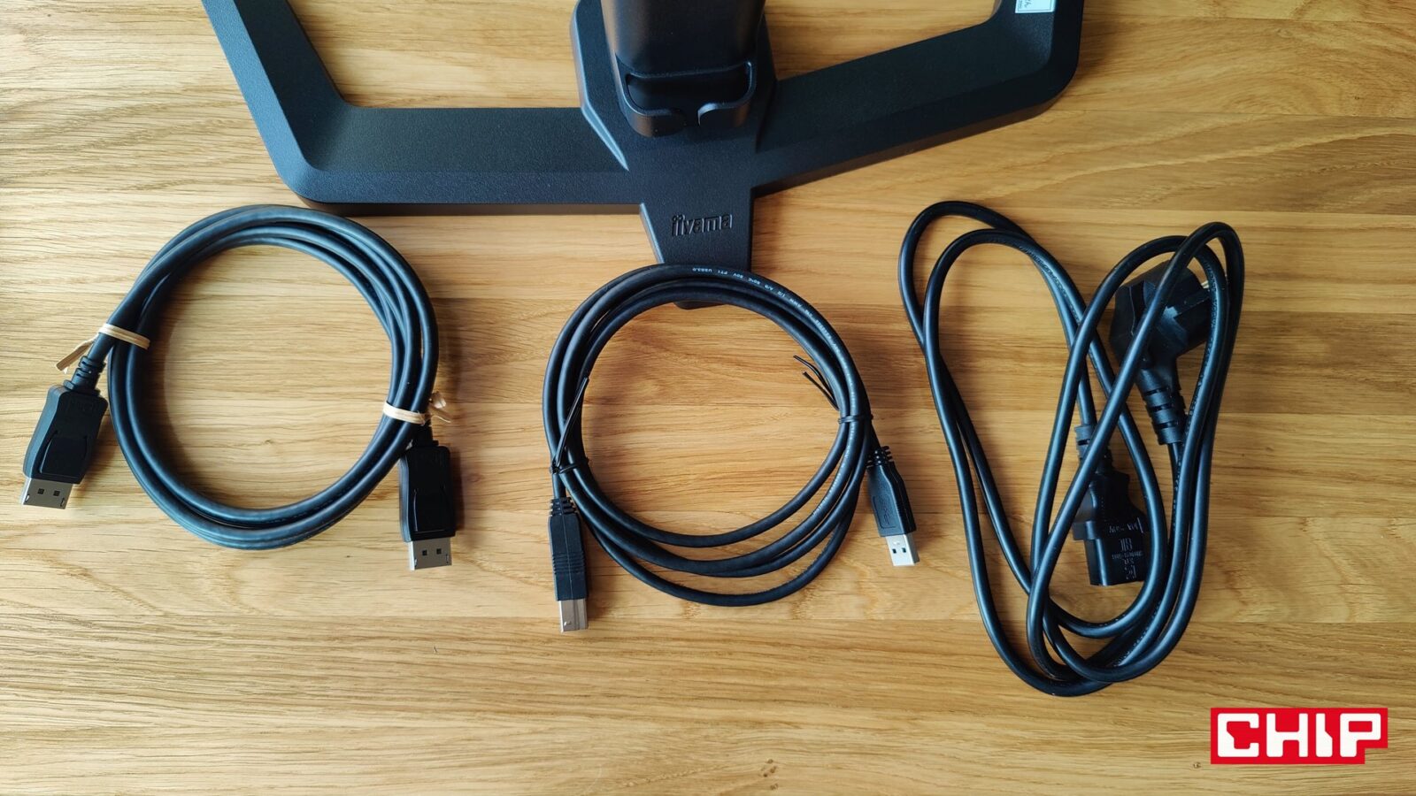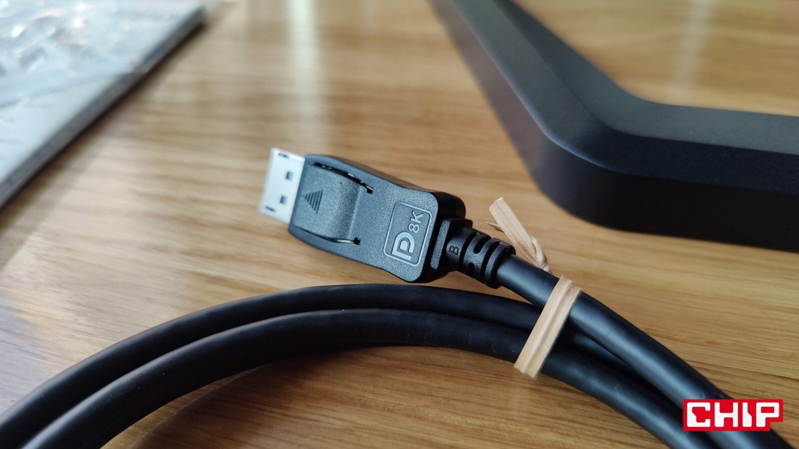 Jeśli idzie o zestaw, to poza podstawą monitora w zestawie znajdziecie też instrukcję bezpieczeństwa i skróconą instrukcję obsługi, a do tego aż cztery przewody o długości 1,8 metra, bo przewód zasilający, USB-B do USB-A, HDMI oraz DisplayPort 8K.