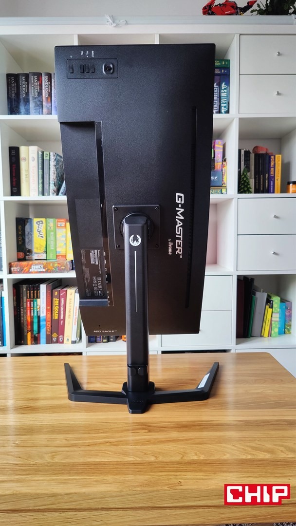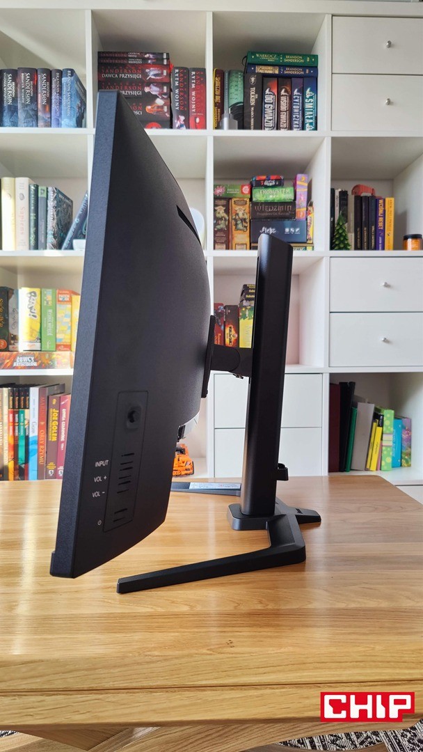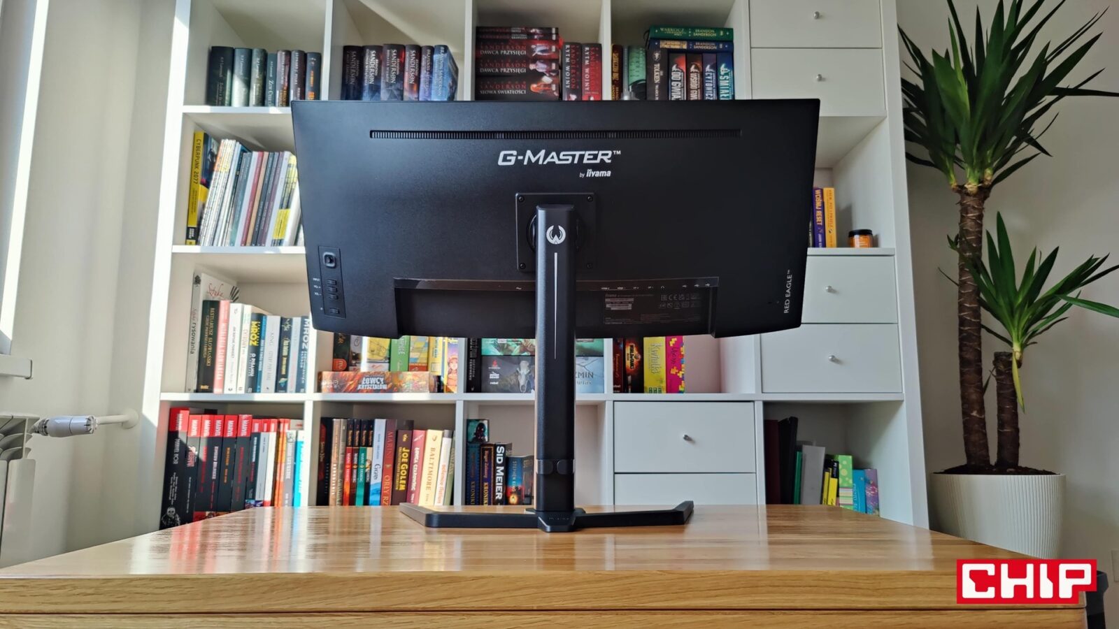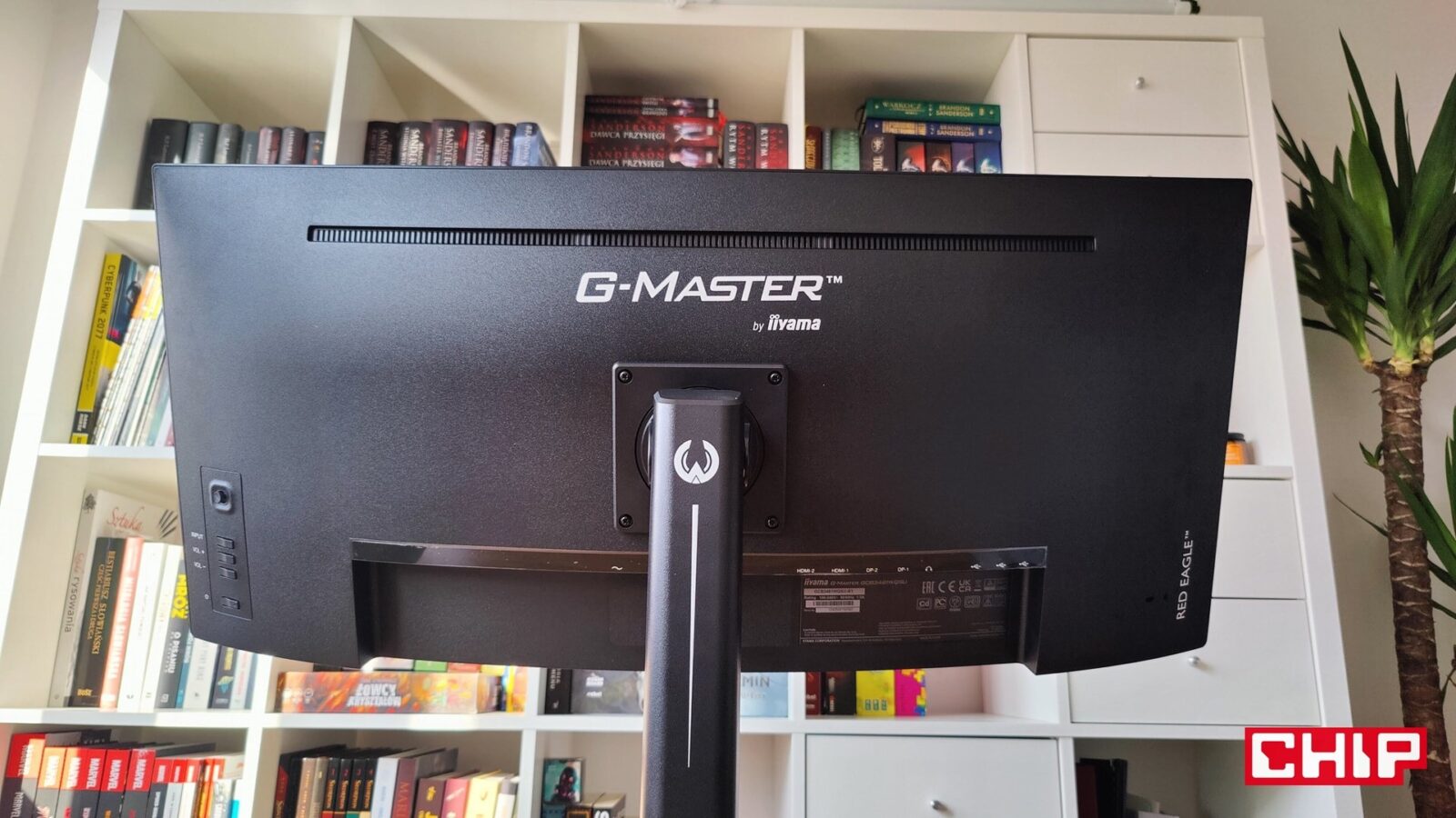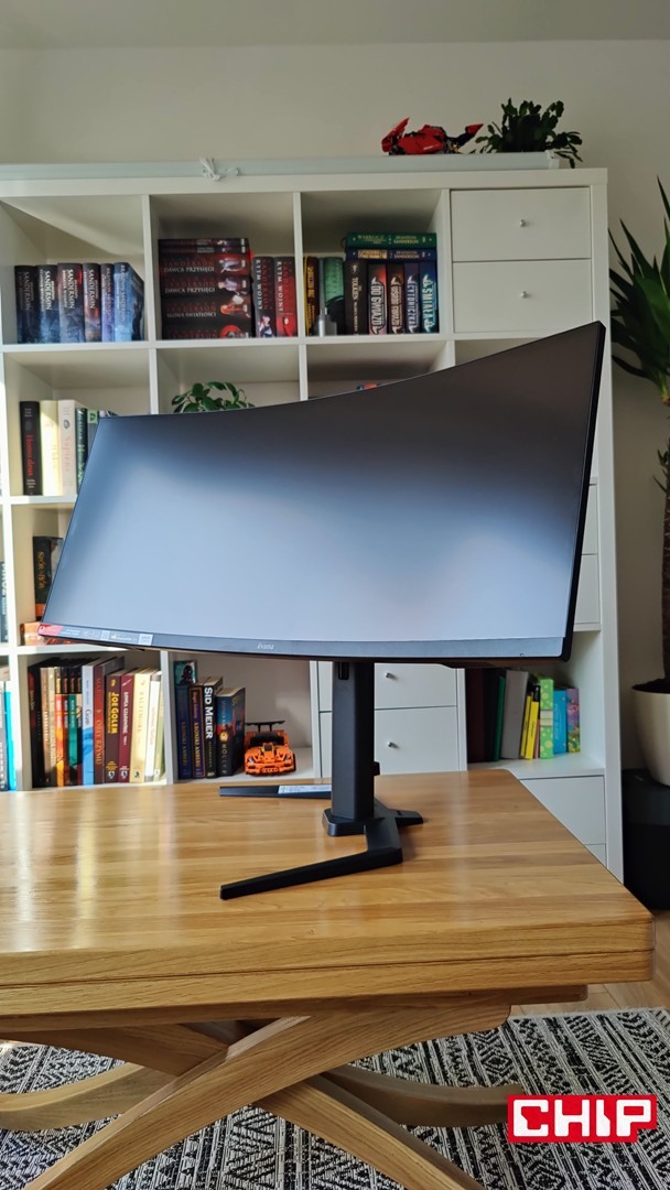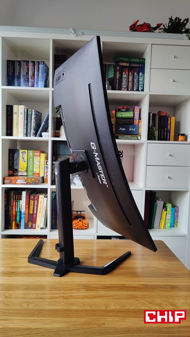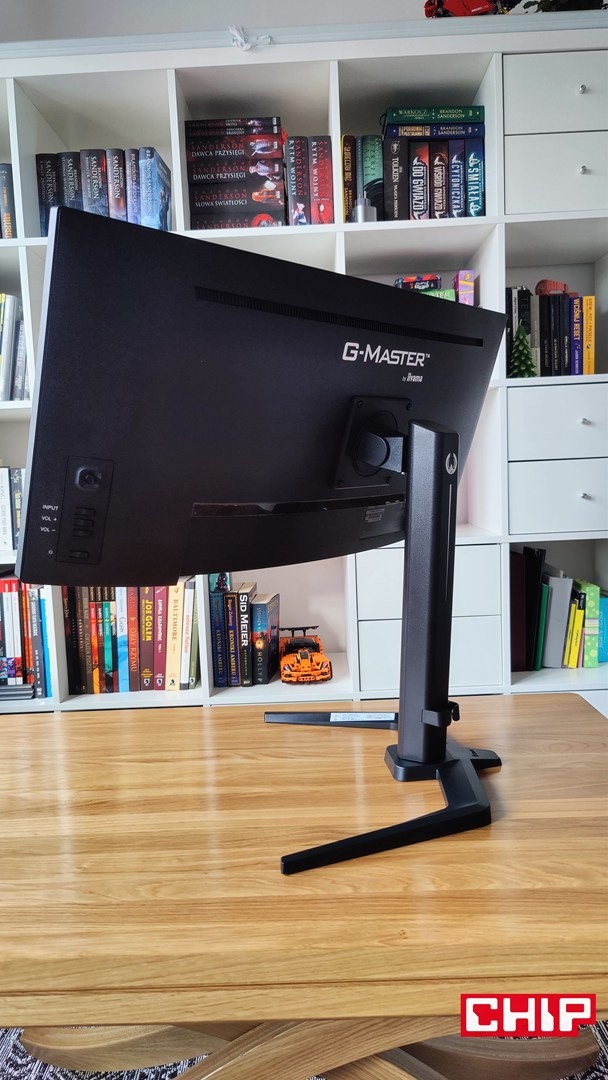 Zacznijmy od tego, że iiyama G-Master GCB3481WQSU-B1 Red Eagle nie jest monitorem dla każdego. Nie tylko przez specyficzne przeznaczenie, ale też przez fakt zajmowania ogromnej ilości miejsca na biurku (809.5 × 435/585 × 290 mm). W skrócie? Jeśli macie mały, a przede wszystkim wąski blat, na którym ustawiacie też myszkę i klawiaturę, to najpewniej nie jest to sprzęt dla was i nawet ramię VESA standardu 100 × 100 w tym nie pomoże. Jeśli planujecie zamontować taki sprzęt na ramieniu, to musicie wiedzieć, że jego waga bez podstawki spada z 9,4 kg do 6,7 kg, a więc jest na tyle duża, że może rzucić wyzwanie co słabszym lub zużytym siłownikom gazowym.