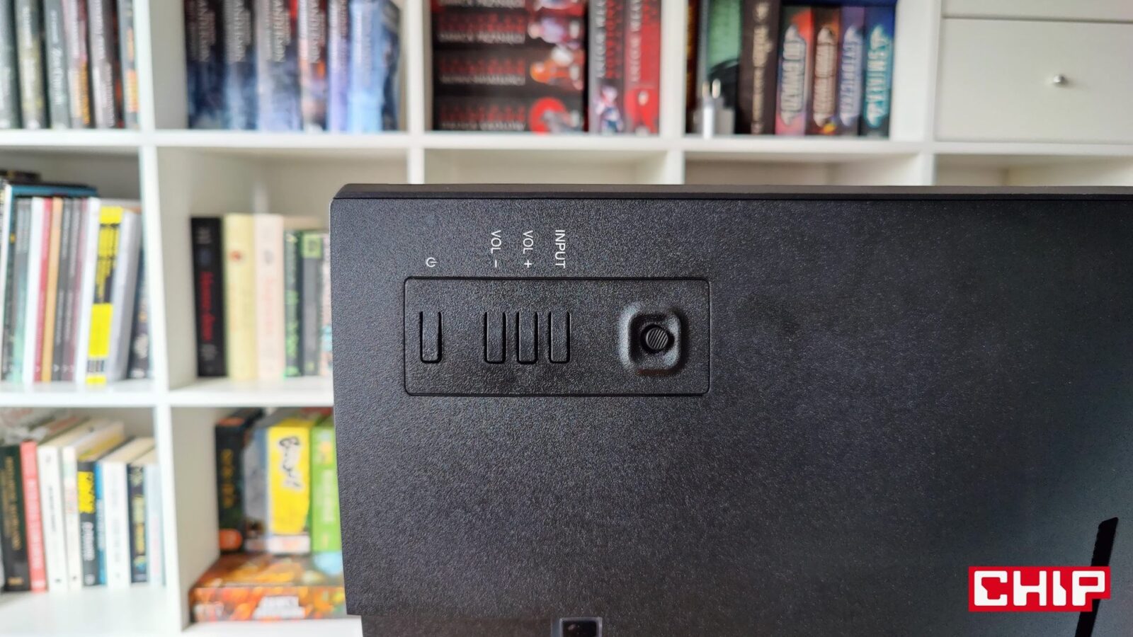 Na tyle nie znajdziecie nic nietypowego, bo jedyne szaleństwo, na które zdecydował się producent, sprowadza się do mniej tradycyjnego zestawu czterech przycisków oraz joysticka w prawym dolnym rogu. O ile sam rozkład jest nieco nietypowy, tak jego zastosowanie nie skrywa w sobie żadnych zaskoczeń, umożliwiając nawigację po menu, wybieranie wejścia wideo, regulację poziomu głośności i wyłączanie oraz włączanie sprzętu. Poza tym możecie liczyć na plastikowe “trzymadełko na przewody” w dolnej części uchwytu (o ile się na niego zdecydujecie), Kensington-lock oraz następujący zestaw portów: