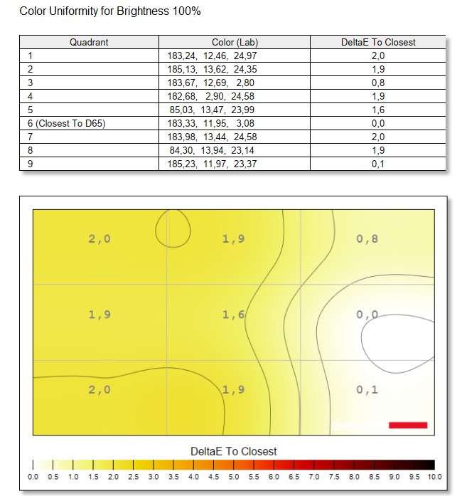 Z drugiej strony, wyniki testu wskazują na pewne nierówności w jednorodności luminancji i kolorów – różnice do 7% w luminancji oraz Delta-E w zakresie 0,0-2,0 w różnych częściach ekranu mogą być zauważalne w jednolitych tłach i pracy z kolorem. Nieciekawie wypada też pomiar punktu bieli na poziomie 7700K-7800K, który oznacza, że obraz jest zauważalnie chłodniejszy od standardowego 6500K. Jednak mimo wszystko, biorąc pod uwagę gamingowy charakter monitora i jego wysokie odświeżanie 180 Hz, parametry te nie powinny jakkolwiek odstraszać graczy. To, czego z kolei takie testy nie wykażą, sprowadza się do problematycznych kątów widzenia, bo choć utrzymywanie głowy w centrum monitora minimalizuje charakterystyczne przyciemnienie na bocznych krawędziach (widać to zwłaszcza na jasnych tłach), tak nie da się go całkowicie wyeliminować.