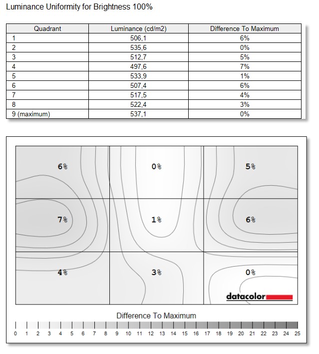 Na podstawie przeprowadzonego testu kolorymetrem Spyder X Elite, można zauważyć, że monitor oferuje bardzo dobre pokrycie przestrzeni barwowej, osiągając 100% sRGB, 84% AdobeRGB oraz 91% DCI-P3. Średnia wartość Delta-E na poziomie 1,11 oznacza też wysoką dokładność kolorów, co jest zaletą w zastosowaniach gamingowych i multimedialnych. Kontrast na poziomie 3030:1 oraz dobrze odwzorowane czernie sprawiają, że matryca VA tego monitora oferuje głębokie, nasycone kolory. Pomiary potwierdziły też wysoką jasność, bo do nawet 537 nitów, czyli powyżej twierdzeń producenta.