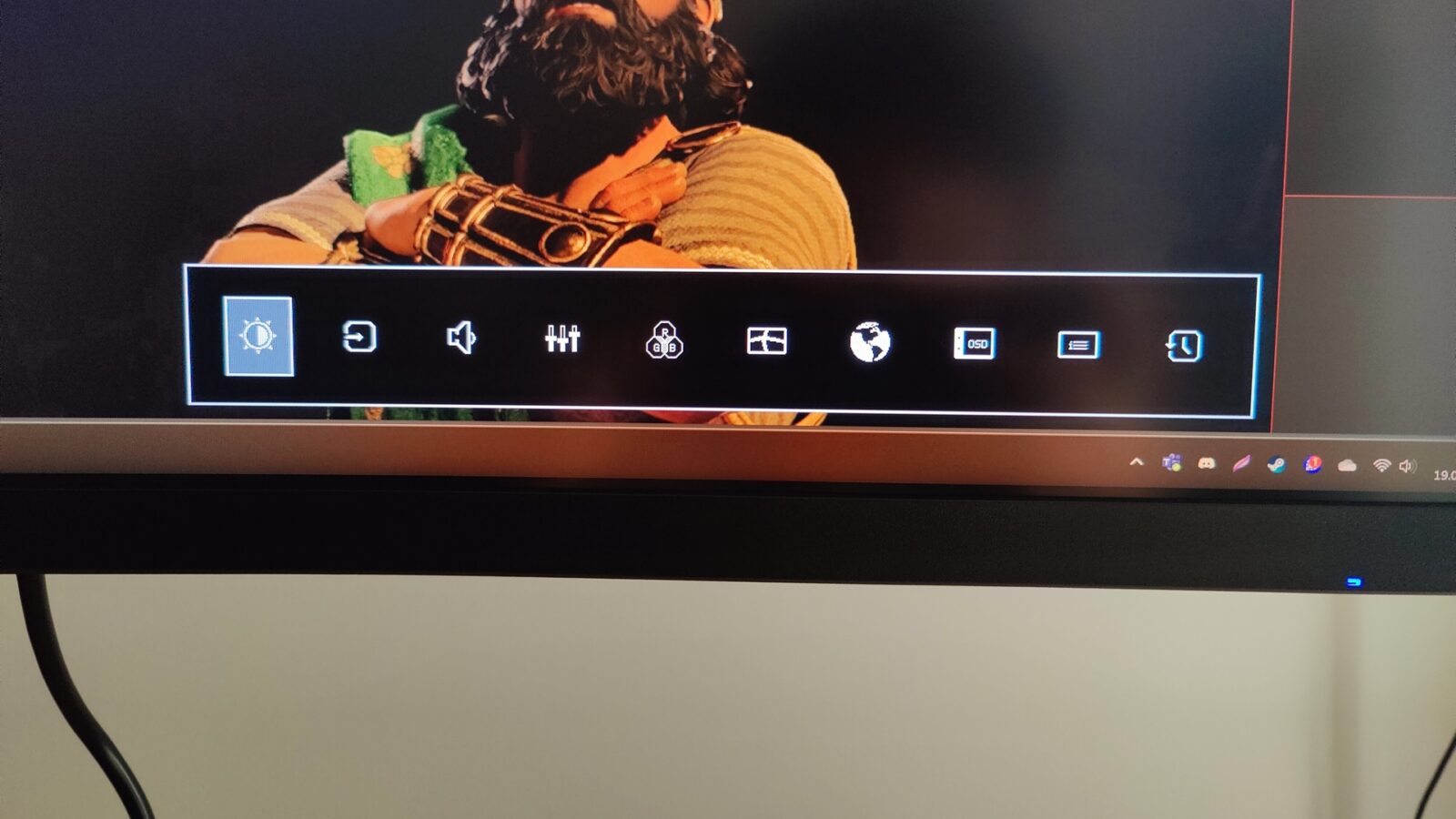 Wszystkie ustawienia monitora są dostępne wyłącznie z poziomu zestawu kontrolek na jego tyle. W nawigacji wykorzystujecie wyłącznie joystick oraz pierwszy przycisk z góry, który służy głównie do wycofywania się do wcześniejszych zakładek, jako że wciśnięcie gałki jest równoznaczne z przyciskiem “ok”. Wchodząc w szczegóły, posunięcie gałki w lewo aktywuje proste menu wyboru predefiniowanych i skonfigurowanych ręcznie ustawień, a w prawo zapewnia kontrolę nad 4-poziomowym trybem nocnym (ot ściemniania ekranu). Pozostałe kierunki nie są jakkolwiek przypisane.