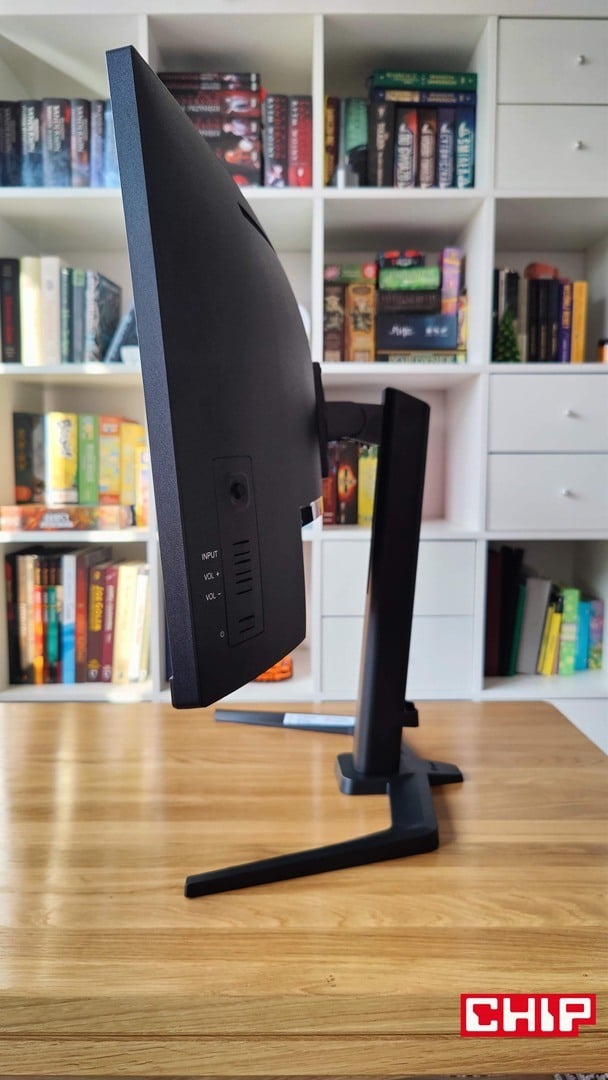 Chociaż na pierwszy rzut oka iiyama G-Master GCB3481WQSU-B1 Red Eagle nie wydaje się tak ciężkim kolosem, to niech nie zwiedzie was plastikowa podstawa, bo jest to tylko obudowa solidnej metalowej konstrukcji. Konstrukcji, która nie tylko zapewnia wysoką stabilność, ale też pozwala regulować wysokość do 150 mm (dla idealnej ergonomii brakuje 15-30 milimetrów), obracać cały ekran z pozycji poziomej do pionowej (choć ostrzeżenie na podstawie sugeruje, że to proszenie się o “stabilnościowe” kłopoty) i wreszcie regulować wychylenie (góra-dół) o odpowiednio 23 i 5 stopni. Co z kolei można o niej powiedzieć? Na pewno nie to, że jest najpiękniejsza, ale z drugiej strony nie zajmuje aż tak dużo miejsca na biurku.