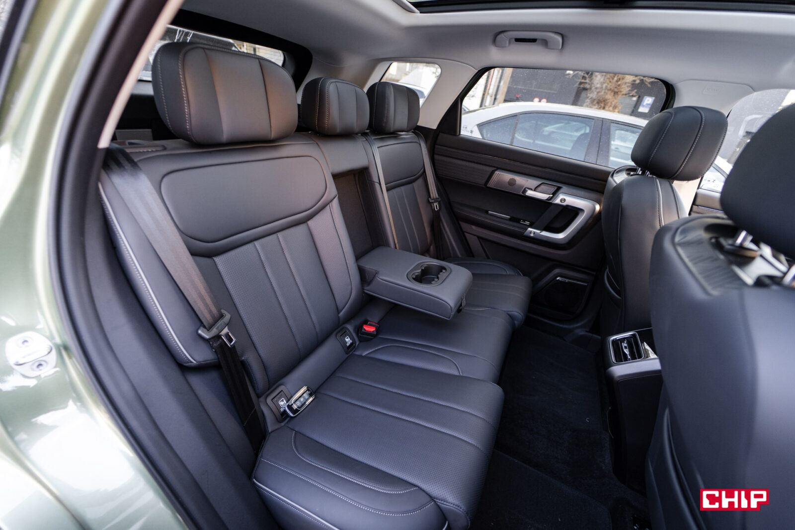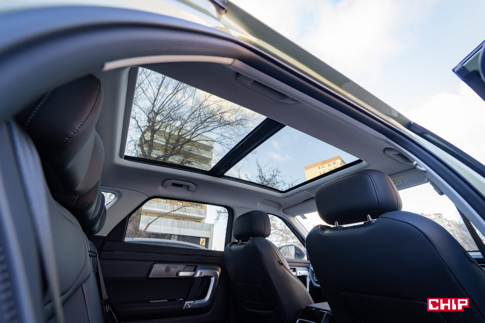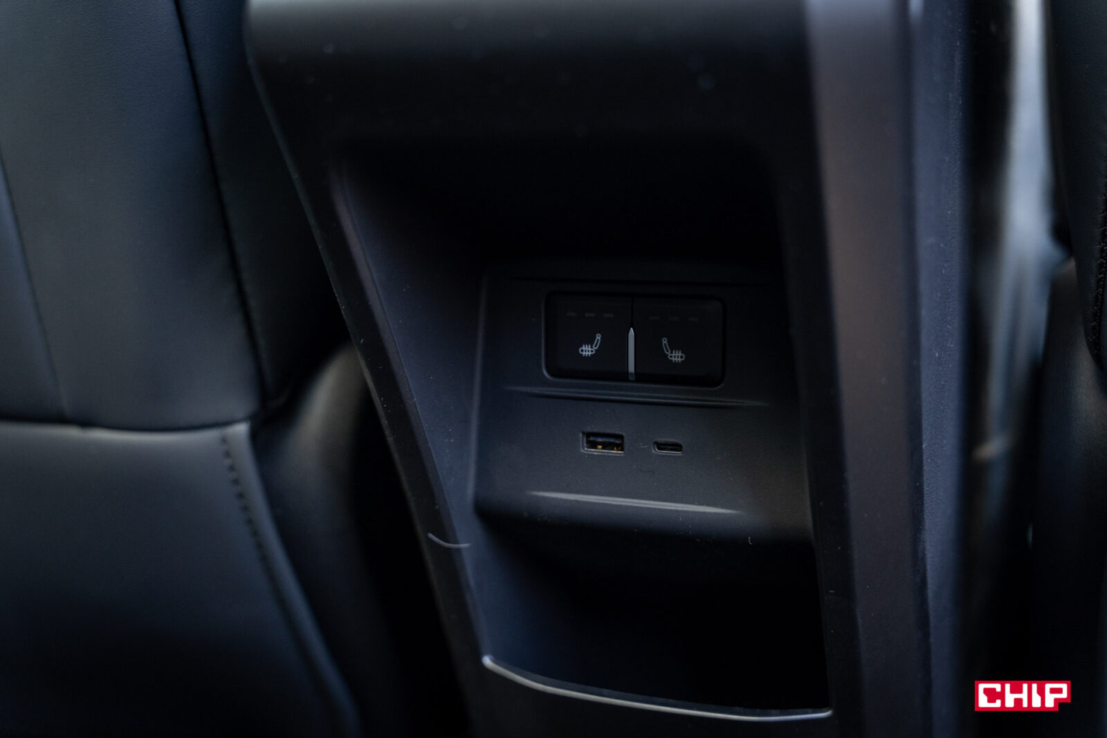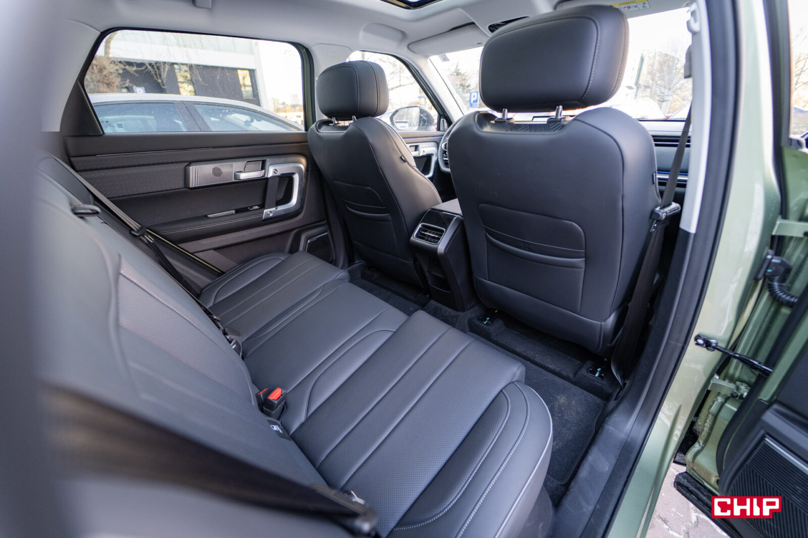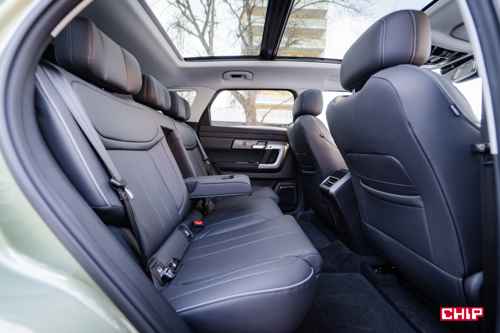 Z tyłu jest bardzo luksusowo. Miejsca jest bardzo dużo, jakby Jaecoo 7 był prawie 5-metrowym autem. To zasługa mądrze umieszczonej kanapy, które jest nieco zapadnięta, ale siedzi się w niej bardzo wysoko i dodając do tego ogromne okno dachowe jest tu bardzo przyjemnie. Pasażerowie mają do dyspozycji rozkładany podłokietnik, podgrzewanie foteli oraz dwa porty USB- A oraz C.