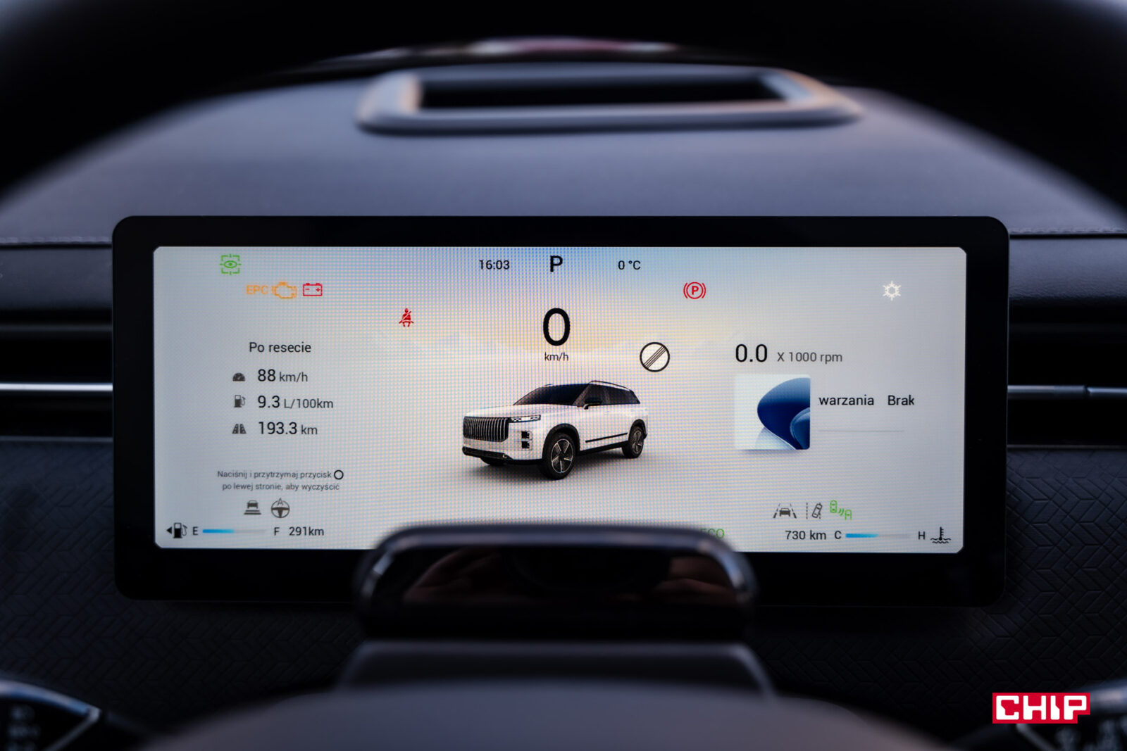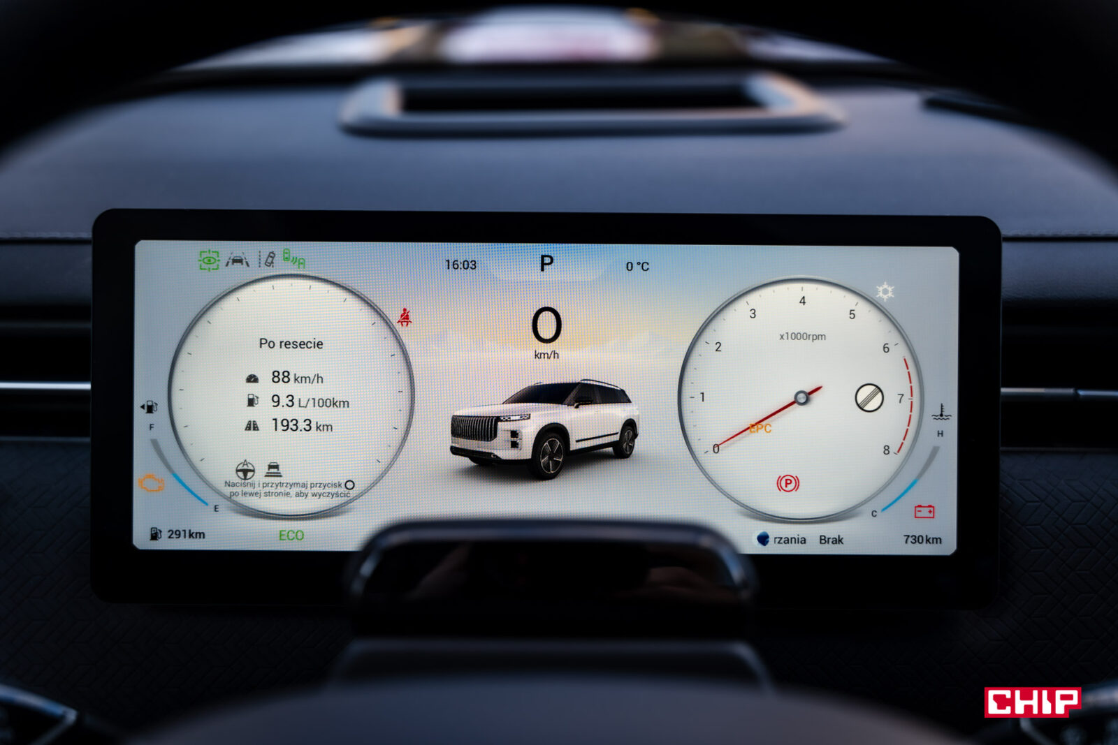 Ekran kierowcy jest nieduży i na pierwszy rzut oka dziwnie umieszczony, ale z perspektywy kierowcy jest bardzo dobrze widoczny. Nie mamy na nim wielu opcji. Do wyboru są dwa widoki – nowocześnie-cyfrowy lub z klasycznymi, okrągłymi zegarami i każdy z nich jest dostępny w trybie jasnym i ciemnym. Choć niewiele tu można zmienić, ekran mieści dużo przydatnych informacji, a wyświetlane na nim animacje są płynne. Widzimy tu uproszczony wygląd drogi, trochę jak w Tesli i duży plus za wyświetlanie tu komunikatu, jeśli w martwym polu znajduje się jakieś auto. Oczywiście jest tu też standardowa sygnalizacja na lusterku.