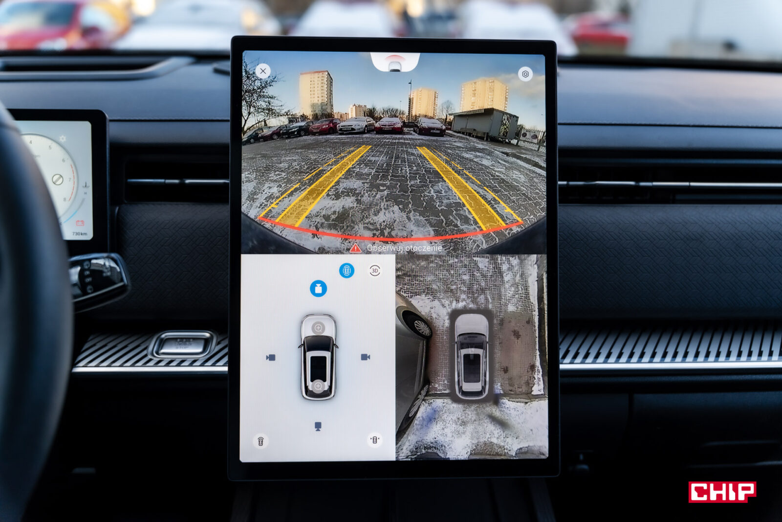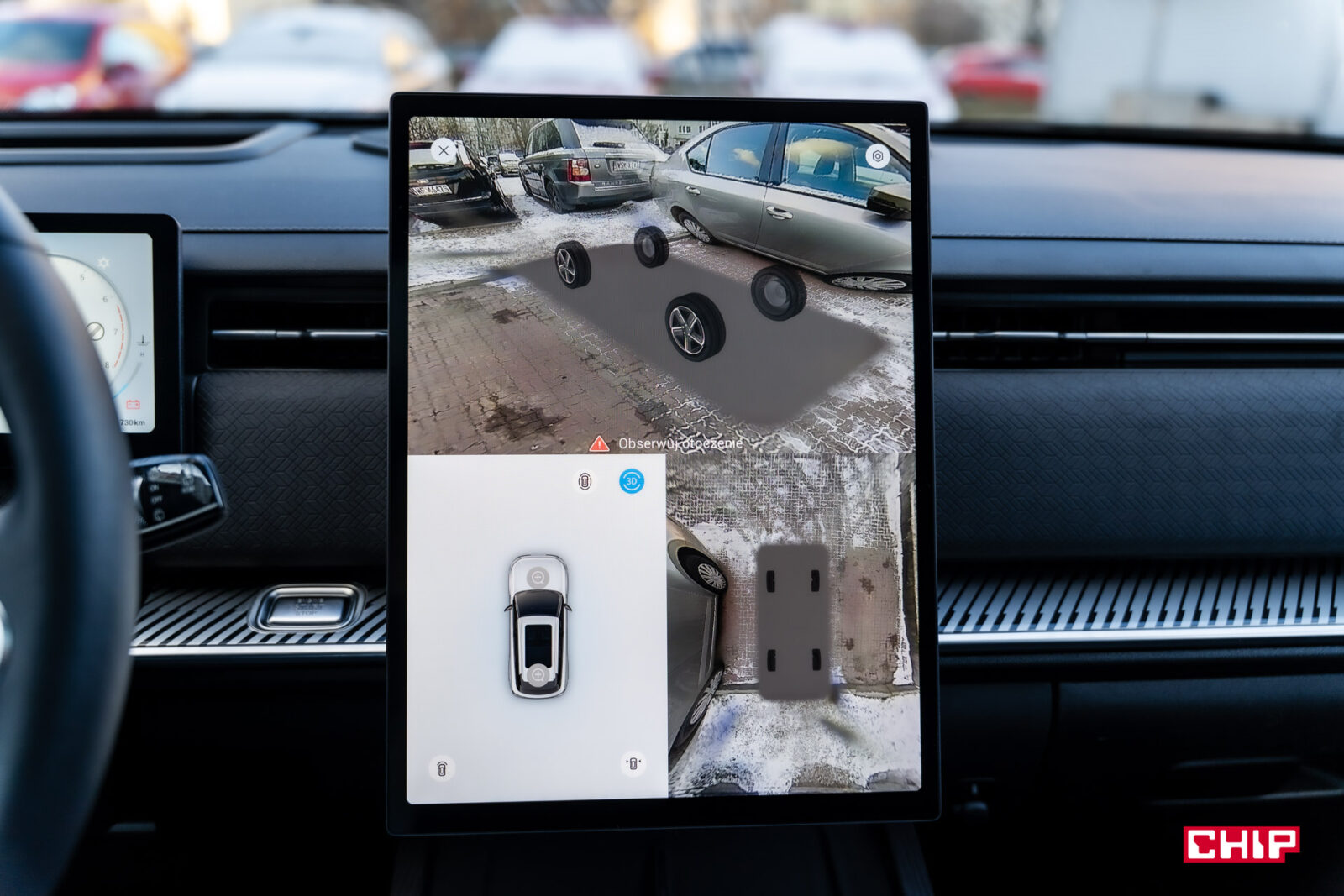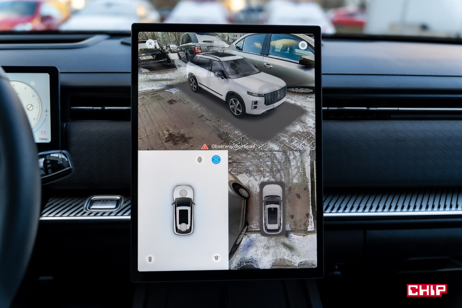 Zapytacie, co to znaczy. Jest to nic innego jak system kamer 360° z możliwością ustawienia ich w taki sposób, aby obraz auta był półprzezroczysty lub całkowicie przezroczysty (widać wtedy tylko animację kół), aby kierowca widział podłoże. Nie jest to nowość, podobną opcją dysponuje choćby Toyota, ale w Jaecoo 7 można włączyć wysokiej jakości animacje auta, rzucone na obraz z kamer. Możemy zobaczyć obraz nie tylko z góry, ale też z boku, z przodu, z tyłu, w każdym rogu. Nie będzie to obraz z danej kamery, a animacja auta dopasowana do obrazu z kilku kamer tak, żeby kierowca widział o wiele więcej, niż może zobaczyć przez szyby.