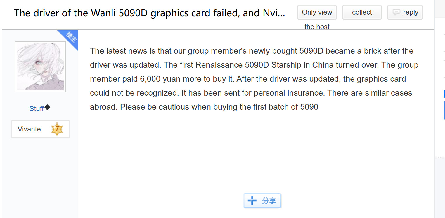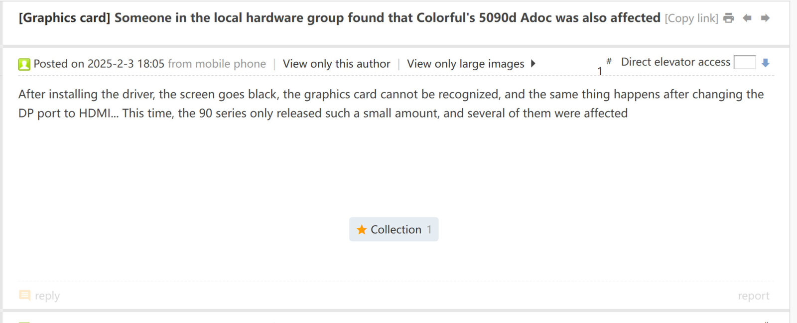 Problem kart graficznych dotyczy zarówno standardowej wersji RTX 5090, jak i zmodyfikowanej wersji eksportowej 5090D, która została wydana na rynek chiński 30 stycznia. Według raportów użytkowników z chińskich forów technologicznych i społeczności Reddit, wiele kart graficznych RTX 5090 i 5090D ulega trwałej awarii po zainstalowaniu standardowego sterownika. Poza tym, awarie sprzętu zostały udokumentowane u wielu partnerów, a tacy giganci na rynku jak Colorful, Manli i Gigabyte wskazują identyczne usterki w swoich kartach. Z kolei raporty zewnętrznych dostawców czasami wskazują na potencjalne uszkodzenie układu scalonego. Sugerują w ten sposób awarię na poziomie sprzętu, co wyklucza redukcję problemu tylko do poziomu oprogramowania. Użytkownicy natomiast zgłaszają podobne do siebie wzorce awarii, czyli po początkowej instalacji sterownika wyświetlacze stają się ciemne, po czym systemy na stałe tracą możliwość wykrywania GPU przez interfejsy DisplayPort i HDMI.