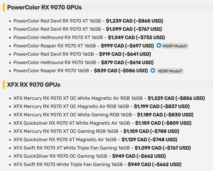 Sprzedawca detaliczny w Kanadzie — Canada Computers & Electronics — jako pierwszy umieścił na stronie listę nadchodzących kart graficzne PowerColor i XFX opartych na architekturze RDNA4 wraz z cenami. Jakiś czas później informacje usunięto, ale w internecie nic nie ginie. Lista została udostępniona na forach AnandTech i przejęta przez Tomasza Gawrońskiego. Na zrzutach ekranu widnieją możliwe przedziały cenowe dla modeli RX 9070 XT i RX 9070. Ceny pokrywają się z niektórymi plotkami, ale jak wcześniej zaznaczyłem, wszystko powinno być jasne dopiero podczas wydarzenia medialnego na koniec miesiąca.