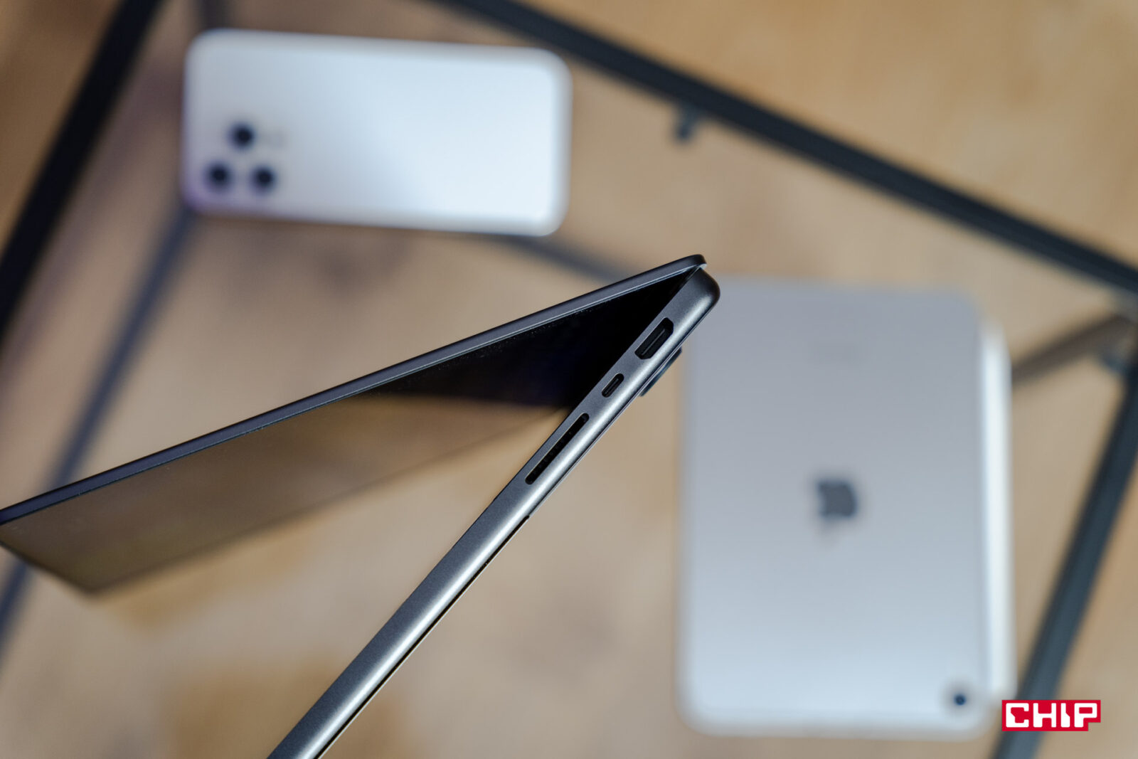 Na notchu znajdziemy także kamerę 12 MP z funkcją Center Stage, która automatycznie dostosowuje kadr, podążając za użytkownikiem i utrzymując go w centrum obrazu podczas wideorozmów. Nowością jest także Widok blatu, pozwalający na jednoczesne pokazywanie twarzy oraz powierzchni biurka. Mówimy tutaj o nagrywaniu w jakości 1080p HD,a dodatkowo znajdziemy tu zaawansowany procesor ISP, wykorzystujący techniki wideografii obliczeniowej. Prawda jednak jest taka, że ta kamera… po prostu jest, ale nadaje się najwyżej do połączeń na Zoomie czy innym Teamsie. Na szczęście można zrobić ze swojego iPhone’a kamerę do MacBooka — i to jedyna sensowna opcja.