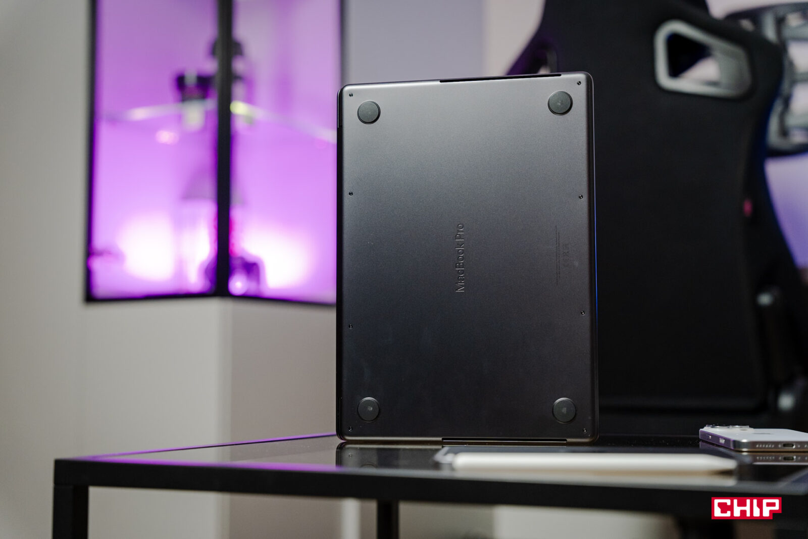Na spodzie laptopa poza napisem „MacBook Pro” znajdziemy cztery gumowe nóżki, które skutecznie zapobiegają jego przesuwaniu się podczas pracy. Niezależnie od blatu Waszego biurka czy podkładki na nim, MacBook nie ma tendencji ślizgania się. No i muszę przyznać, że to jabłko na klapie (chociaż szkoda, że już się nie świeci) do dziś robi na mnie wrażenie. Teraz jest to lustrzane logo i doskonale wiem po swoim prywatnym MacBooku, że z czasem może złapać mniejsze czy większe rysy, chociaż jego powierzchnię i tak uznałbym za odporną. Jego większym mankamentem jest to, że szybko się brudzi.