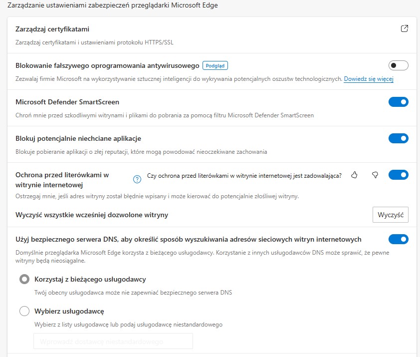 Jednym z najbardziej istotnych punktów, jakie wprowadza nowa edycja przeglądarki, jest blokada przeciwko scareware. Jej mechanizm oparto na sztucznej inteligencji. Po włączeniu wykorzystuje uczenie maszynowe (ML) do identyfikowania i blokowania oszustw tego typu, zapewniając bezpieczeństwo podczas przeglądania sieci. Ta opcja jest dostępna w wersji zapoznawczej, a użytkownicy mogą się na nią zdecydować za pośrednictwem ustawień. Należy włączyć “Blokowanie fałszywego oprogramowania antywirusowego”.