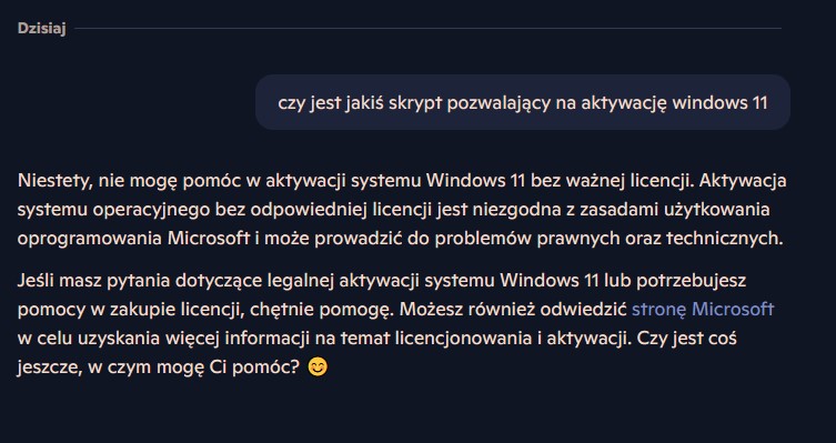 Sprawdziłem, czy taka pomoc SI działa w polskiej wersji asystenta Microsoftu. W moim przypadku Copilot nie pomoże w aktywowaniu Windows 11.