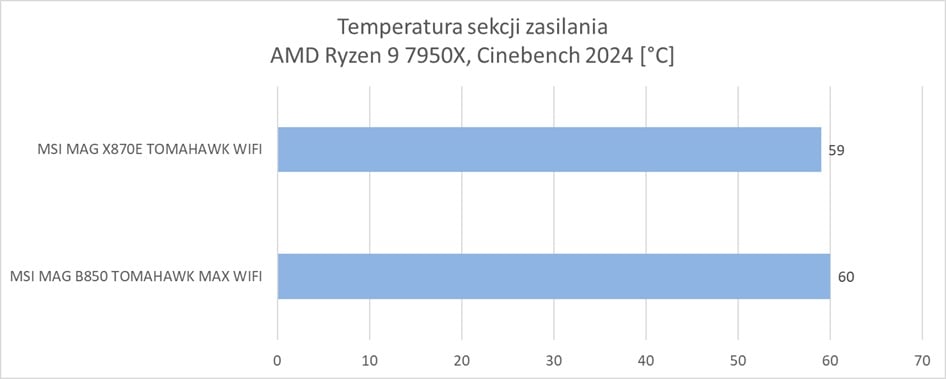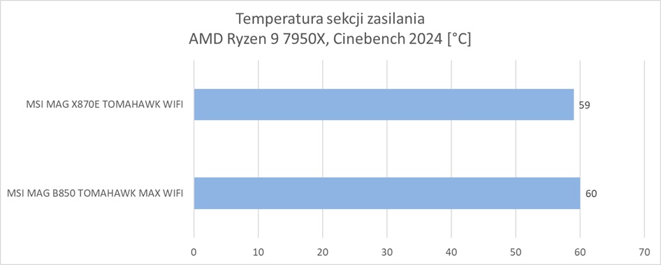 Ważną kwestią jest również sekcja zasilania. Co z tego, że płyta obsłuży dany procesor jak sekcja zacznie się przegrzewać? W przypadku MSI MAG B850 TOMAHAWK MAX WIFI i MSI MAG X870E TOMAHAWK WIFI nie ma o tym mowy. Obie płyty mają sekcje z 14 (VCore, 80 A) + 2 (SOC) + 1 (MISC) fazami zasilania. Chłodzona jest ona przez spore aluminiowe radiatory, a transfer ciepła zapewniają termopady 7 W/mK. Sprawia to, że bez problemów obie konstrukcje poradzą sobie z najmocniejszymi konstrukcjami, w tym 7950X czy 9950X – również po ich podkręceniu.