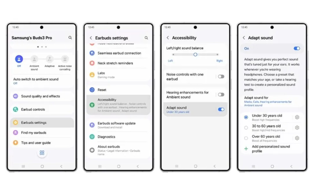 Posiadaczom Galaxy Buds 3 Pro Samsung udostępnia jeszcze funkcję „Adapt Sound”. Po przetestowaniu słuchu, w oparciu o wyniki, stworzy ona niestandardowy profil, specjalnie dostrojony do ich uszy. Można pominąć ten test i posłużyć się przedziałem wiekowym, a funkcja dostosuje ustawienia pod użytkowników poniżej 30 roku życia, mieszczących się w przedziale 30-60 lat lub tych starszych. Oczywiście będzie on mniej dopasowany do nas, ale to już zależy, na co się zdecydujemy.