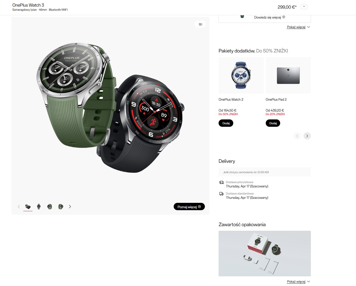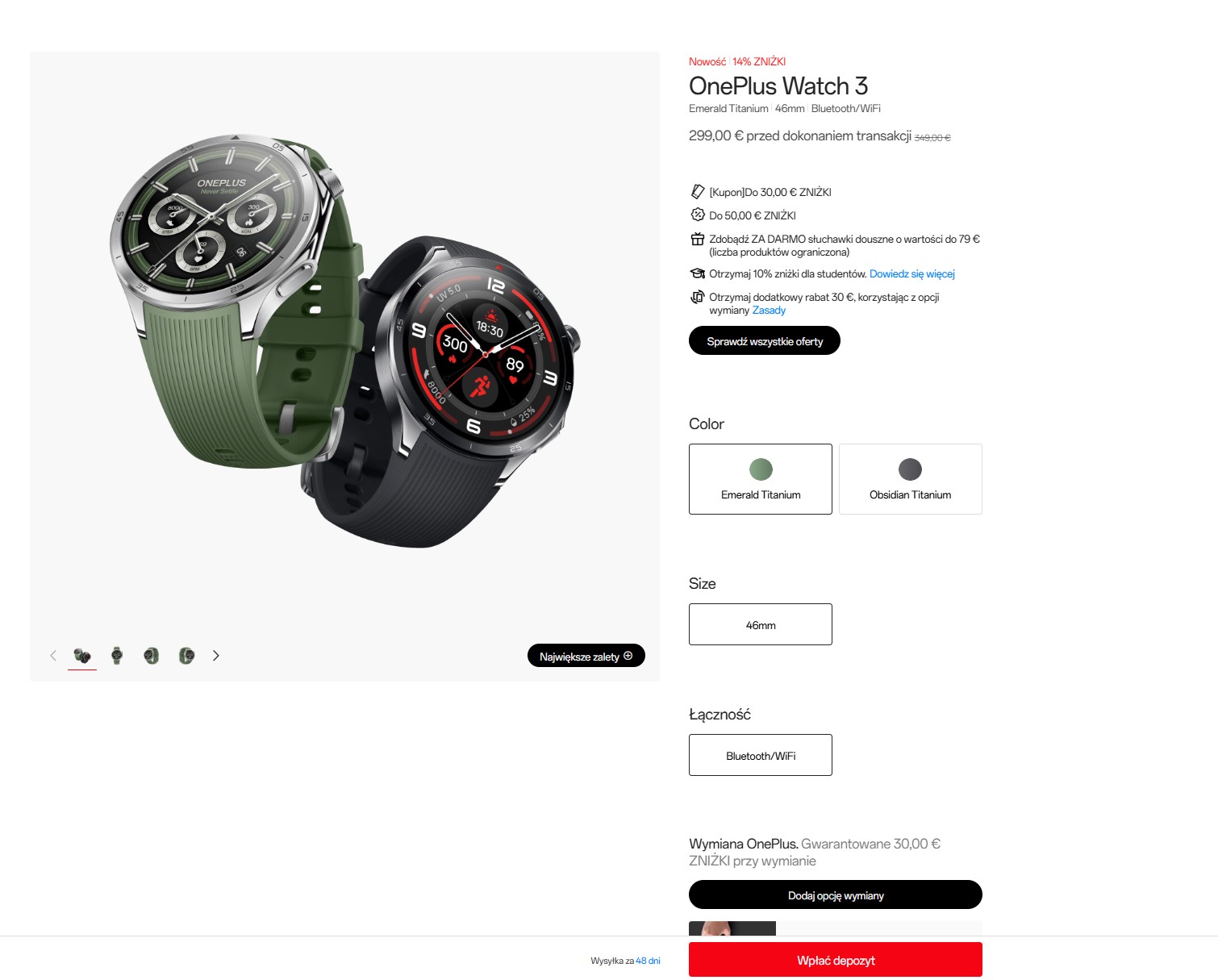 Jeśli dopiero nosiliście się z zamiarem zakupu, musicie mieć na uwadze duże opóźnienie w dostawie. Na stronie producenta informacja o tym, kiedy przewidywane są dostawy, znajduje się na samym dole, przy czerwonym przycisku z napisem „Wpłać depozyt”. W chwili pisania tego artykułu jest oznaczone, że wysyłka rozpocznie się za 48 dni. Na szczęście OnePlus Watch 3 wciąż dostępny jest z rabatem, a dodatkowo można otrzymać w gratisie słuchawki OnePlus Nord Buds 3 Pro za darmo, więc jeśli się wam nie spieszy, możecie zakupić go już teraz. Pamiętajcie tylko, że na wysyłkę trochę poczekacie.