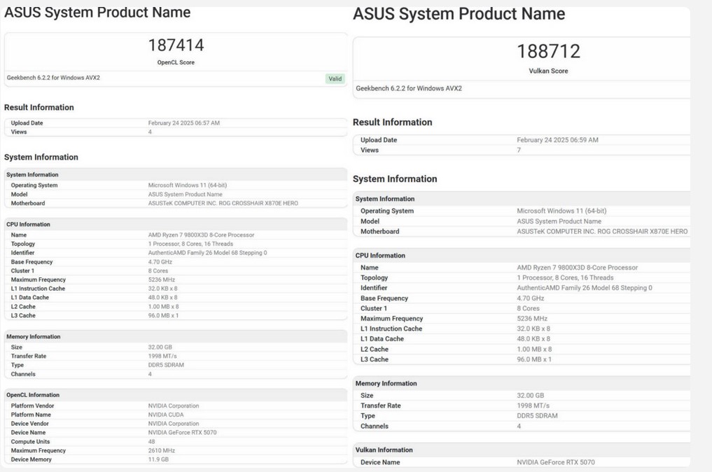 GeForce RTX 5070 została przetestowana na systemie 9800X3D/X870E przy pamięci osiągającej 4000 MT/s. Aczkolwiek taka szybkość to prawdopodobnie błąd zapisu lub specyfikacji. Karta przeszła testy Vulkan oraz OpenCL, gdzie uzyskała odpowiednio 188 712 i 187 414 punktów. W porównaniu do modelu z “Ti” w nazwie – to bardzo słabo. RTX 5070 Ti miał w tych samych benchmarkach 236 850 i 240 750 punków, a więc nowa karta graficzna jest wydajna o ponad 20%!