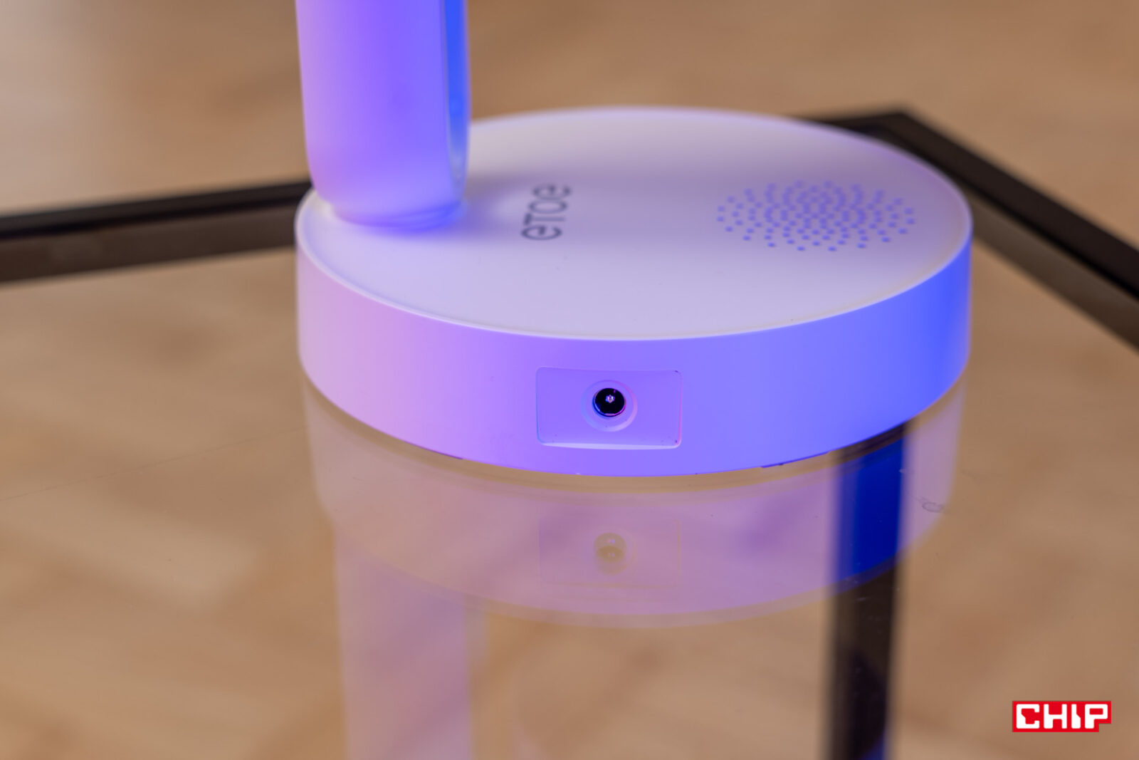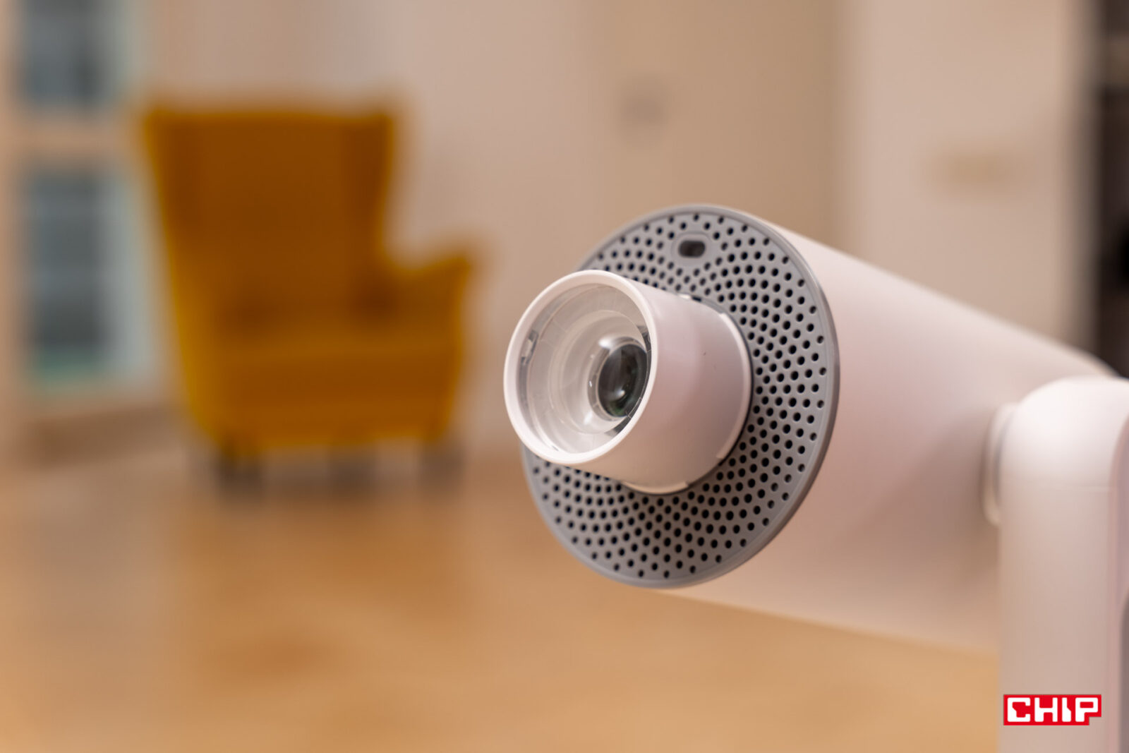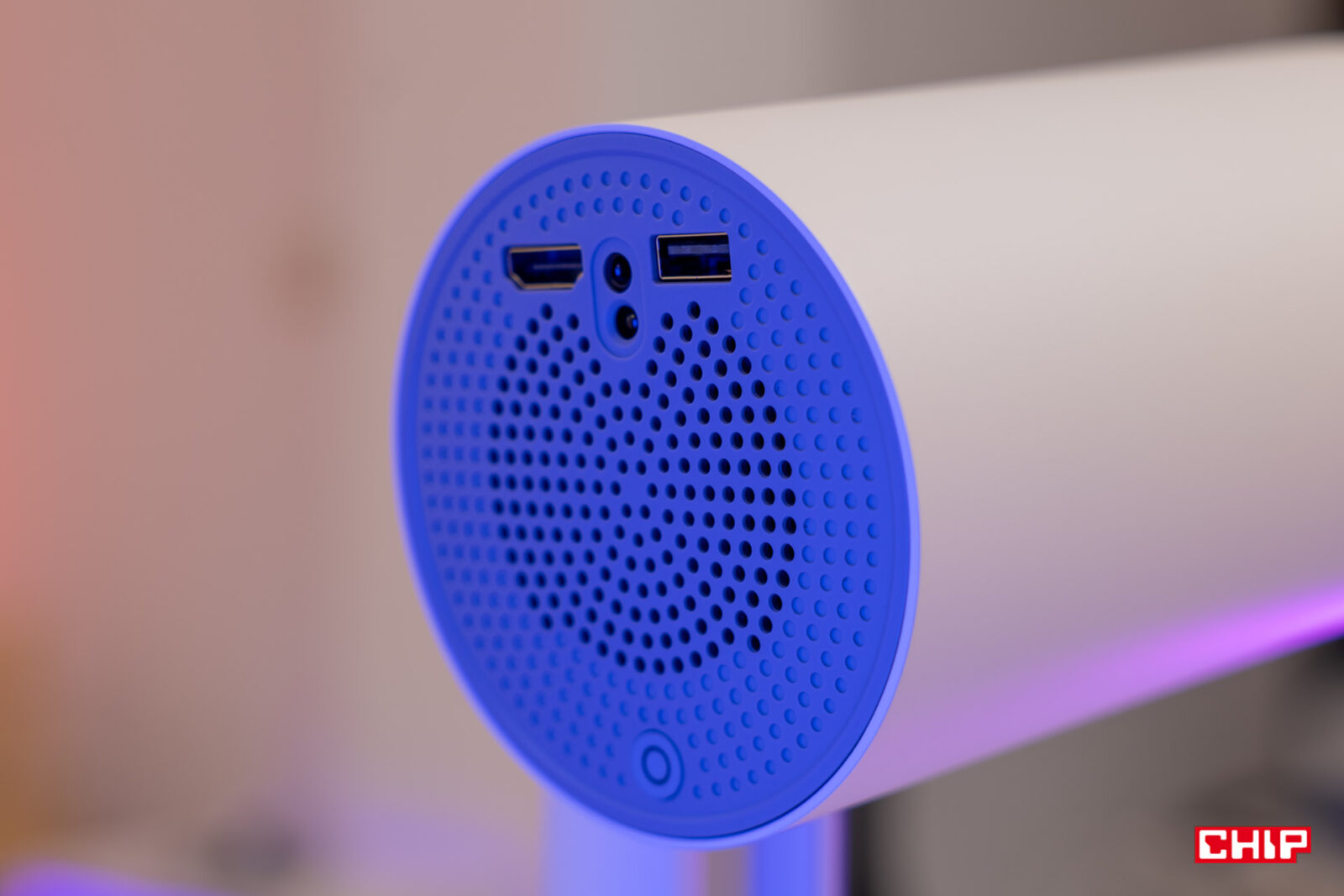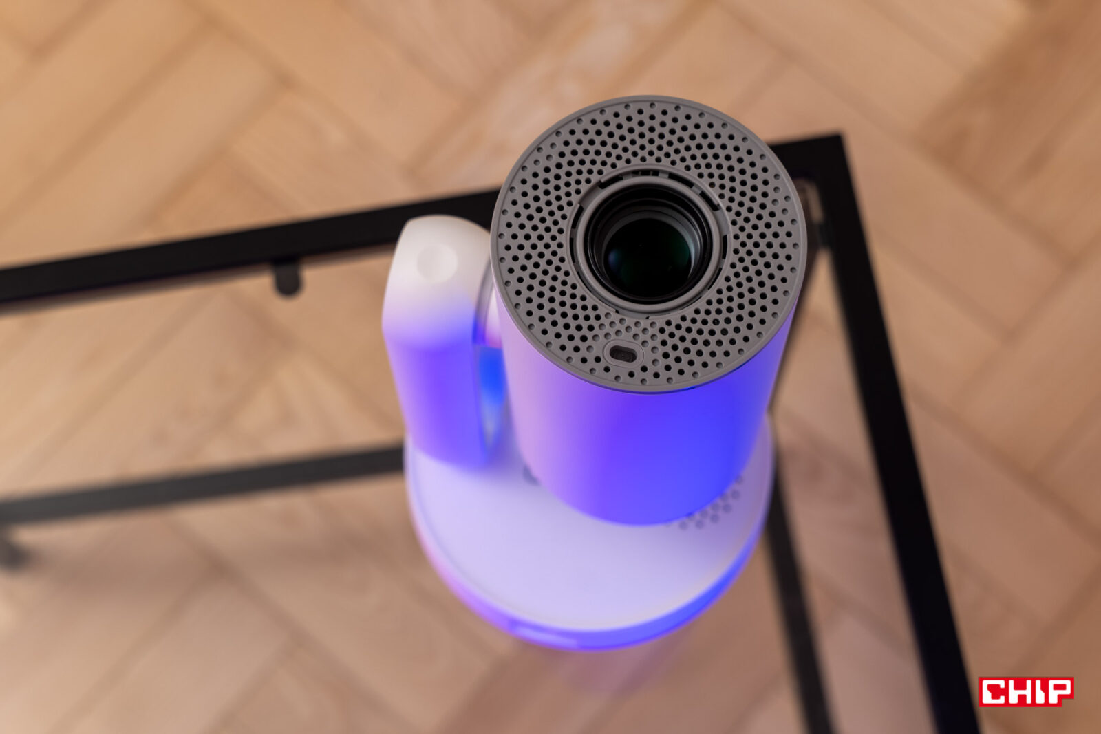 Podstawa na bazie okręgu mieści w sobie złącze zasilania na zewnętrznej bocznej ściance oraz logo i maskownicę głośnika na frontalnej części. Na dole są za to gumy antypoślizgowe i te trzymają projektor w ryzach. Trzeba go mocno uderzyć, by ten się przesunął. Szkoda, że złącze zasilania to standardowe DC-in, a nie USB-C, więc lepiej pilnować białą kostkę. Producent mógł też pokusić się o nieco dłuższy kabel, ale ten w zestawie jest solidny. I to mogę powiedzieć o całości tej niecodziennej konstrukcji.
