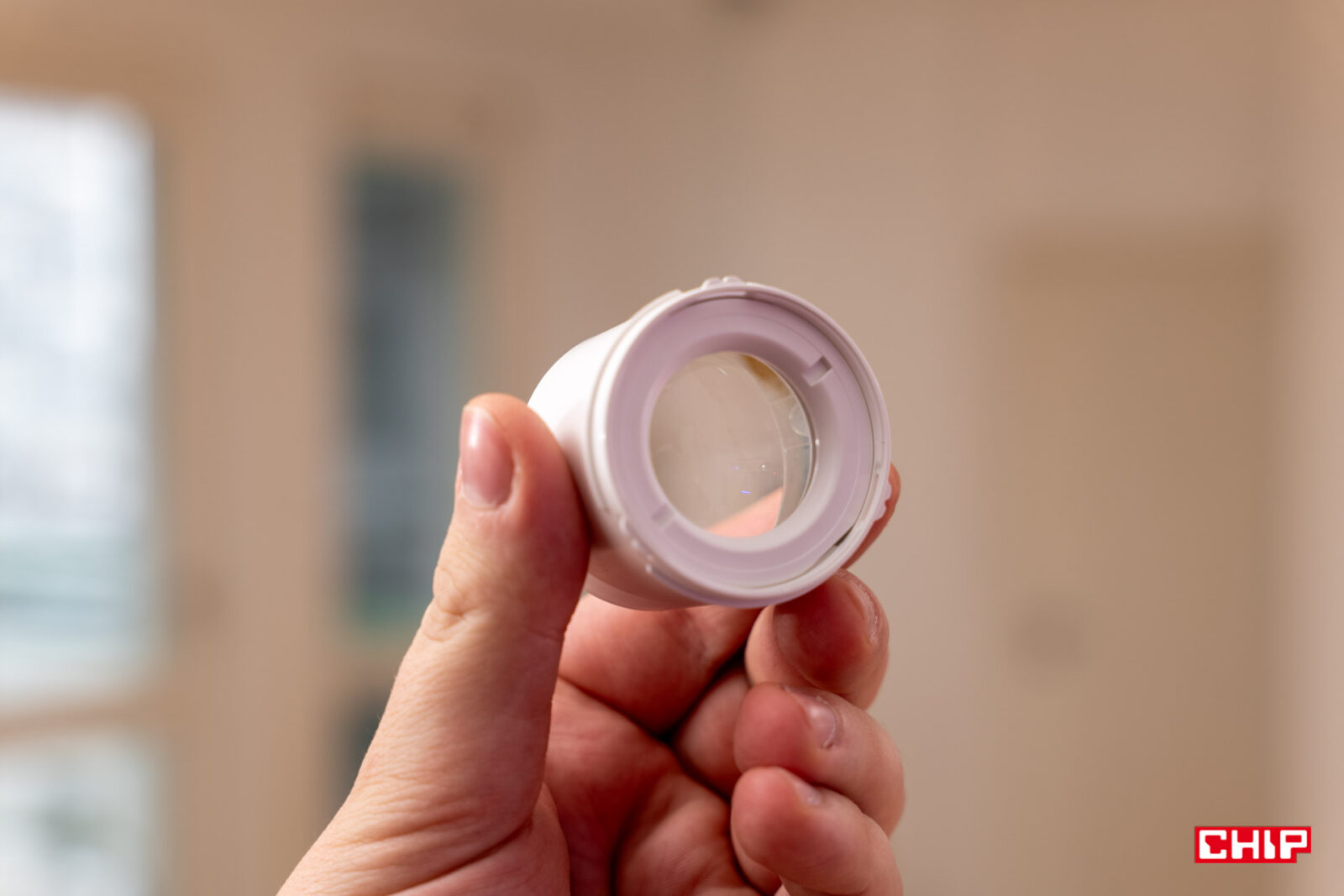 Druga funkcjonalność wiąże się z soczewką dokręcaną do projektora. Jej zadaniem jest zapewnić szerszy obraz po to, by zagwarantować coś na wzór gwiezdnego nieba. Prawda jest jednak taka, że to fish eye rozszerzający i zniekształcający do tego celu obraz mniej więcej o 1/3. W żadnym wypadku nie daje to olśniewających efektów, a grafiki ze strony producenta wyjątkowo wiernie odwzorowały ten element. To jednak nie komplement. Po prostu nie do końca widzę sens, by dla takich dodatków kupować ETOE Starfish.