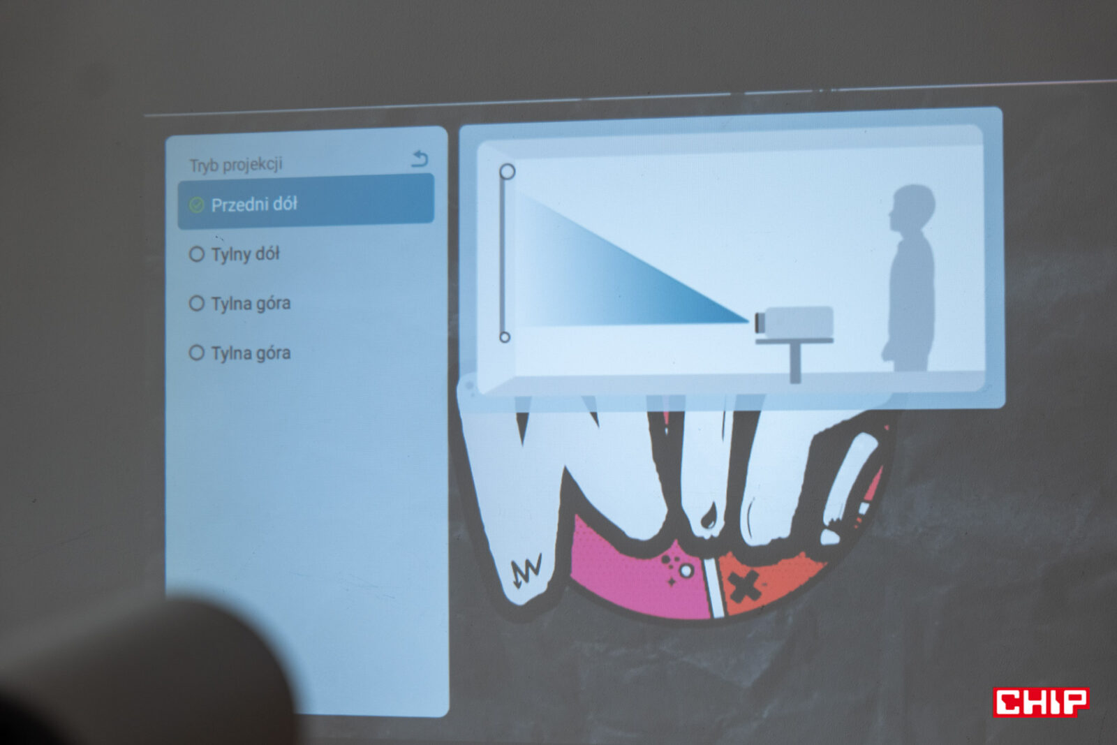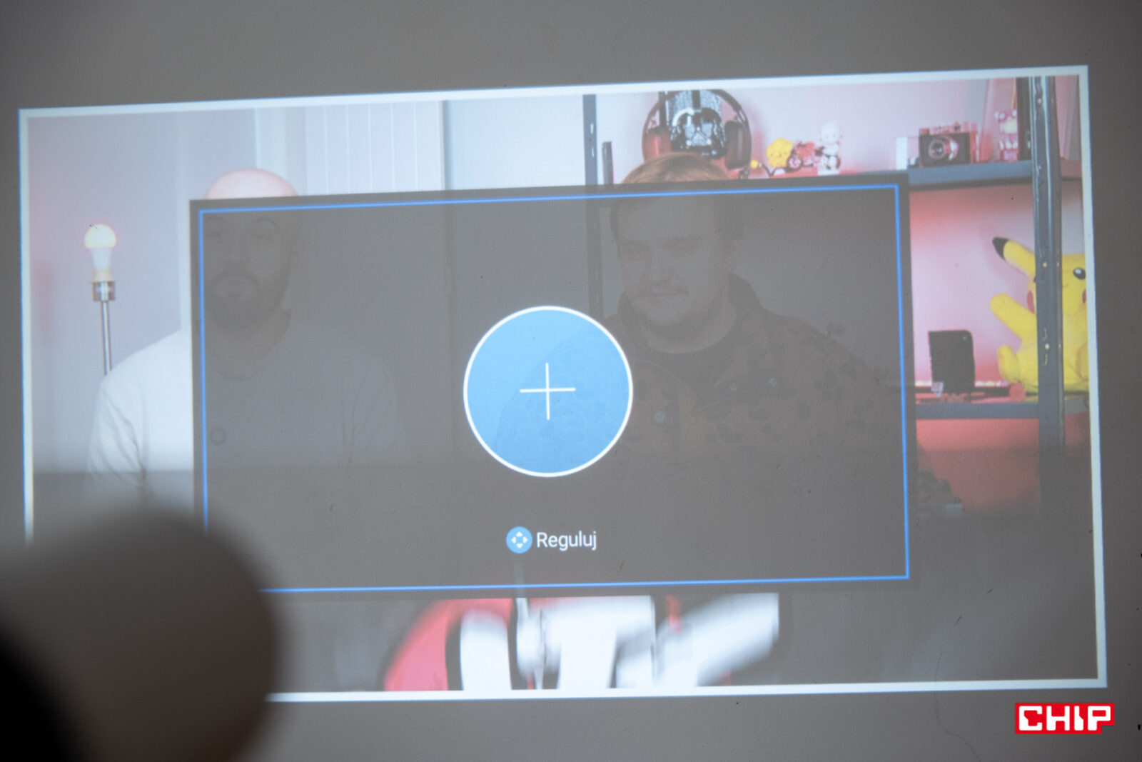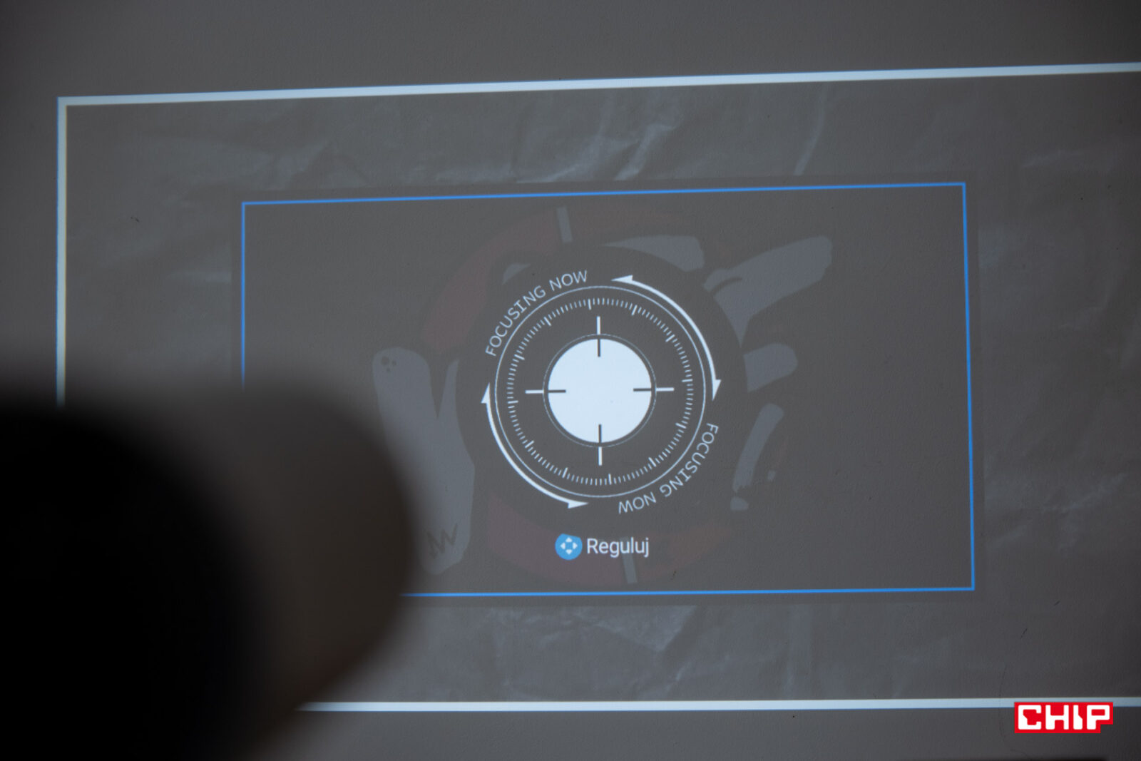 Bardzo dobrze spisuje się tu korekcja trapezowa wyświetlanych treści. Rozwiązanie niemal błyskawicznie reaguje, czy to na przesunięcie projektora, czy też zmianę kąta. Miałem wrażenie, że gdy testowałem Asusa ZenBeam L2, to zmiany zachodziły szybko, jednak tutaj dzieje się to ekspresowo. Szkoda tylko, że automatyczna regulacja ostrości wyświetla nam biały ekran z symbolami – to dość mocno daje się we znaki, gdy projektor jest jedynym źródłem światła. Oprogramowanie ma zatem dobre podstawy i liczę, że w przyszłości poprawki doprowadzą je do perfekcji.